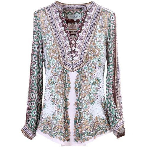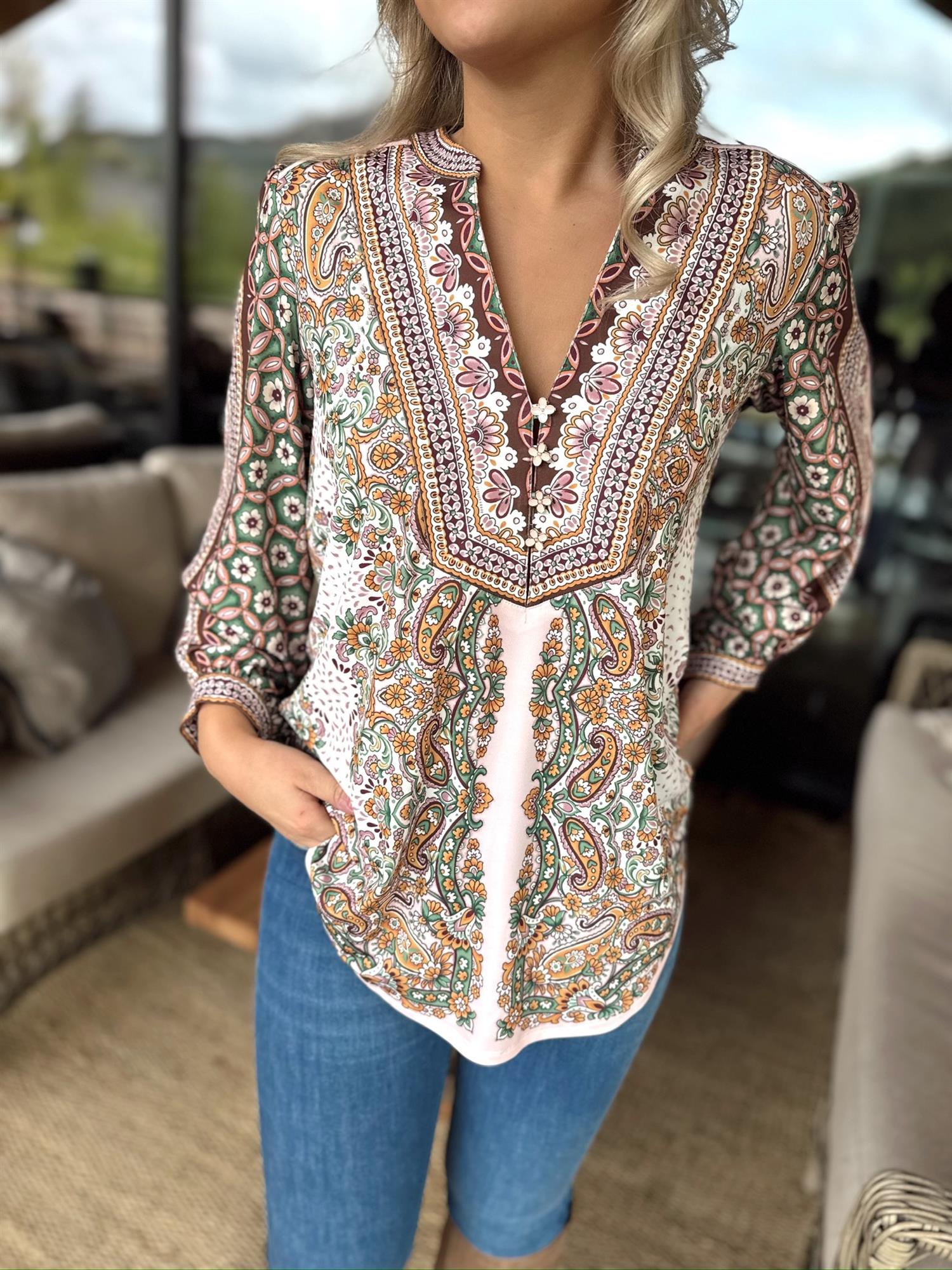 Enkel og anvendelig topp i myk, matt jersey med behagelig stretch. Designet har knapper foran ved bærestykket, 3/4-lange ermer med mansjett og en avrundet kant nederst. Lengde til hoften – flatterende både løst og oppi buksen.