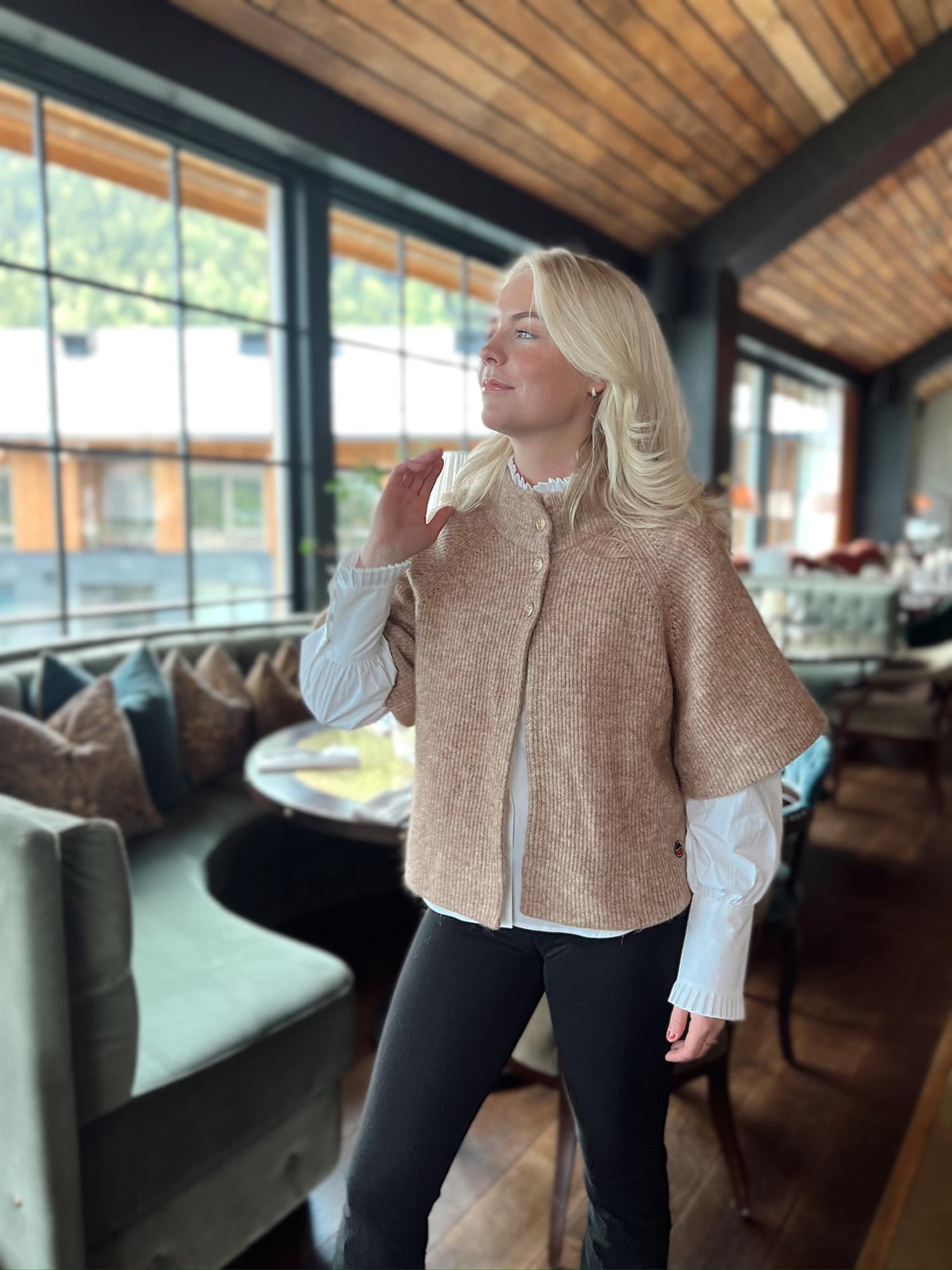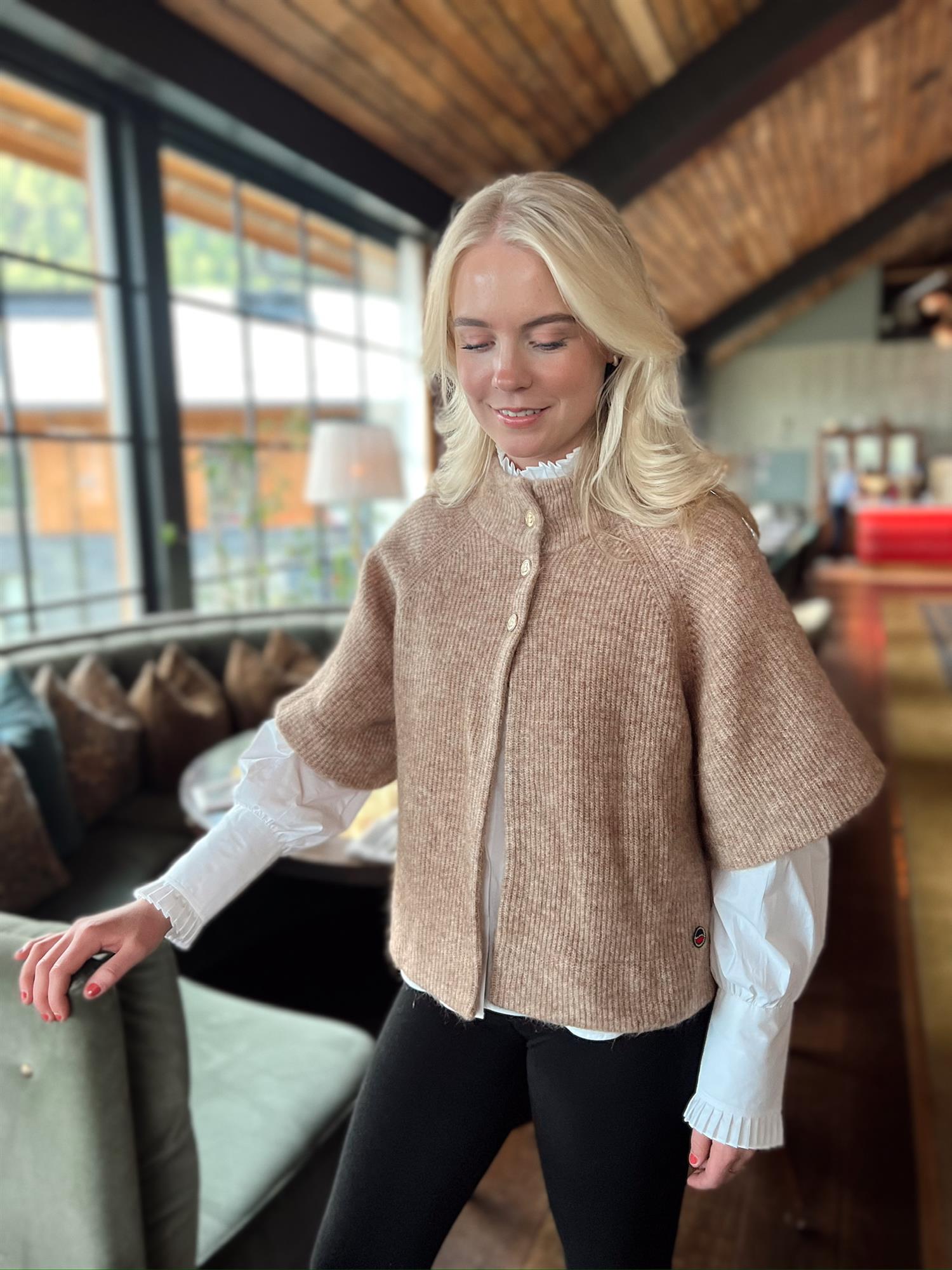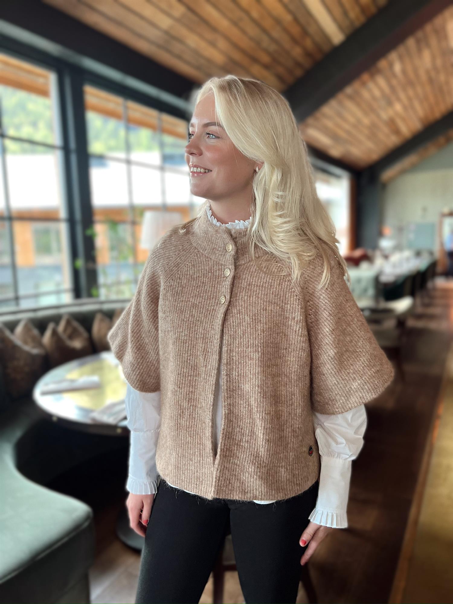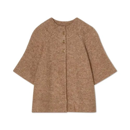 Vilanie Cardigan fra Busnel er en feminin og elegant cardigan med løs passform, korte raglanermer og en ribbestrikket, høy hals. Den har tre dekorative B-knapper og et fint hulmønster ved skuldrene.