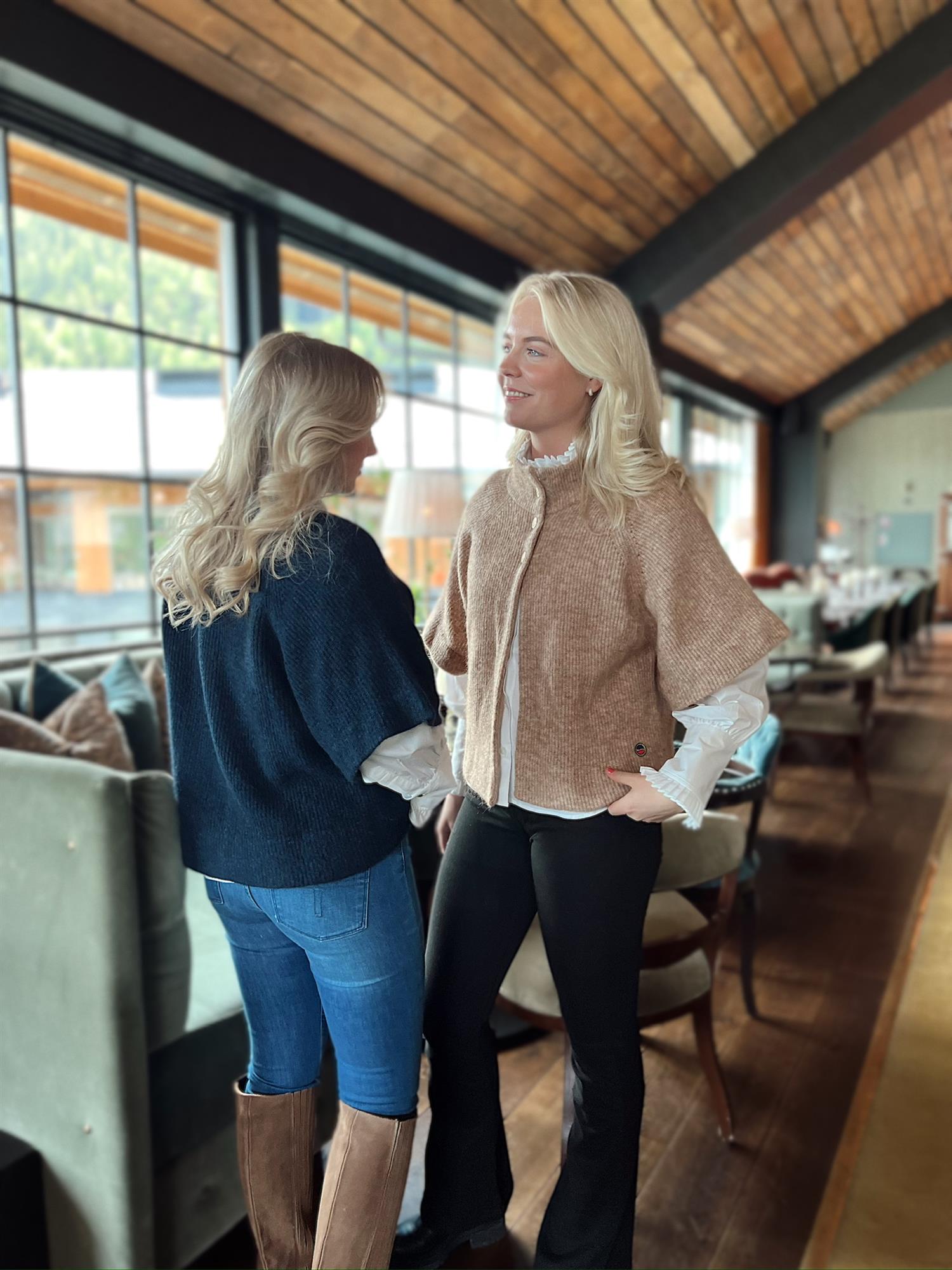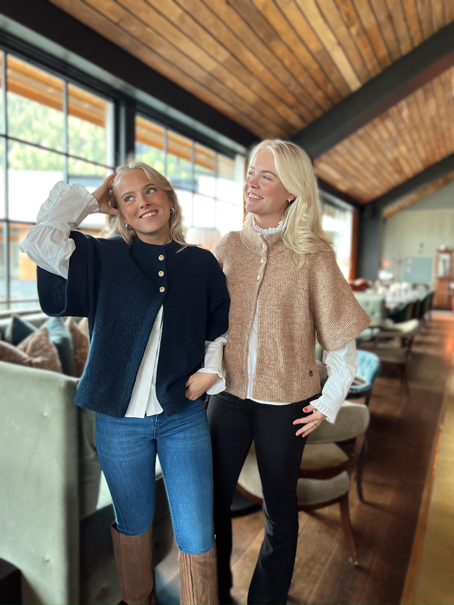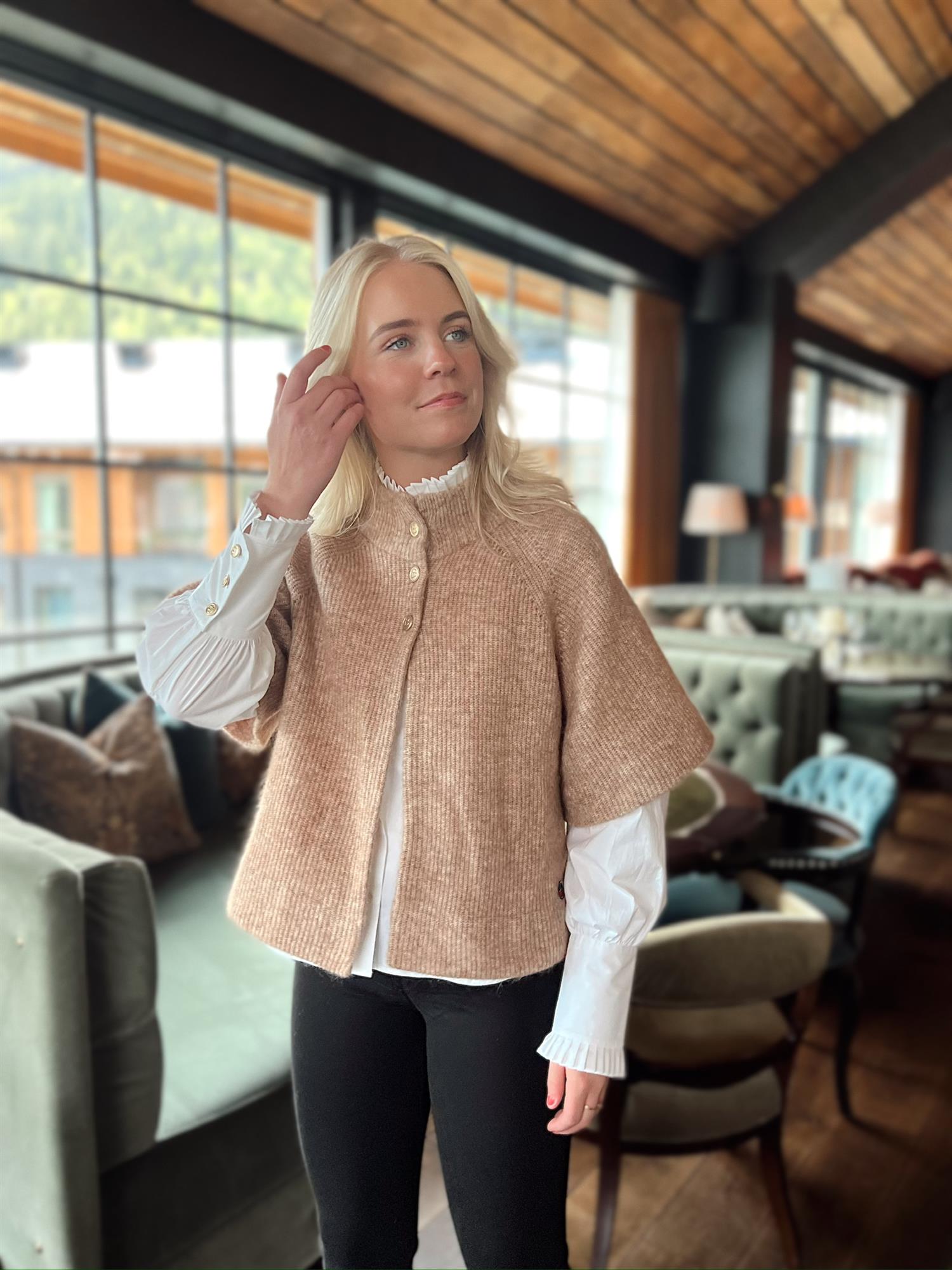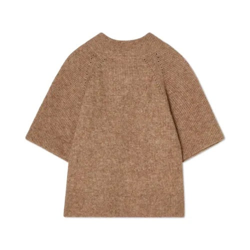 Vilanie Cardigan fra Busnel er en feminin og elegant cardigan med løs passform, korte raglanermer og en ribbestrikket, høy hals. Den har tre dekorative B-knapper og et fint hulmønster ved skuldrene.