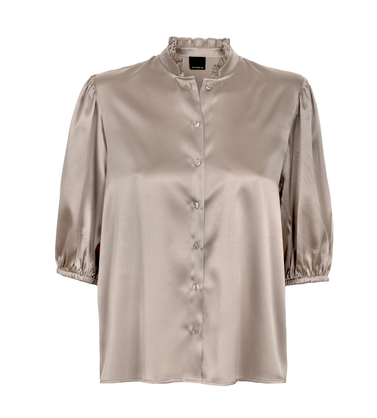 Denne fine blusen fra Ane Mone har en myk, blank finish og en liten rysjekant i halsen. Den har en rett passform, lette puffede ermer og knepping foran. En nøytral farge som passer til både bukser, skjørt og jeans — like fin til hverdag som til fest.