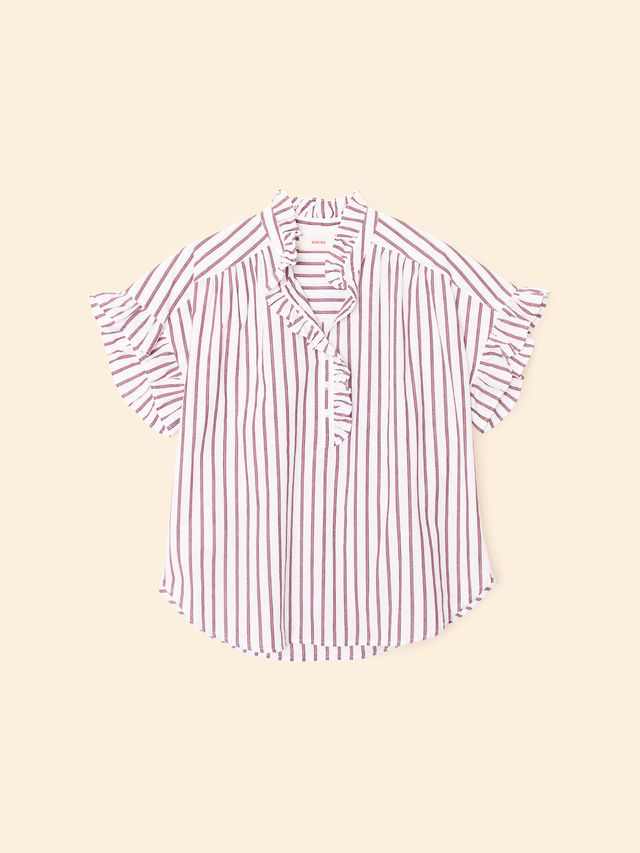 Brie Top fra Xirena er en avslappet og feminin bluse laget i myk og luftig bomull. Med sitt lette stripemønster, delikate volangkanter og flatterende v-hals med rysjer, gir den et avslappet, men gjennomført uttrykk. De korte ermene med volangdetaljer gir plagget en leken og sommerlig følelse. Perfekt til både jeans og shorts – denne toppen blir garantert en favoritt i garderoben sesong etter sesong.