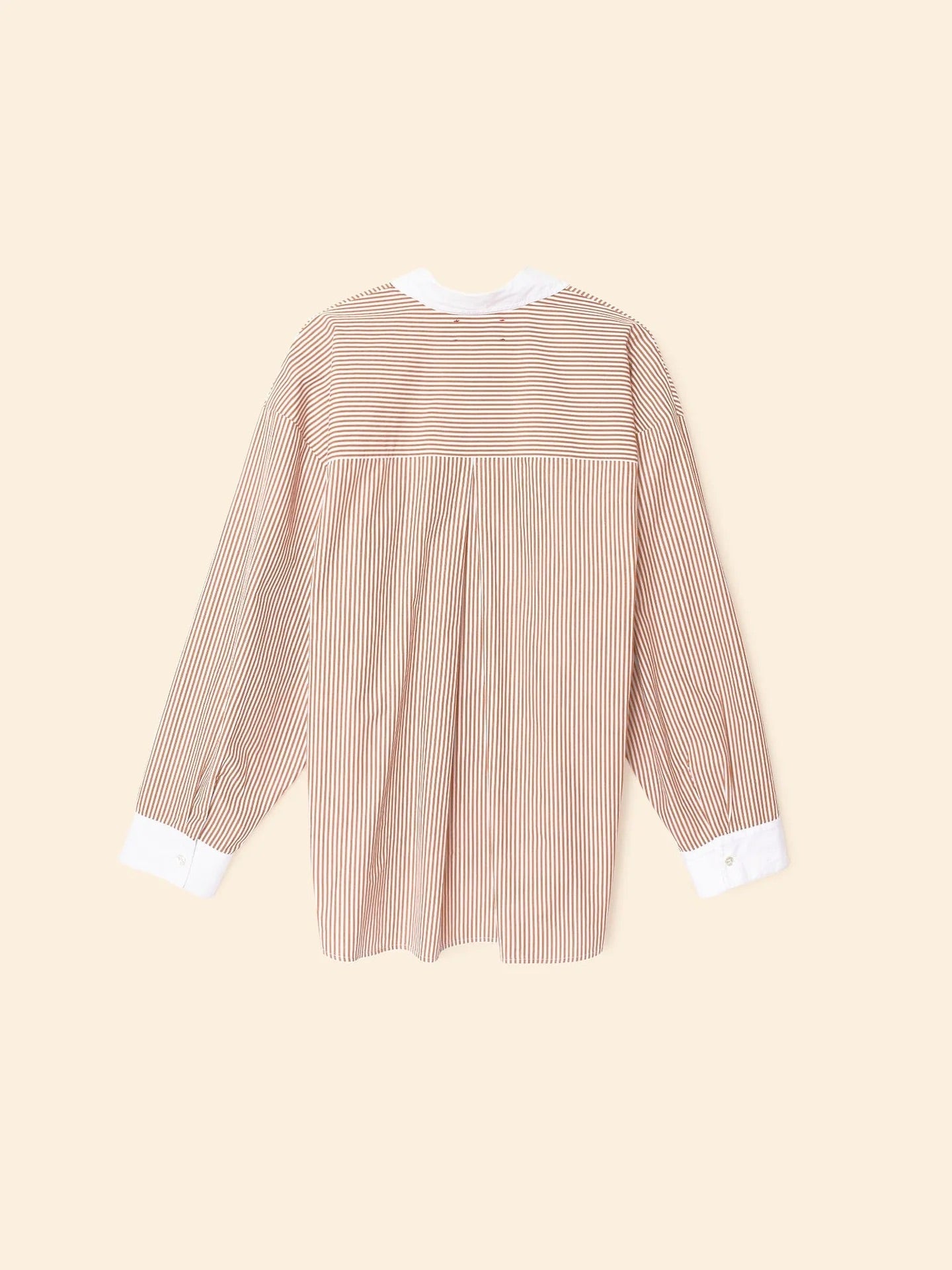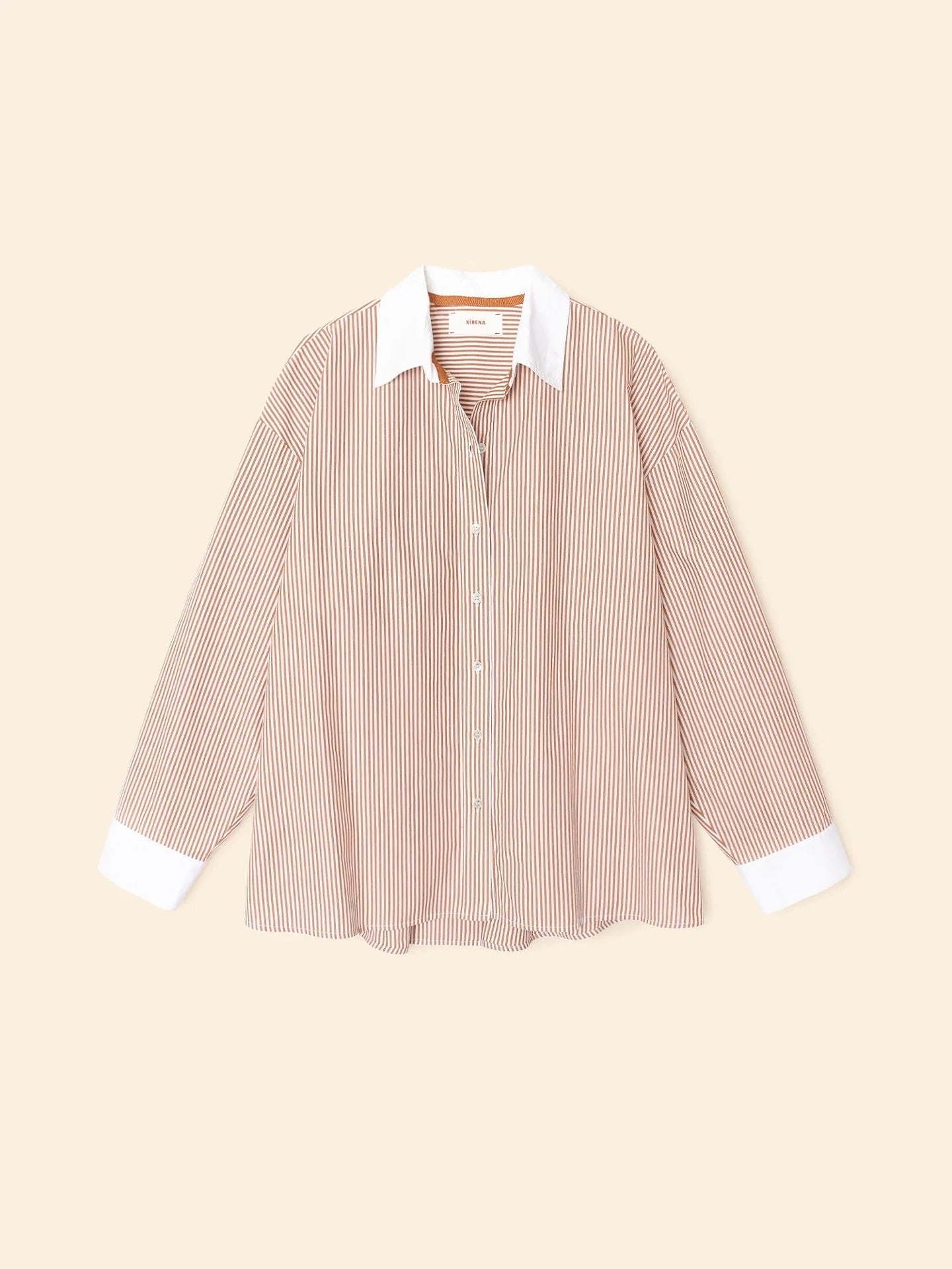True Blue James Shirt fra Xirena er en avslappet og stilren skjorte i myk, strukturert bomull. Skjorten har knappestolpe, kontrastkrage og mansjetter, høy-lav kant med sidesplitter, og et bakstykke med innsvingt legg som gir et elegant og moderne uttrykk.