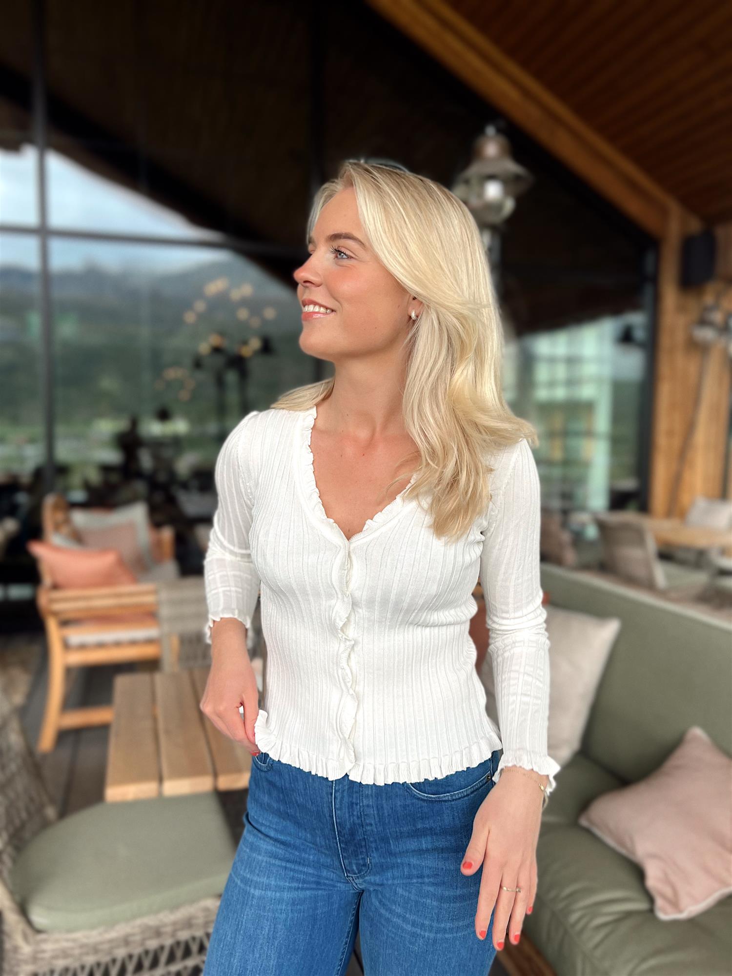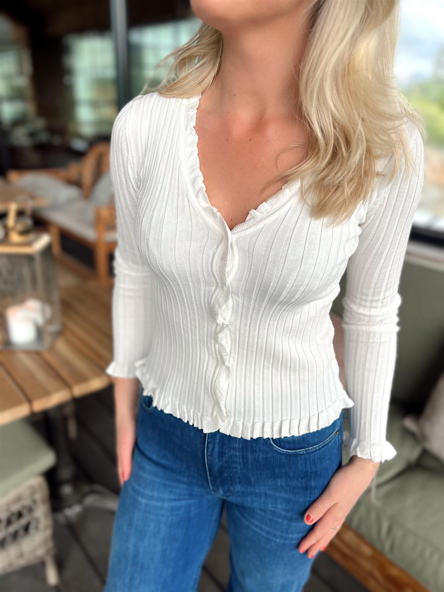 Fabian Cardigan er en feminin og figurnær t-skjorte i myk ribbestrikk. Den har en flatterende V-hals med skjult knappelukking foran, og delikate volanger ved mansjettene som gir et romantisk preg. Perfekt alene eller under en blazer for et mer pyntet uttrykk.