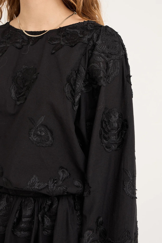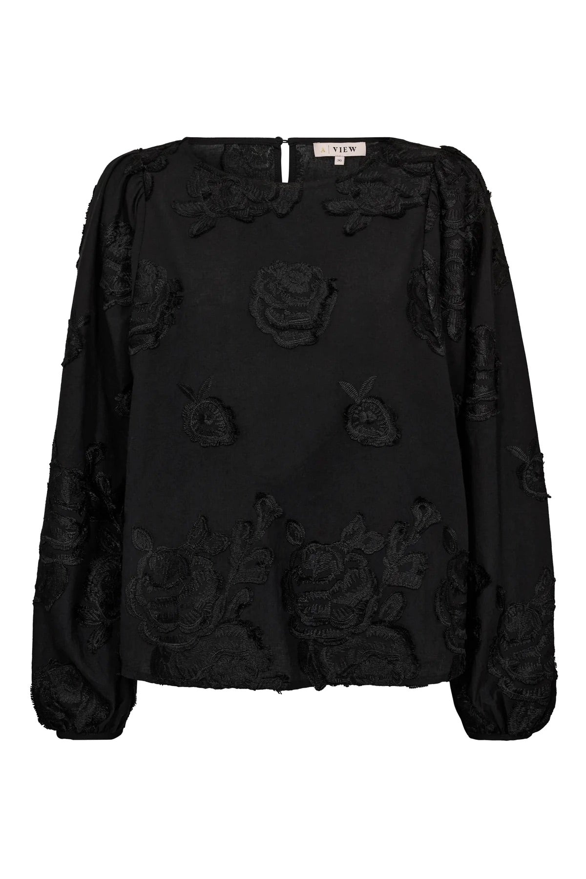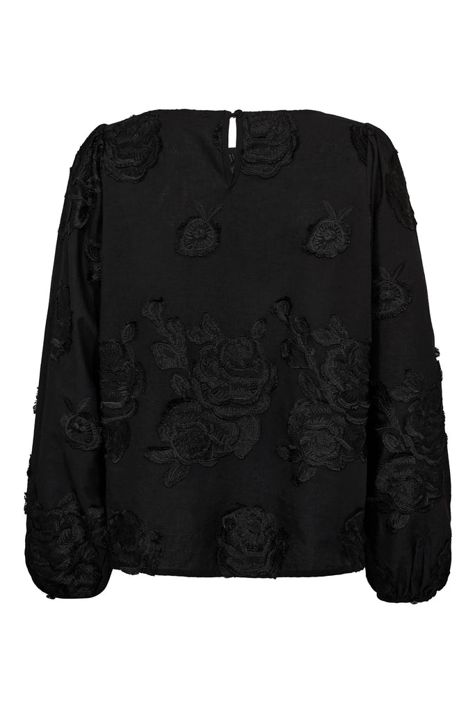 Rosamarie Blouse er en bluse med fint blomsterbroderi, rund hals og lange ærmer. Den lukkes i nakken med en liten knapp og har en løs og behagelig passform.