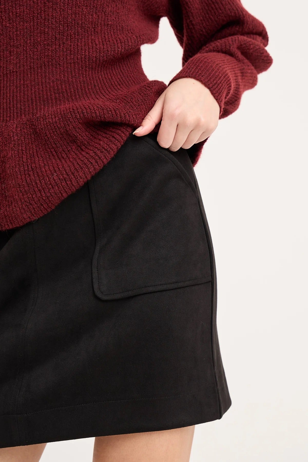 Tanni Skirt er et A-formet skjørt i myk semsket skinnimitasjon med to store frontlommer for et stilrent, men praktisk uttrykk. Skjørtet har glidelåslukking bak og en normal passform.