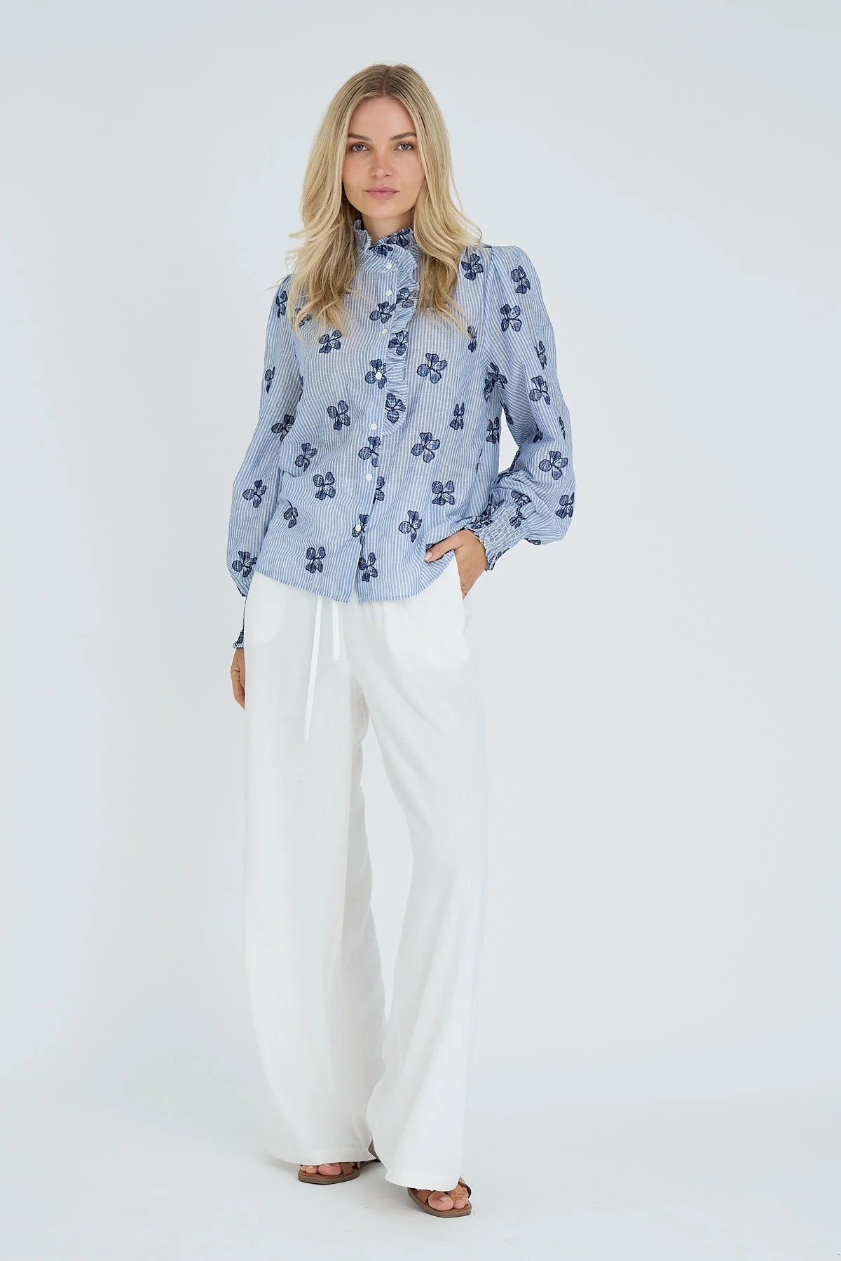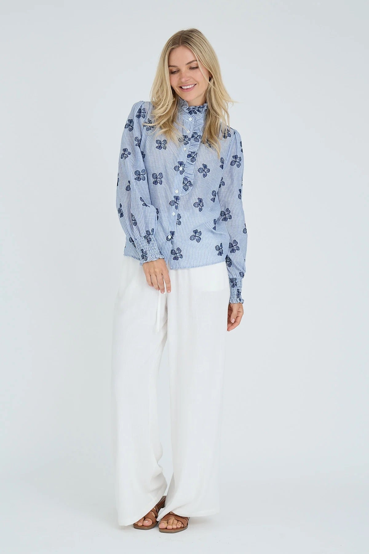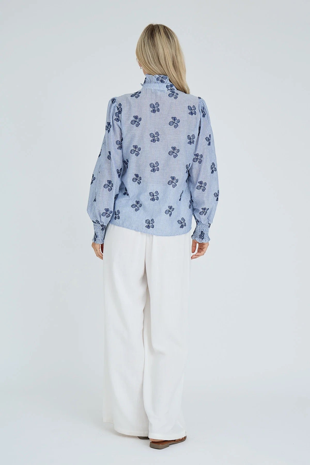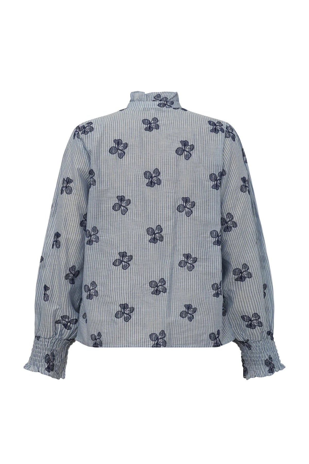 Clova Shirt er en løstsittende, langermet skjorte med et elegant blomsterprint, høy volangkrage og volangdetalj i front. Skjorten har smockdetaljer på ermene og lukkes i front med knappelukking.
