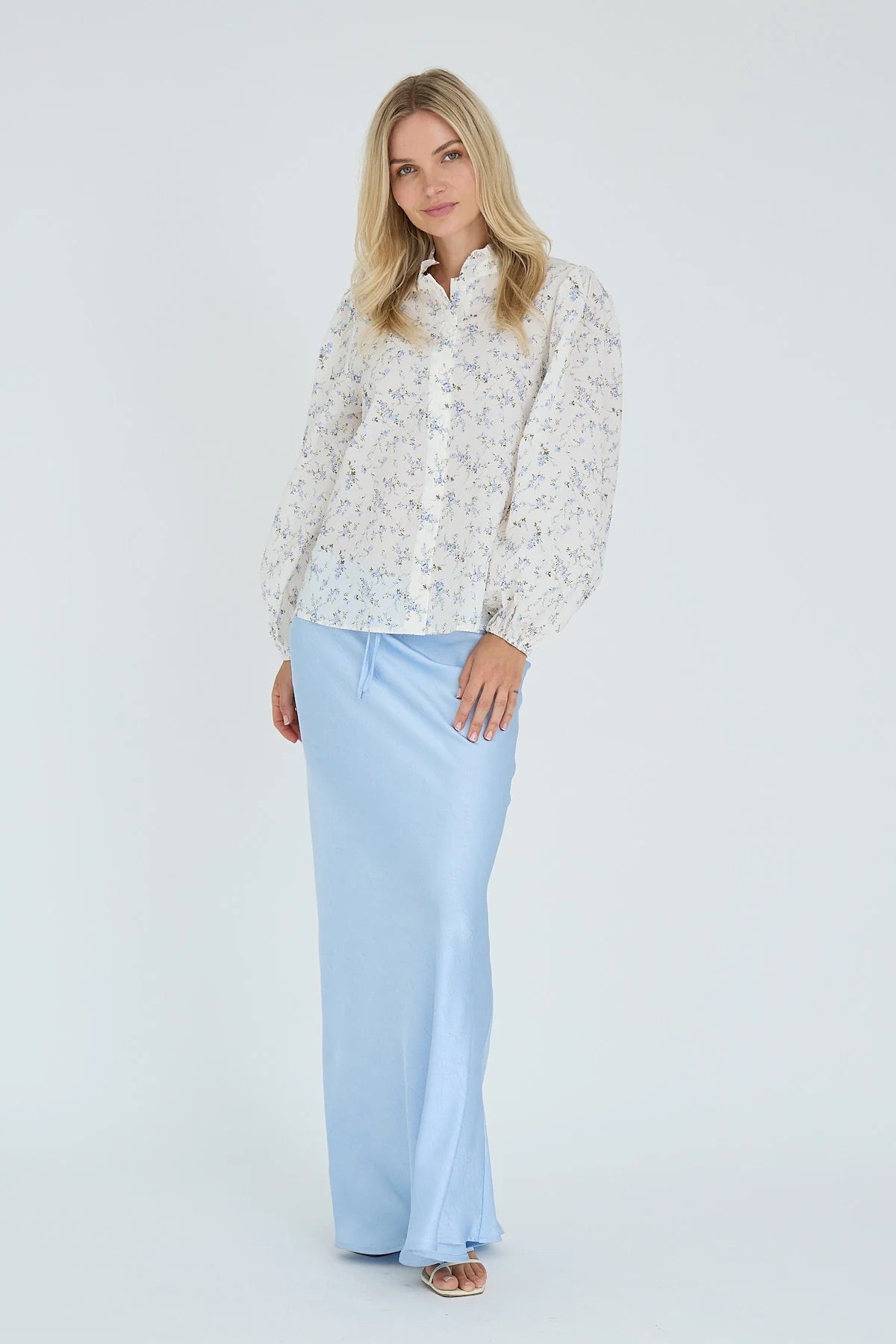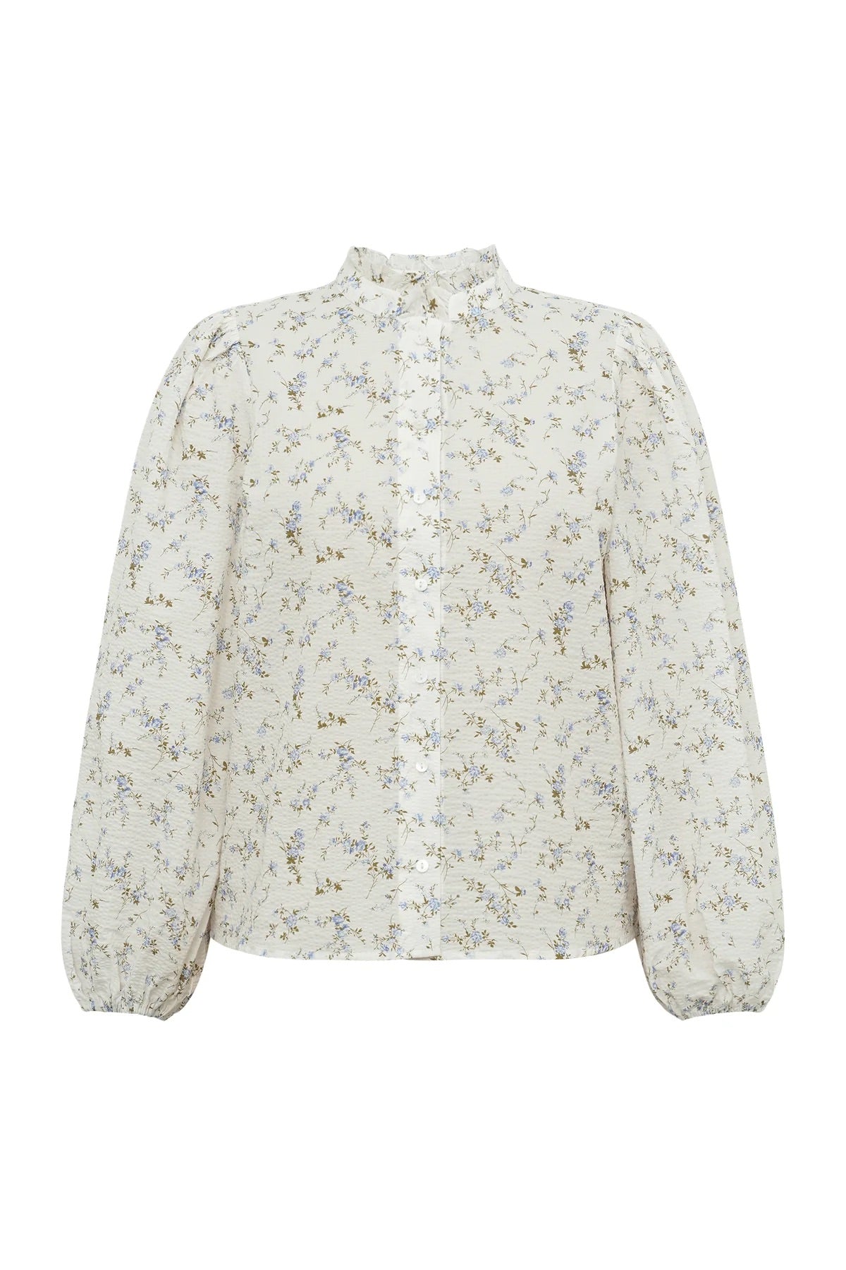 Tiffany New Shirt er en løstsittende, langermet skjorte med et elegant blomsterprint og høy krage med volanger. Skjorten har lett ballongermer og lukkes i front med knappelukking.