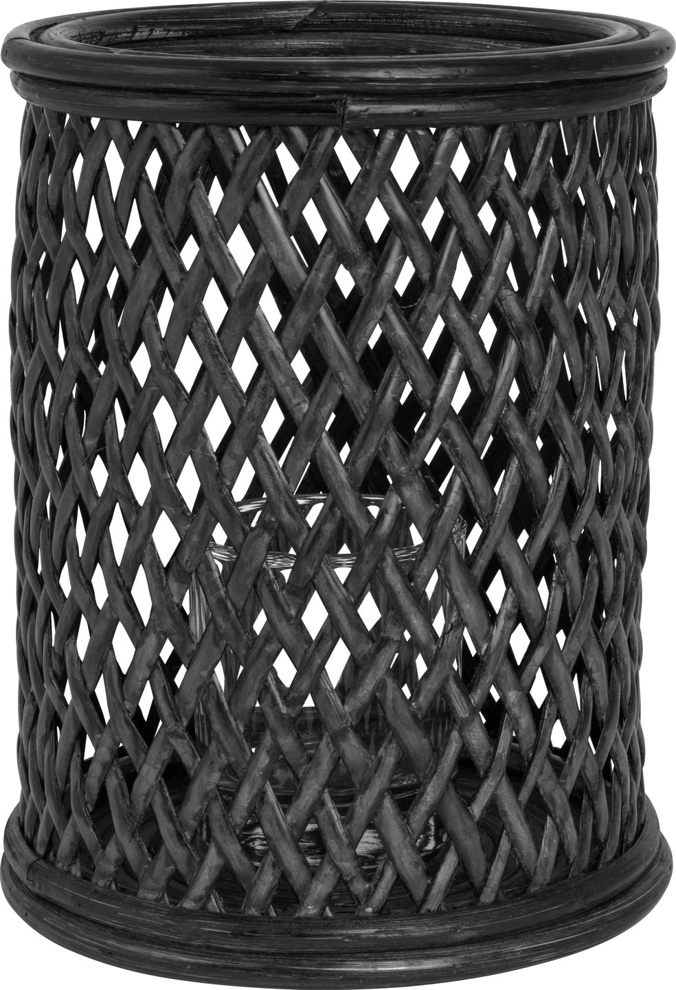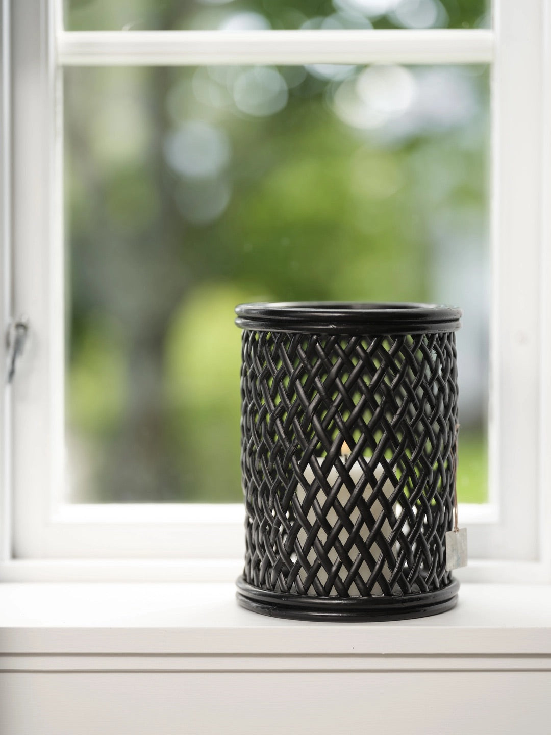 Denne vakre lyslykten i svart rattan tilfører interiøret et lunt og rustikt preg. Det dekorative flettemønsteret skaper en myk og innbydende stemning, og den lette, håndverksinspirerte finishen gir lykten et naturlig og tidløst uttrykk.