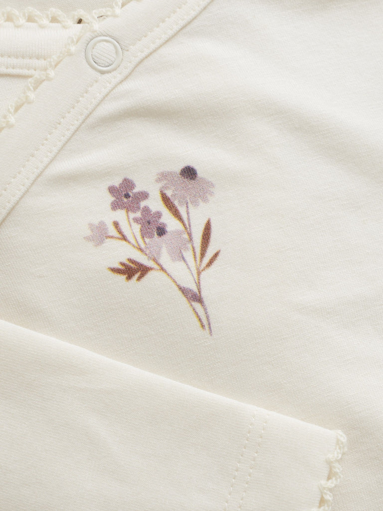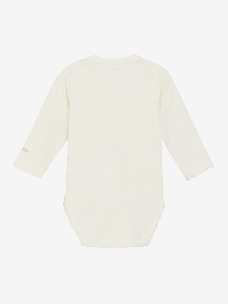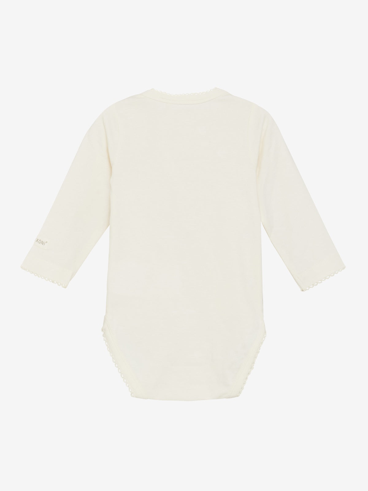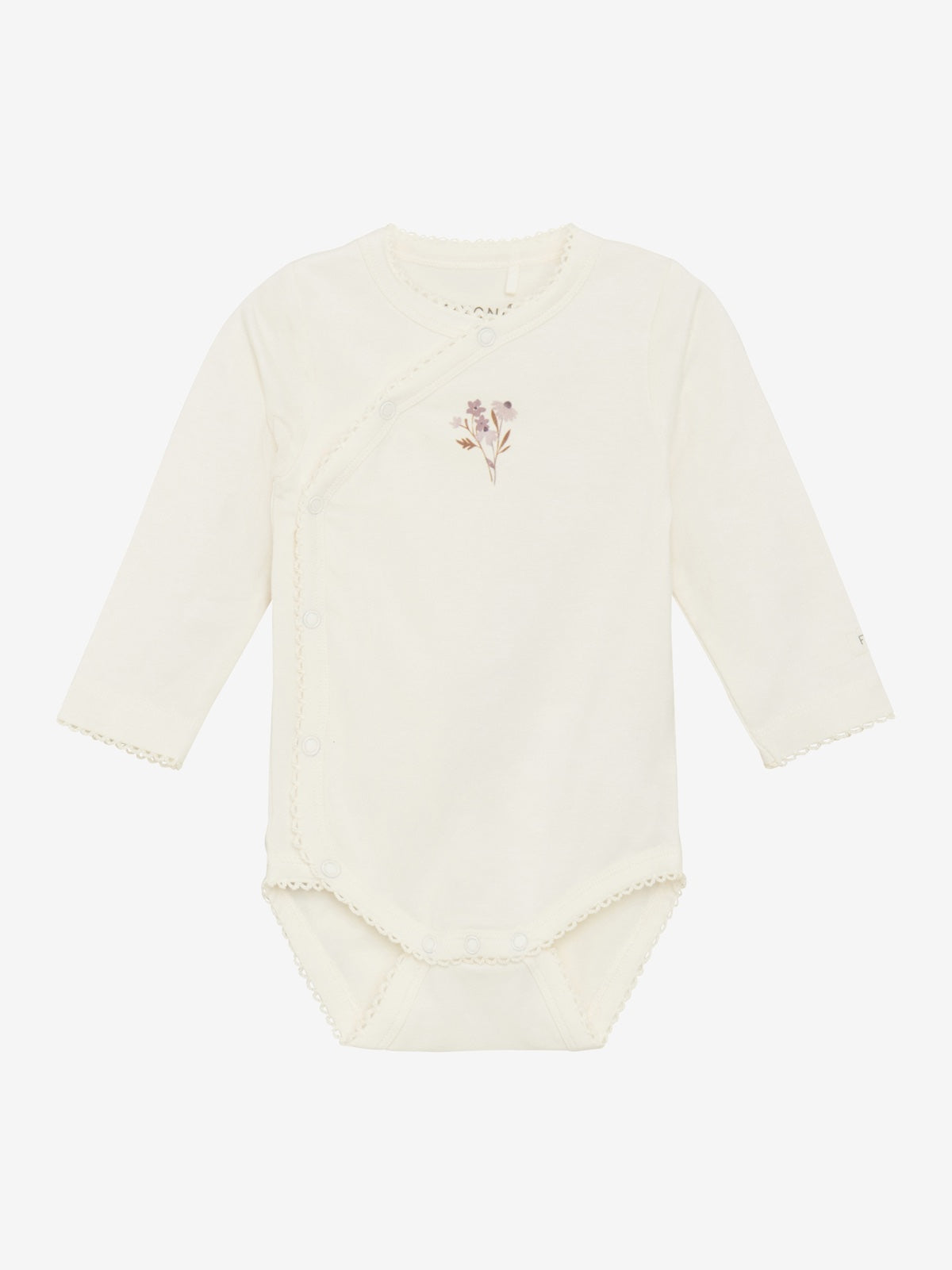 Langermet omslagsbody fra FIXONI. Bodien har et søtt trykk foran og åpnes med praktiske trykknapper foran og mellom bena, slik at den er enkel å ta på og av.