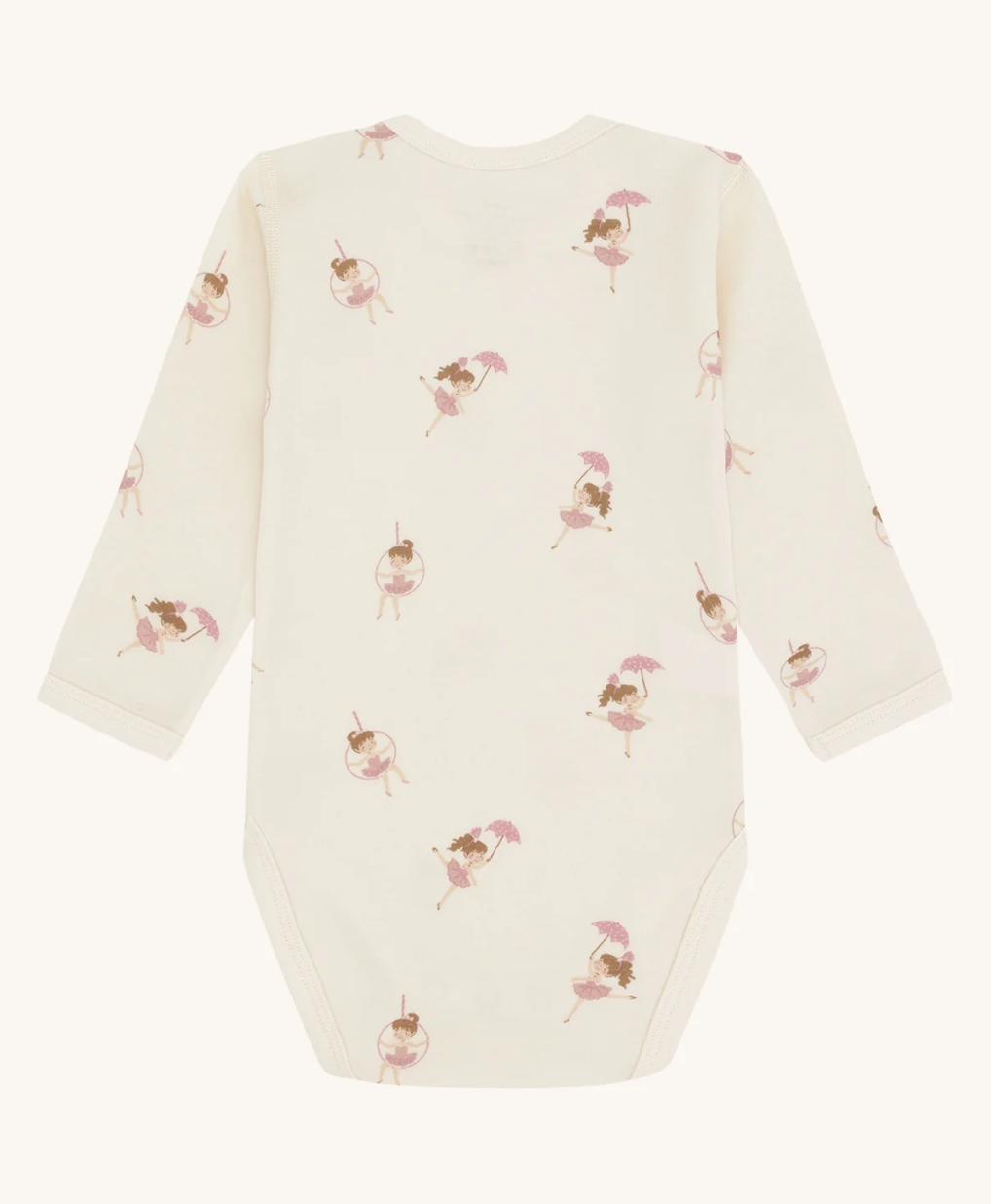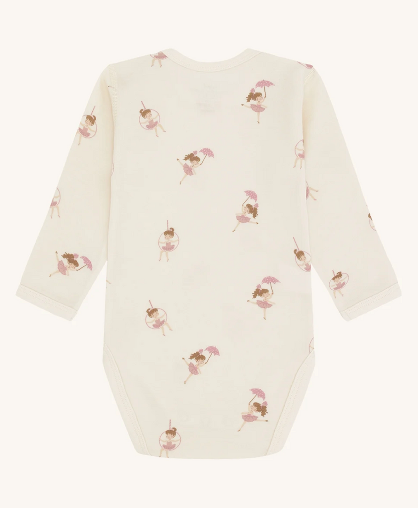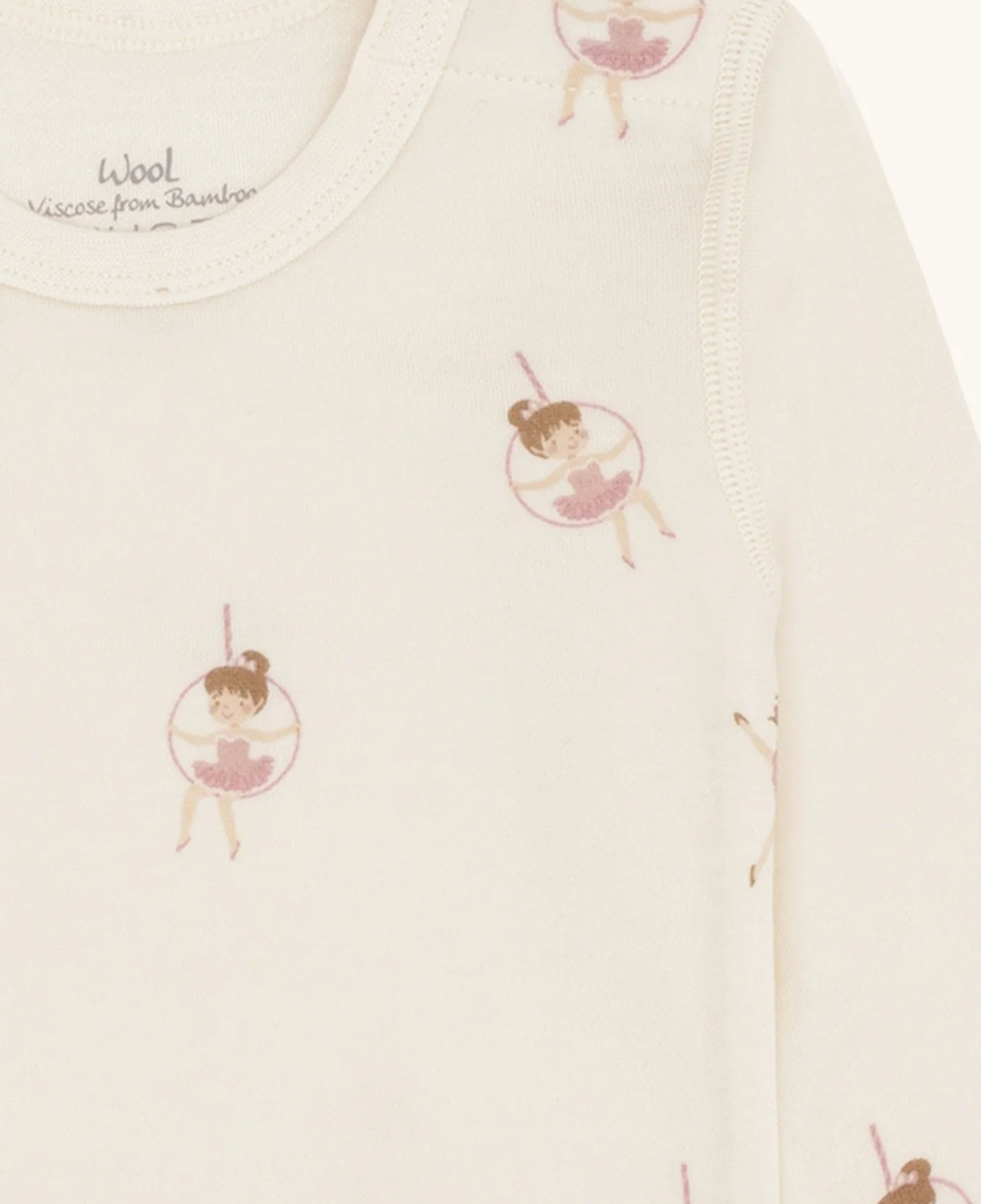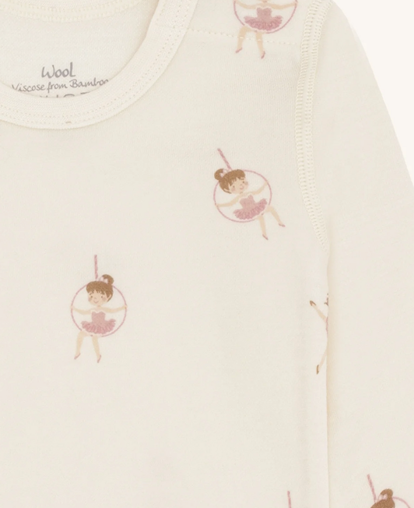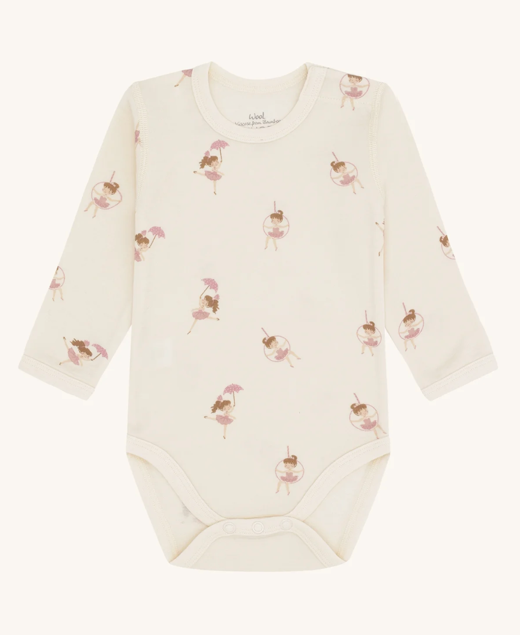 En myk og behagelig body i elastisk kvalitet med ull på utsiden og bambusviskose på innsiden, som føles ekstra skånsom mot huden. Bodyen er kremfarget med et søtt trykk av små ballerinaer i rosa toner. Den lukkes praktisk med trykknapper mellom bena og har myke sømmer som gjør den komfortabel å bruke hele dagen.