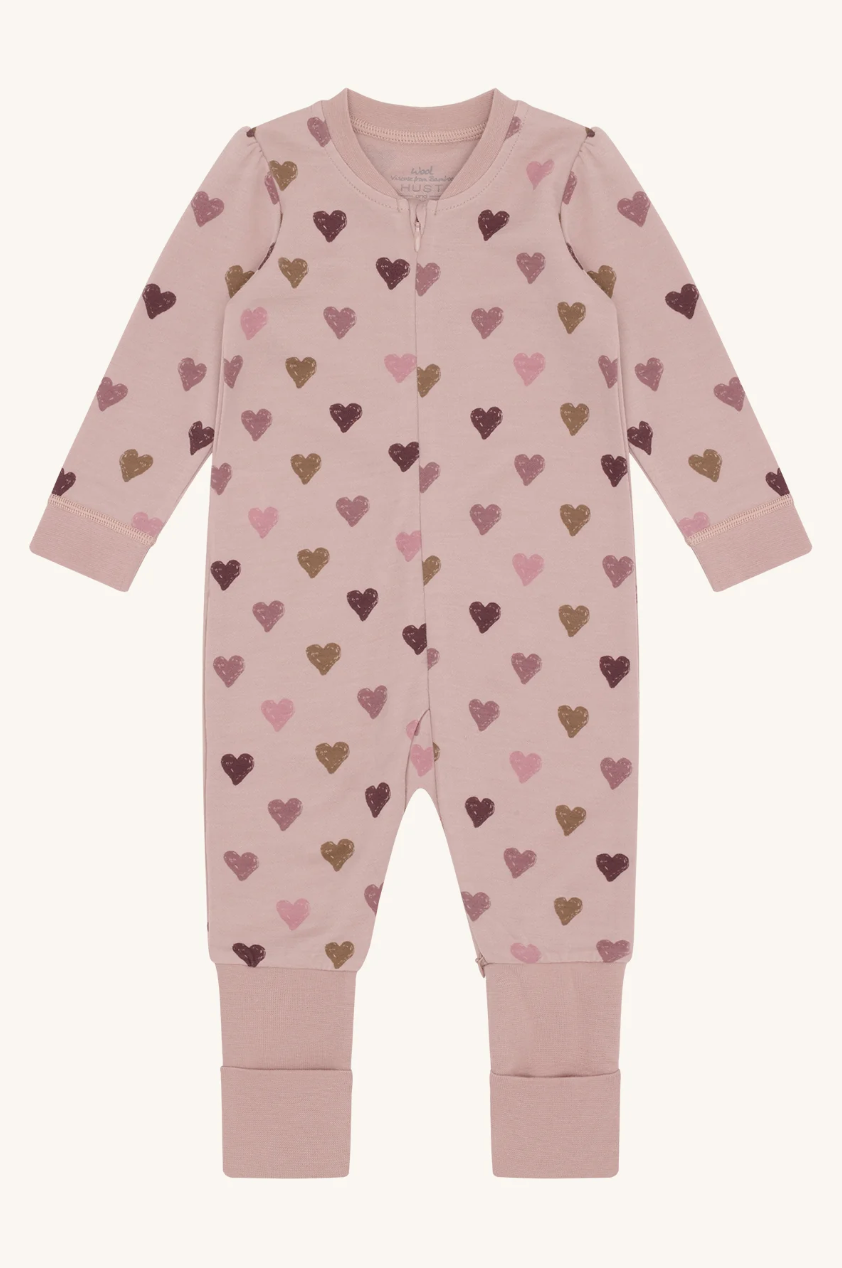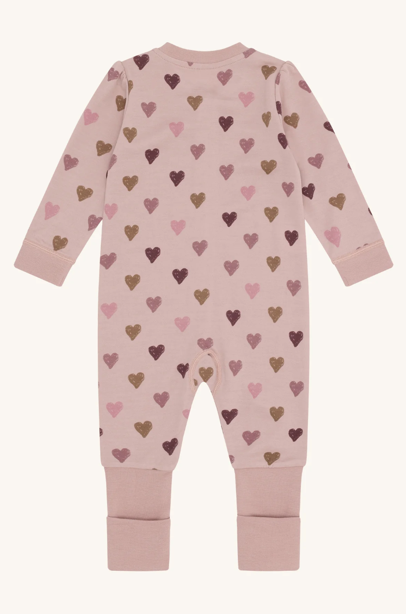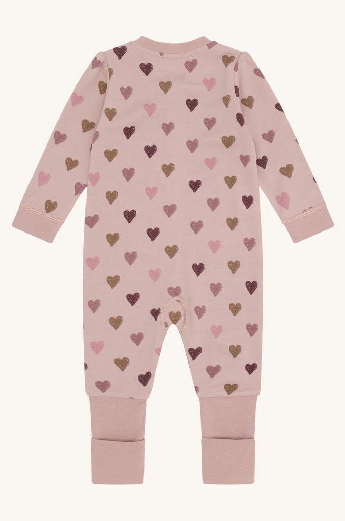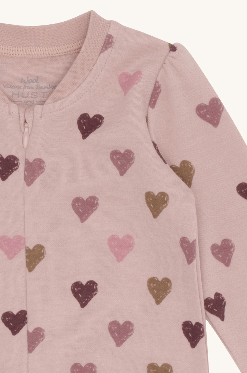 Langermet nattdrakt i behagelig, elastisk ull- og bambusviskoseblanding med hjertemønster. Drakten har rynkede skuldre og en lett asymmetrisk glidelås som går fra halsen og ned til venstre fot. Ved føttene er det en forlenget del som gjør at foten kan trekkes gjennom, eller brettes over for å fungere som sokker. Plagget har bambusviskose på innsiden og ull på utsiden.
