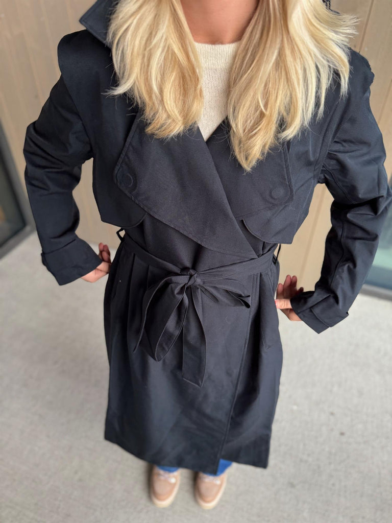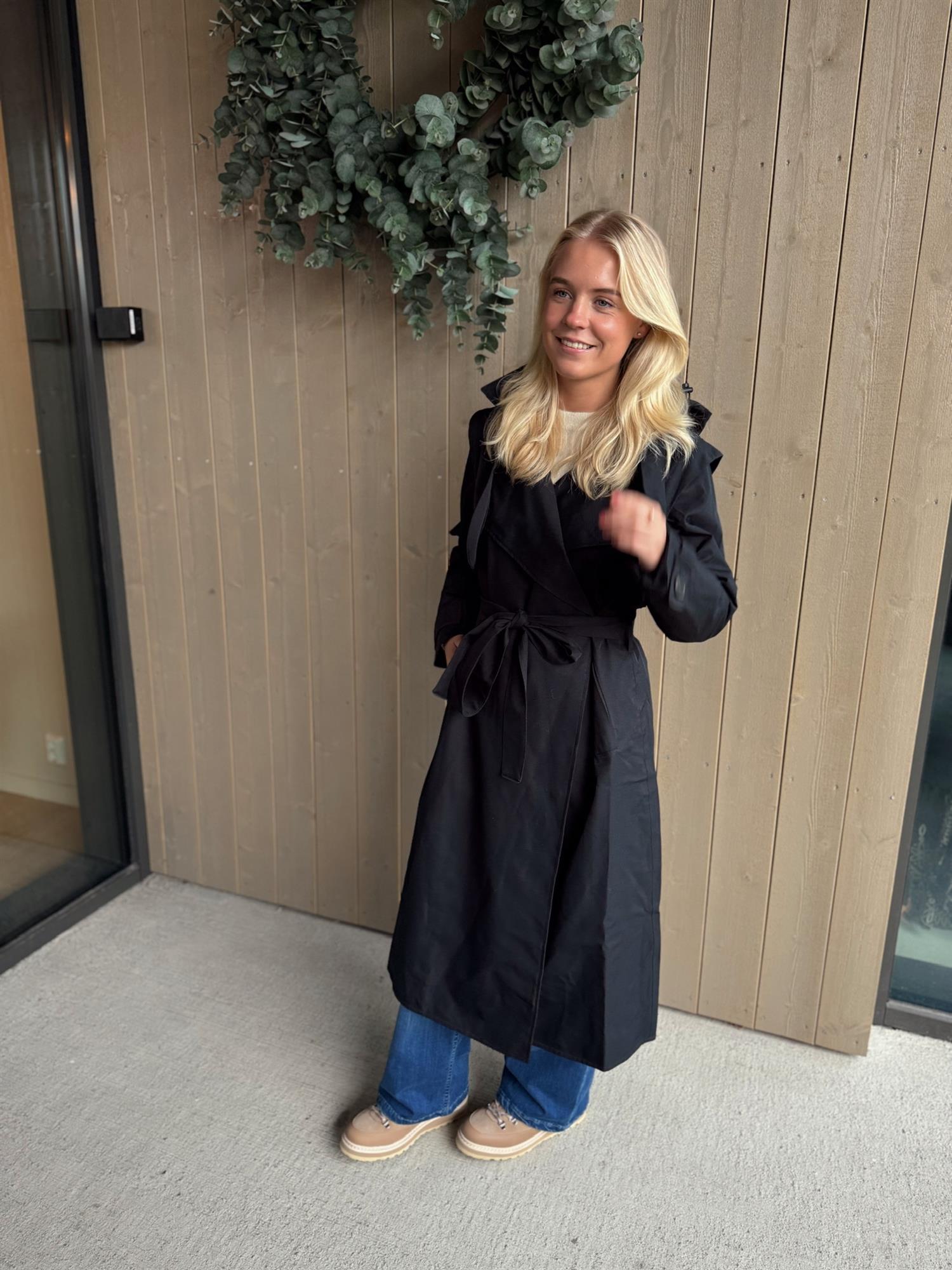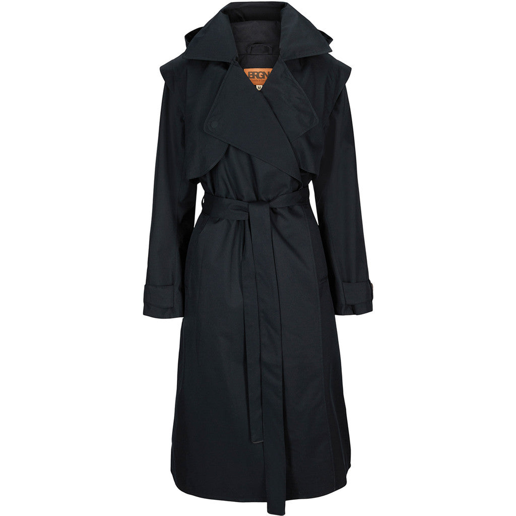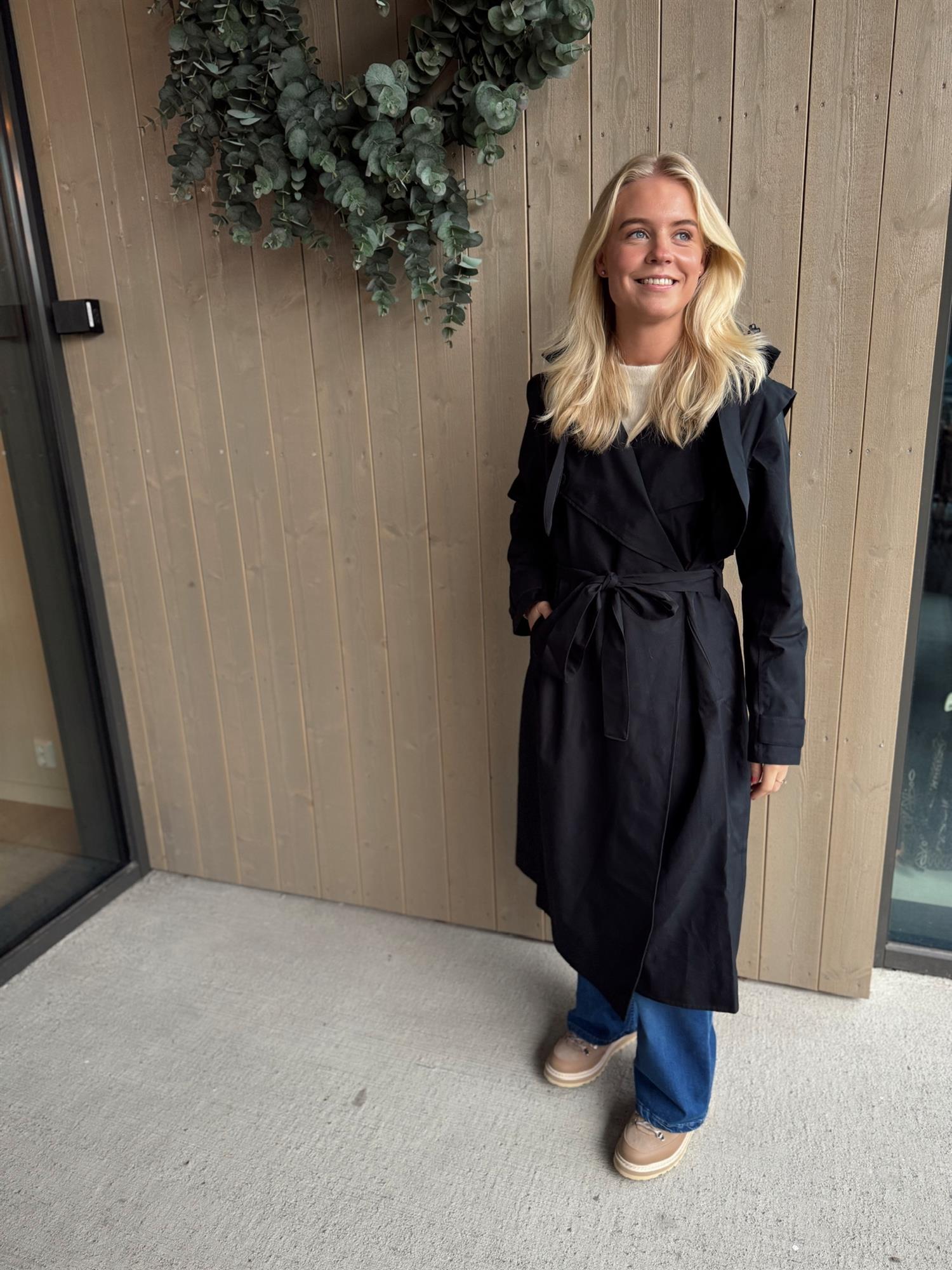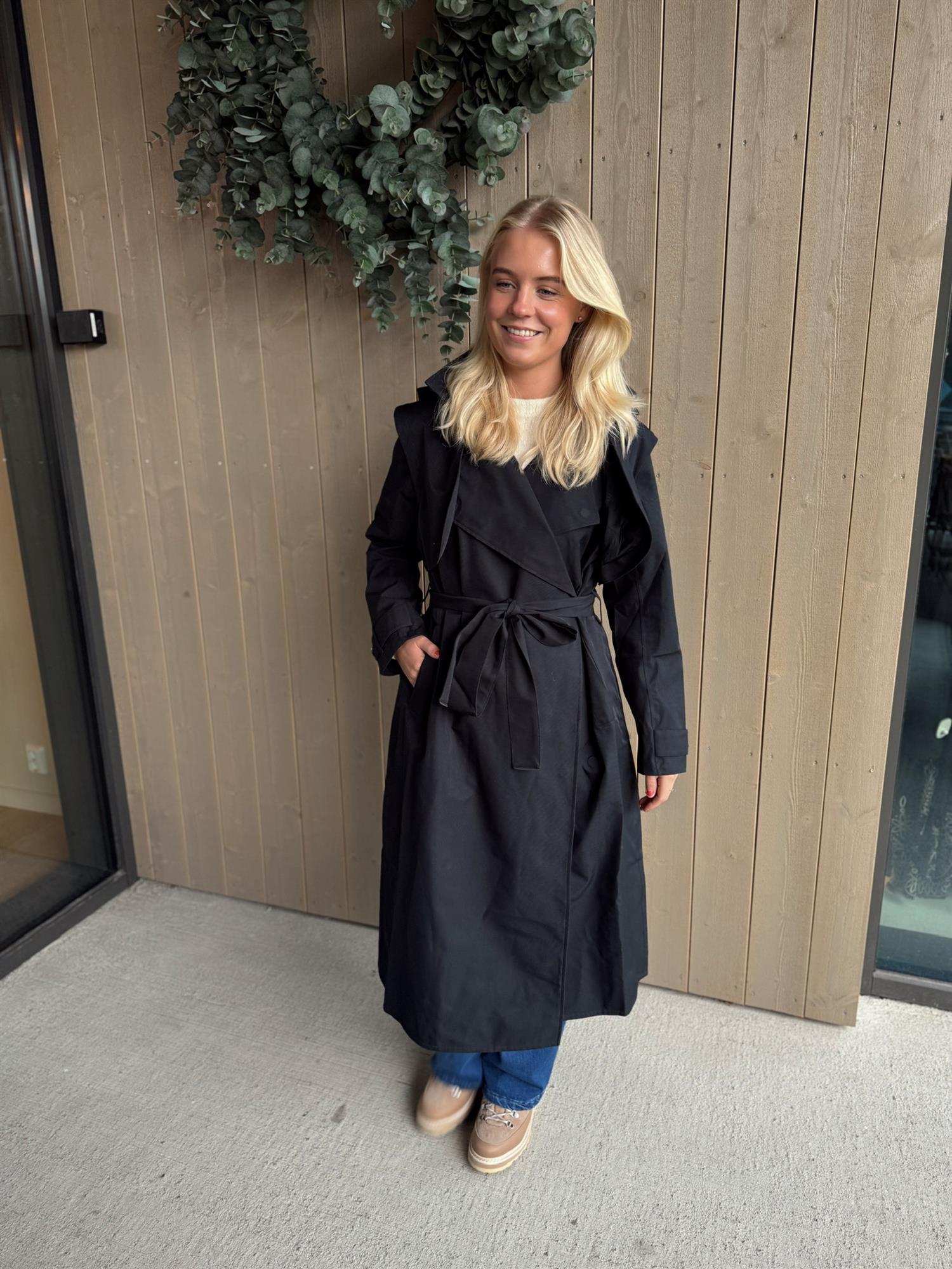 Regndråpe Trench Coat i fargen New Black, er en vanntett regnjakke laget av resirkulert tekstiler med hele 20.000 i vannsøyle.