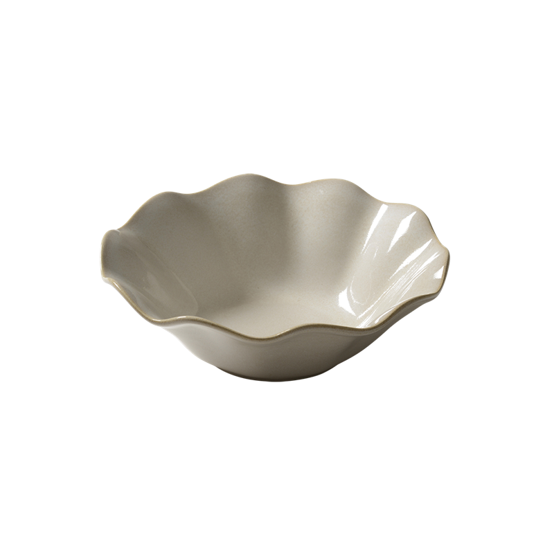 Elegant og organisk skål fra Bruka Design med bølgende kanter og en myk, kremet glasur. Den tidløse formen gjør den perfekt både som serveringsskål til salater, frukt og snacks – eller som et dekorativt element på bordet.