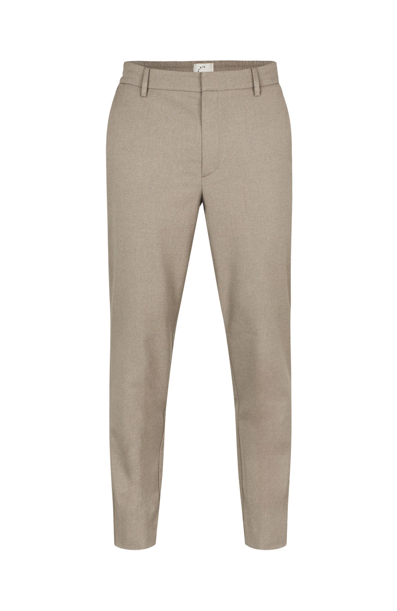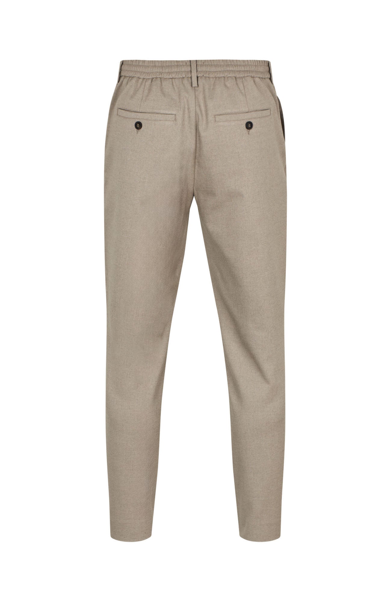 Smale bukser med midje i vanlig høyde, laget i mykt twill-stoff med melange-finish. Buksen har skrålommer foran, baklommer med slepelommer og skjult hempe- og glidelåslukking. Elastisk innfelt bak gir ekstra komfort. Perfekt til både hverdag og formelle anledninger.