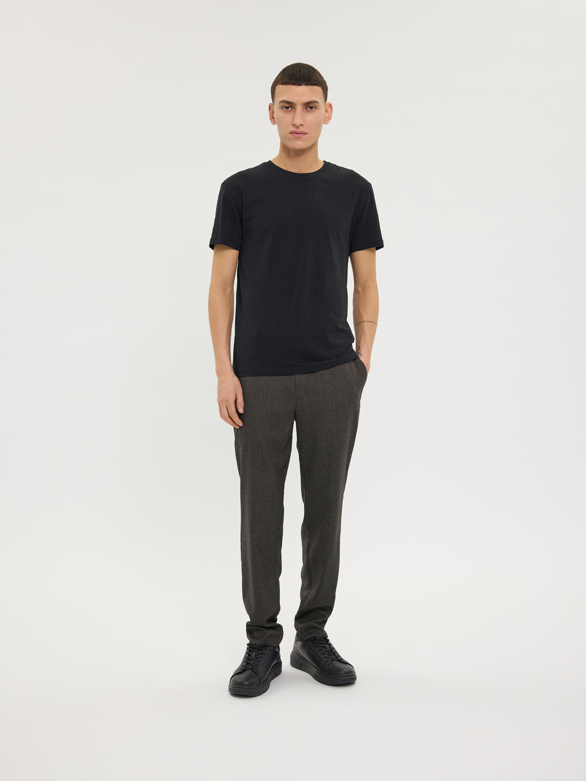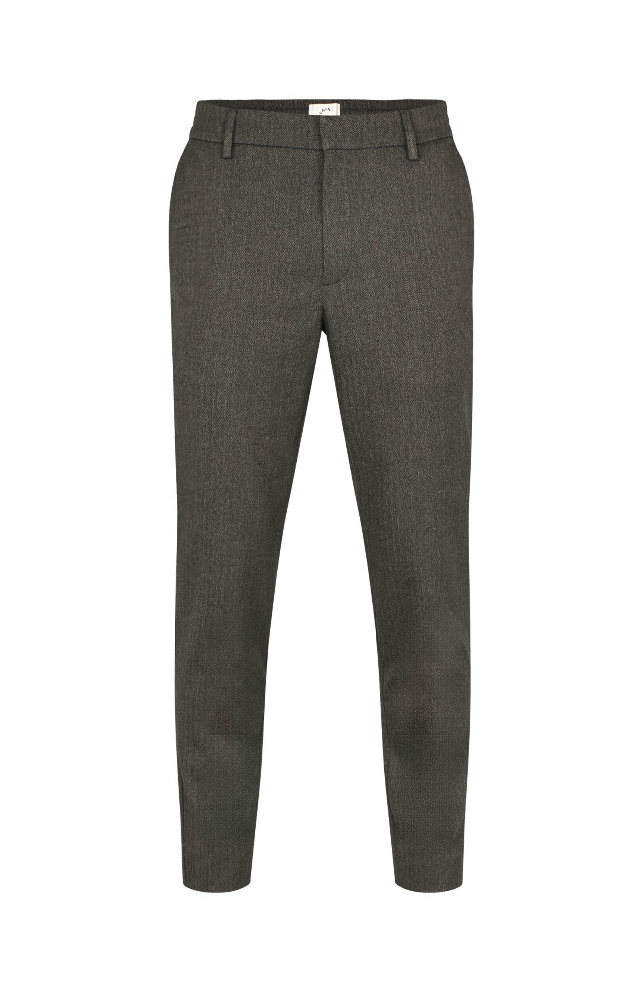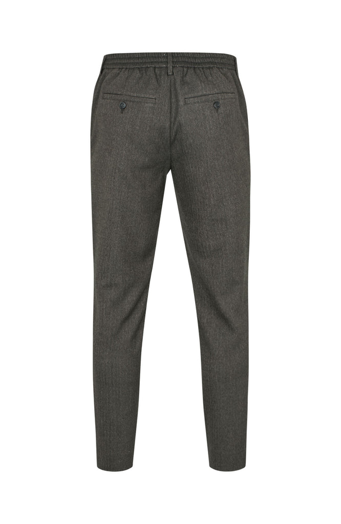 Smale bukser med midje i vanlig høyde, laget i mykt melange-stoff med fiskebensmønster. Buksen har skrålommer foran, baklommer med slepelommer og skjult hempe- og glidelåslukking. Elastisk innfelt bak gir ekstra komfort, og buksen passer like godt til både hverdag og mer formelle anledninger.