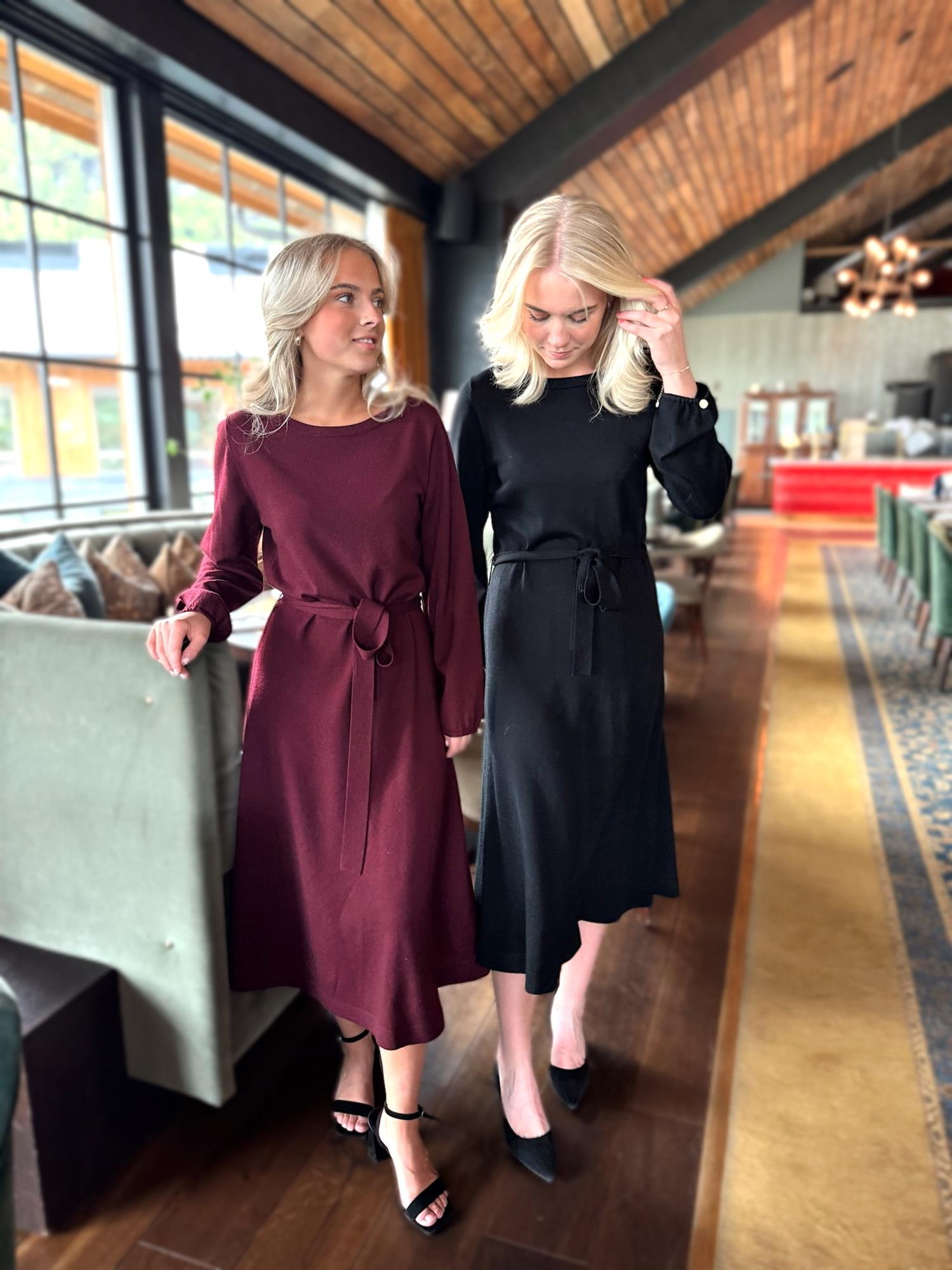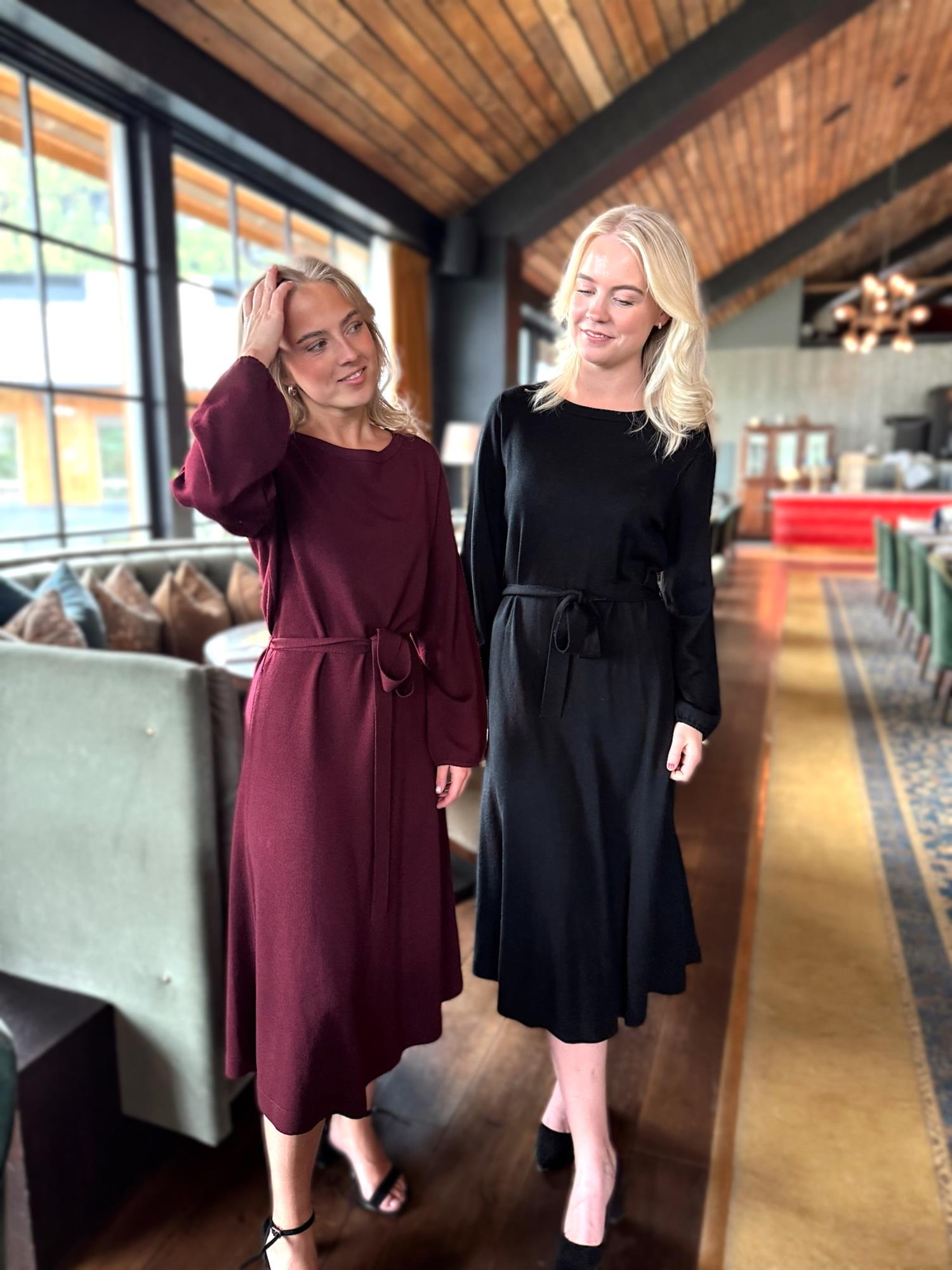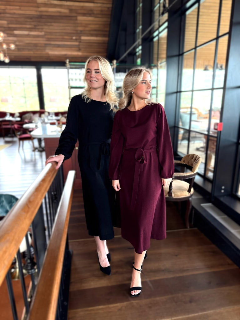 Eden Dress fra Busnel er en tidløs midi-kjole i 100 % ull. Den har rund hals, lange ermer med ribbestrikkede mansjetter og et matchende knytebelte som fremhever midjen. En elegant og allsidig kjole som fungerer like fint til hverdags som til mer formelle anledninger.