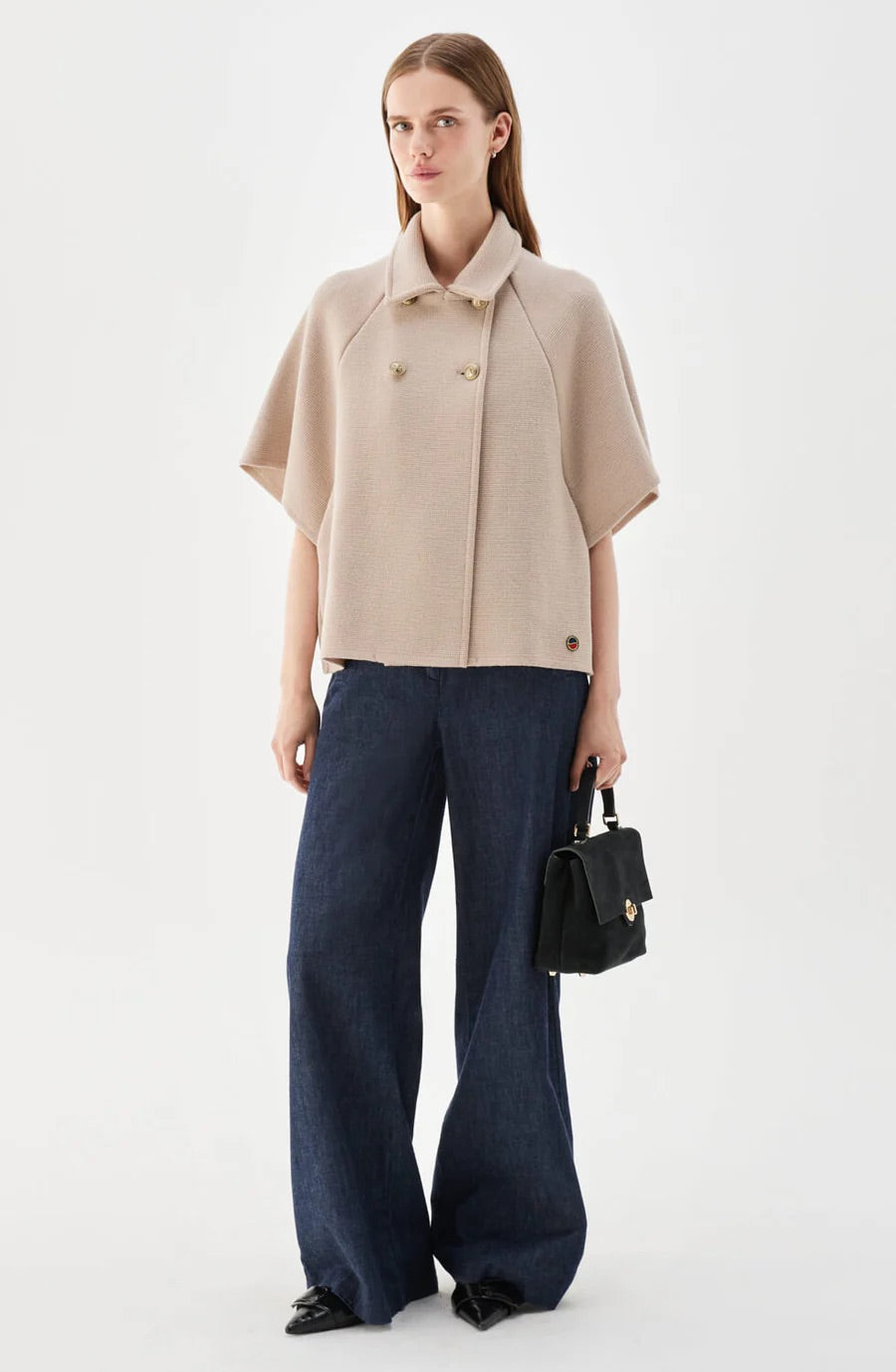 Gertrude Cape er et elegant plagg som kan brukes både ute og inne. Capen har en dobbelspent design med fire gullfargede ankerknapper, og passer til alle anledninger. Den er enkel å kombinere med garderoben din og gir et velkledd og sofistikert uttrykk.