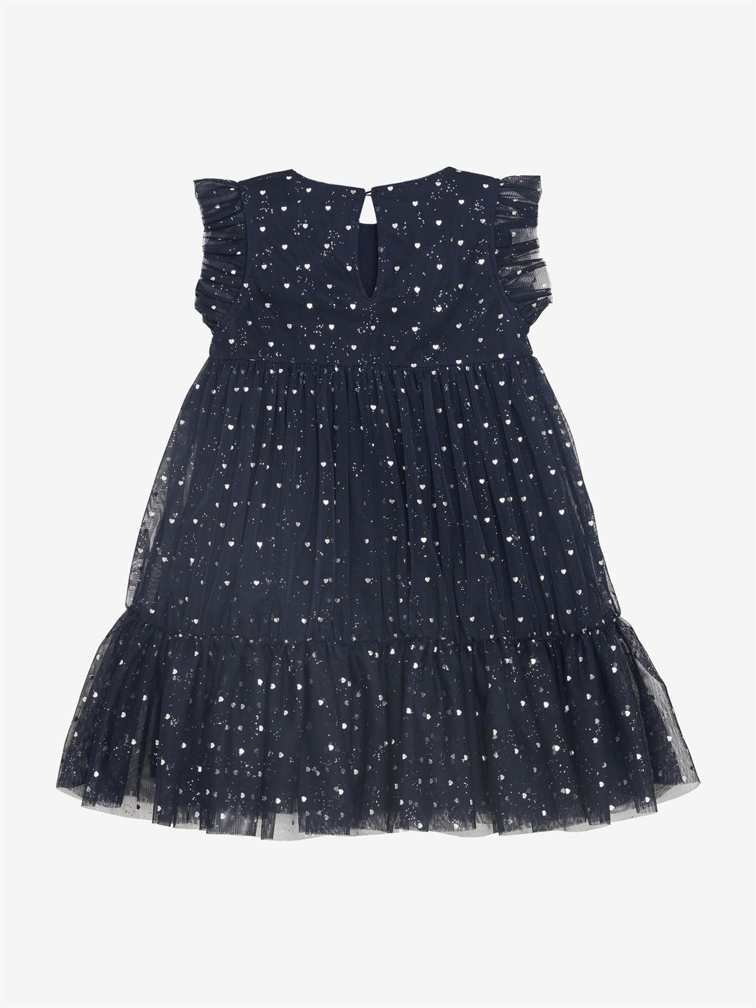 Nydelig mesh-kjole med søte detaljer fra Creamie. Kjolen består av to lag, der det øverste laget er i mesh med sølvhjerter og glitter. Det innerste laget er i en tykk kvalitet slik at kjolen ikke blir gjennomsiktig. Kjolen har volanger over skuldrene og en søm over brystet, hvor skjørtet faller med mange fine folder. Nederst er det lagt til et ekstra stykke for enda mer vidde. Kjolen lukkes bak med en knapp over en dråpeformet åpning. Sertifisert i henhold til OEKO-TEX® STANDARD 100, sertifikatnr. 2276-364 DTI.