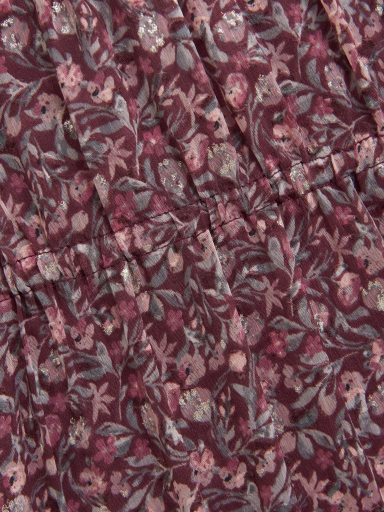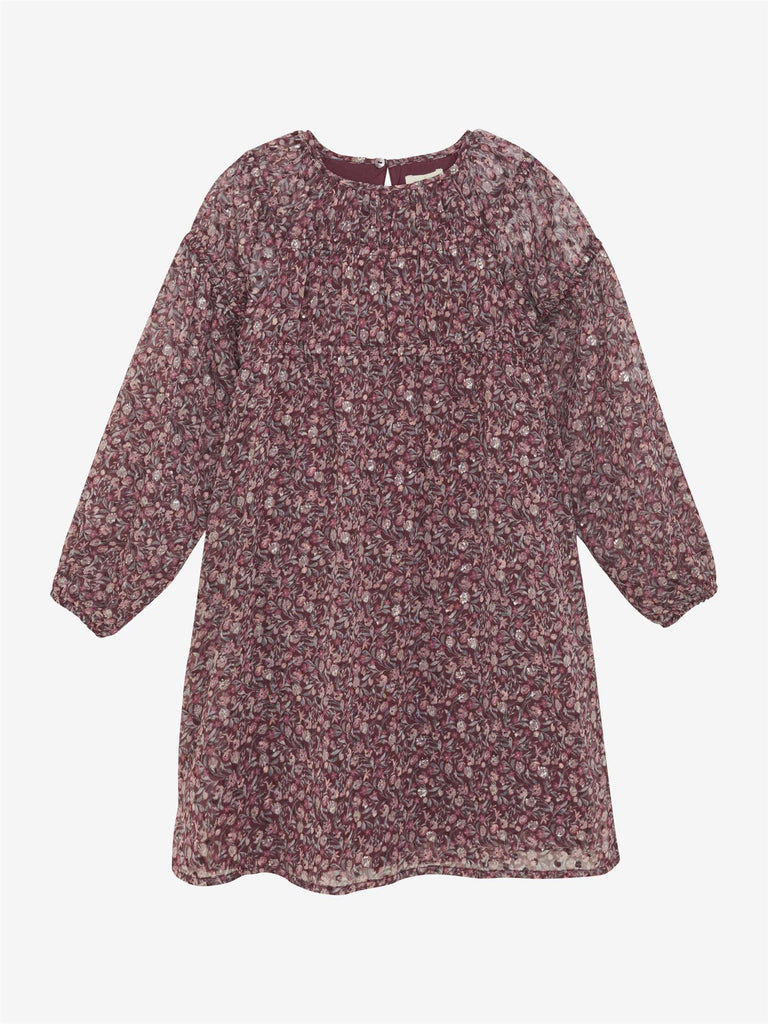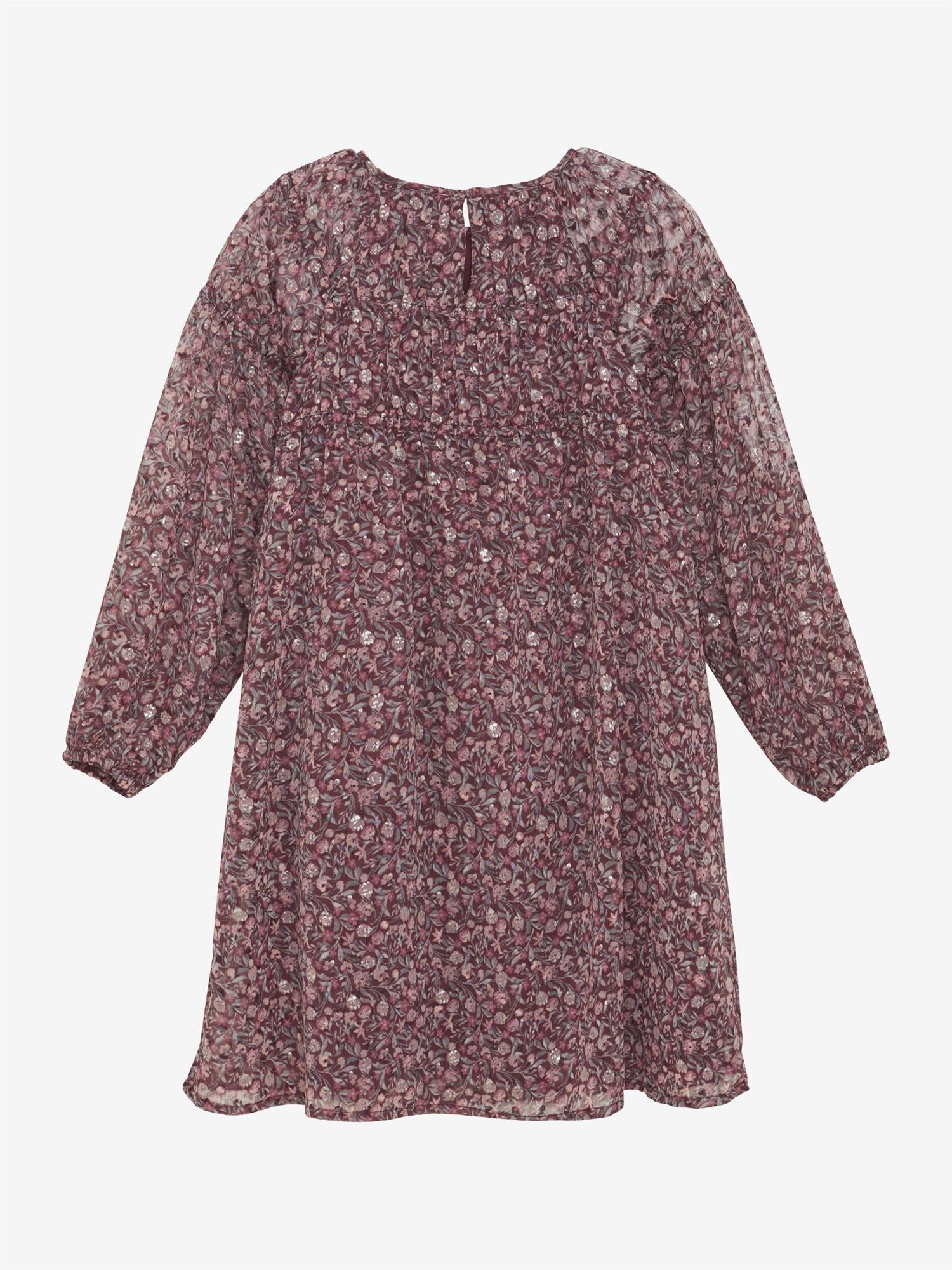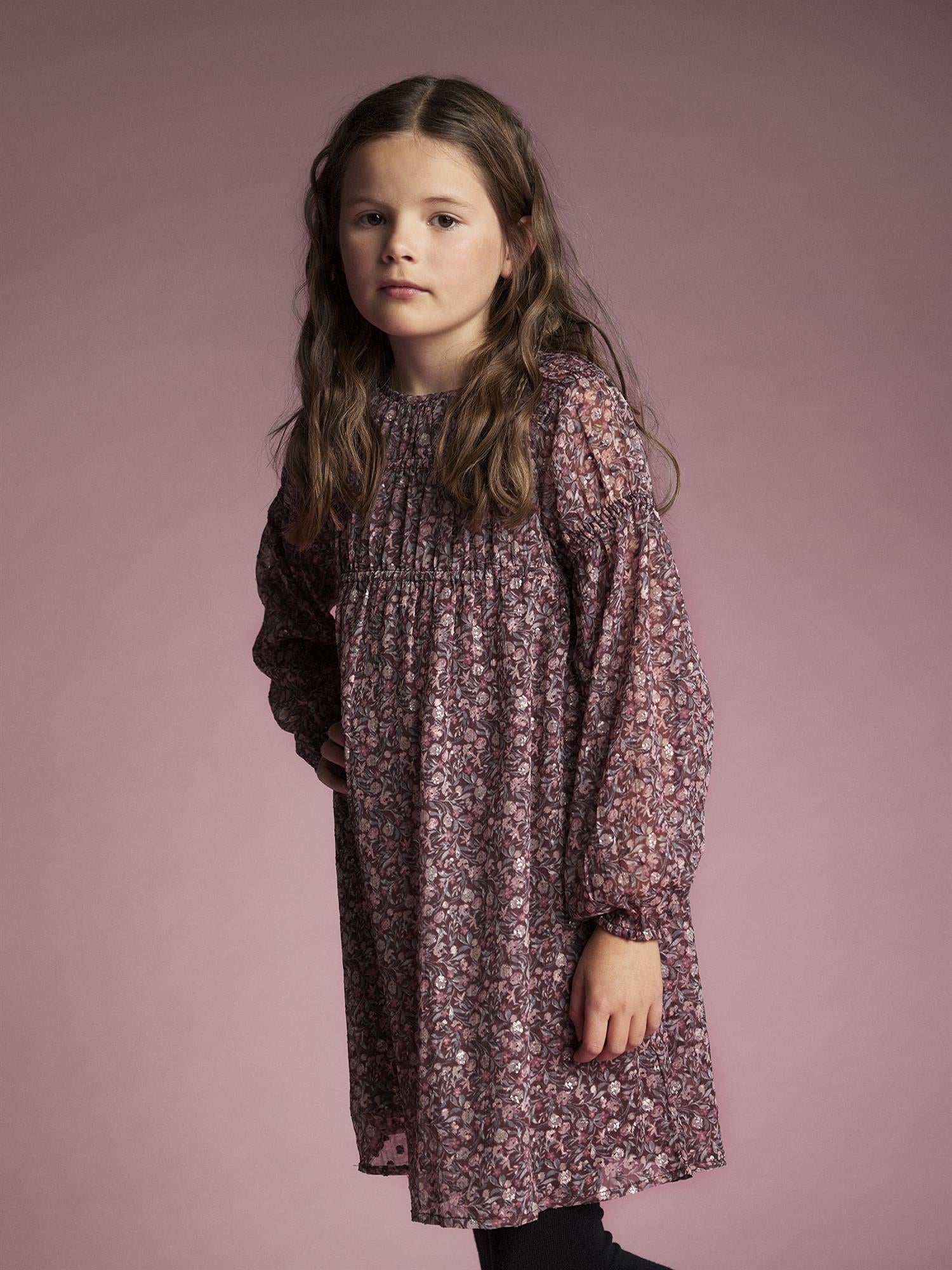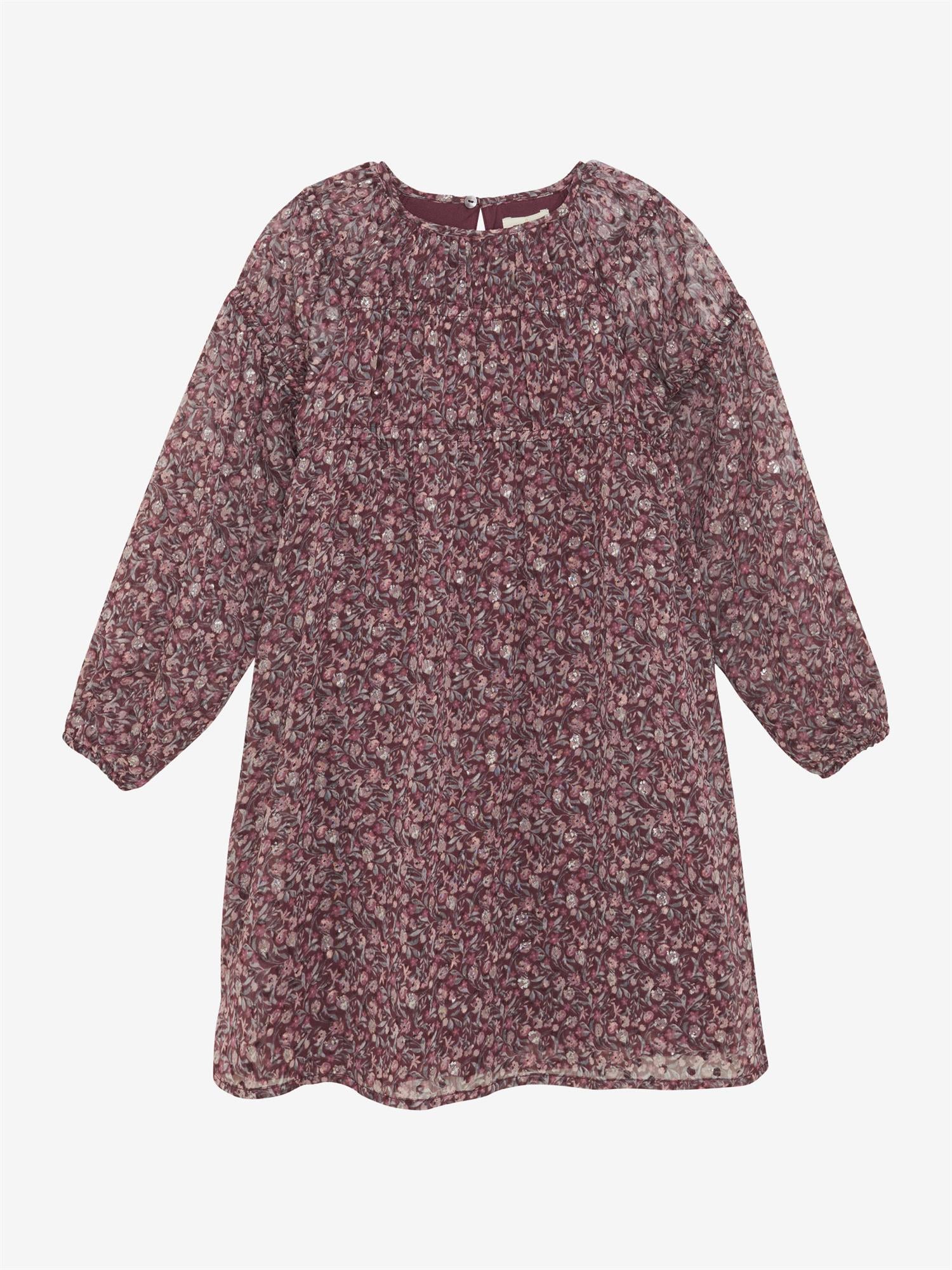 Vakker langermet kjole med heldekkende print fra Creamie. Printet består av blomster og litt sølv. Kjolen har sømmer som gir en rynkeeffekt. Den har en søm fra brystet, hvorfra skjørtet faller pent med akkurat passe vidde. Ermene er semitransparente, mens resten av kjolen består av to lag, der det innerste er i tettvevd bomullskvalitet slik at den ikke blir gjennomsiktig.