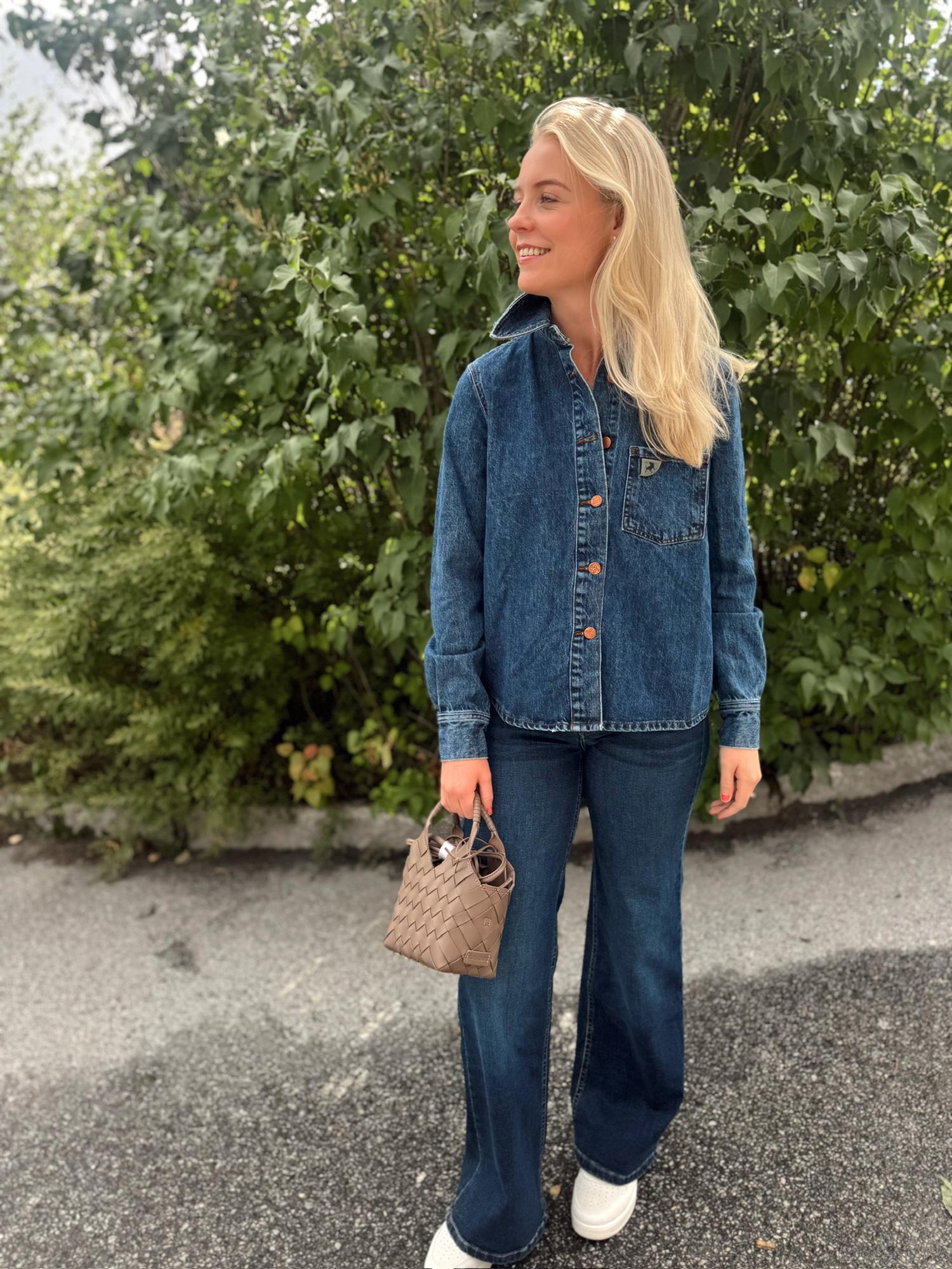 Bruk den åpen over en hvit tanktop, eller kneppet til jeans i samme vask for en helhetlig look.
