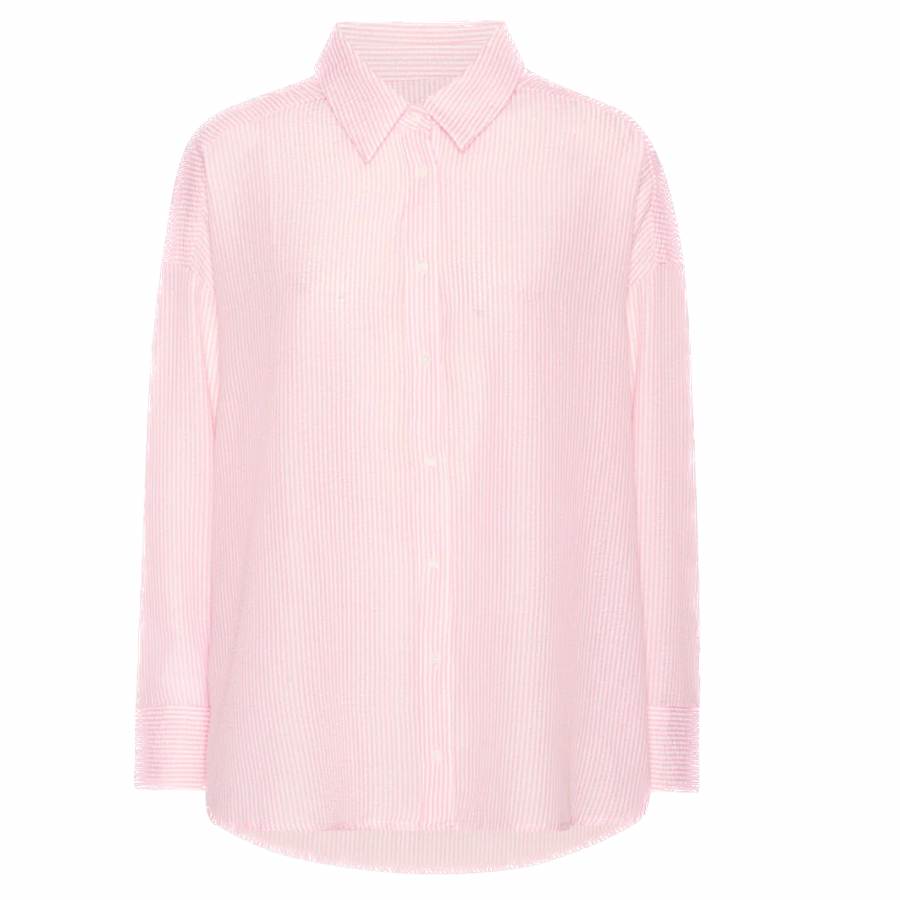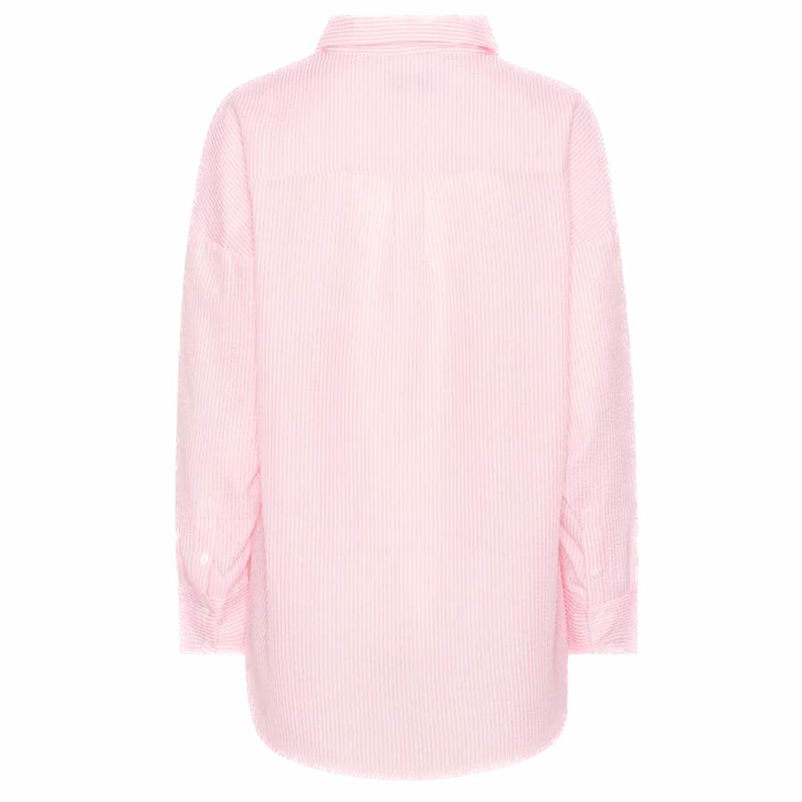 Sonja-skjorte fra A-View er en lang, oversized skjorte i seersucker-kvalitet. Den har lave skuldersømmer og doble mansjetter med to små knapper hver. Skjorten lukkes med små knapper foran.