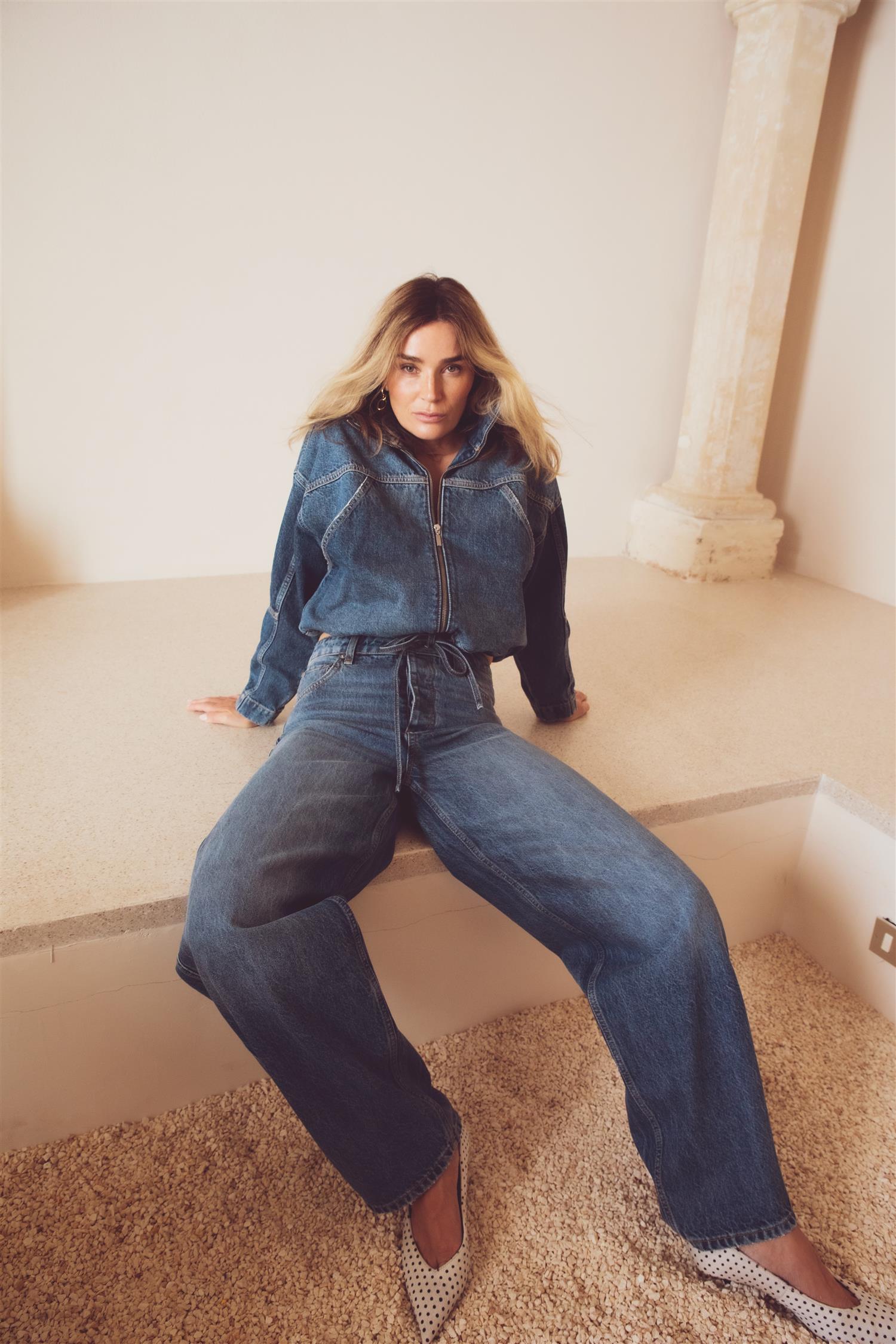 Studiomodellen er 176 cm høy og har på størrelse 27/32.