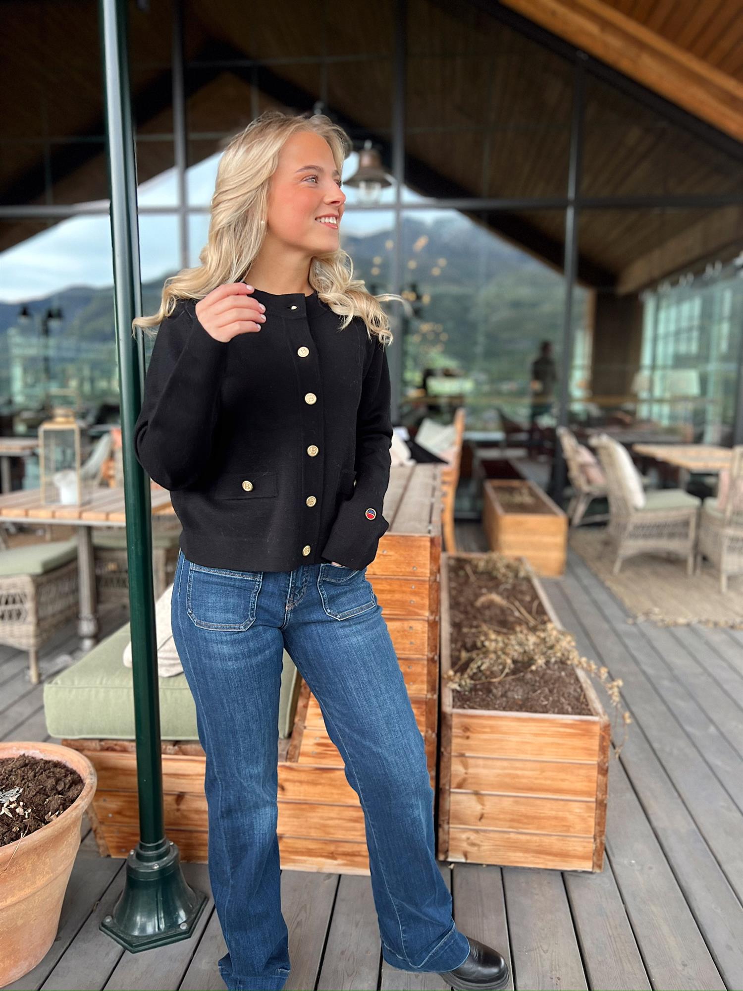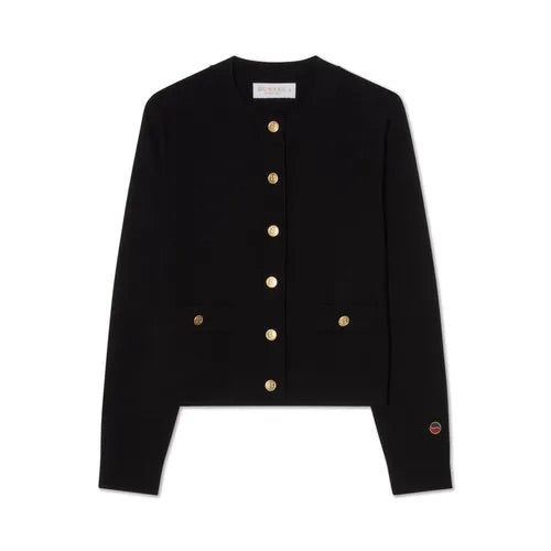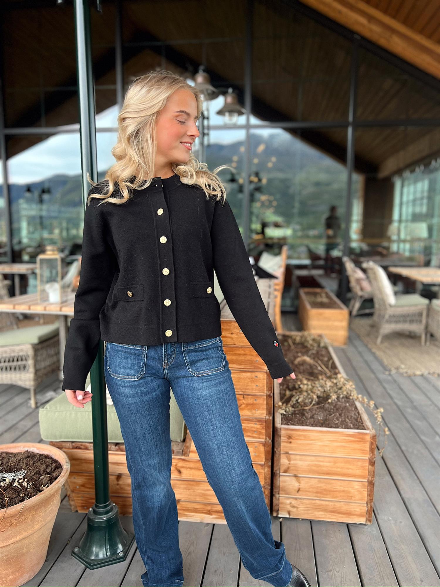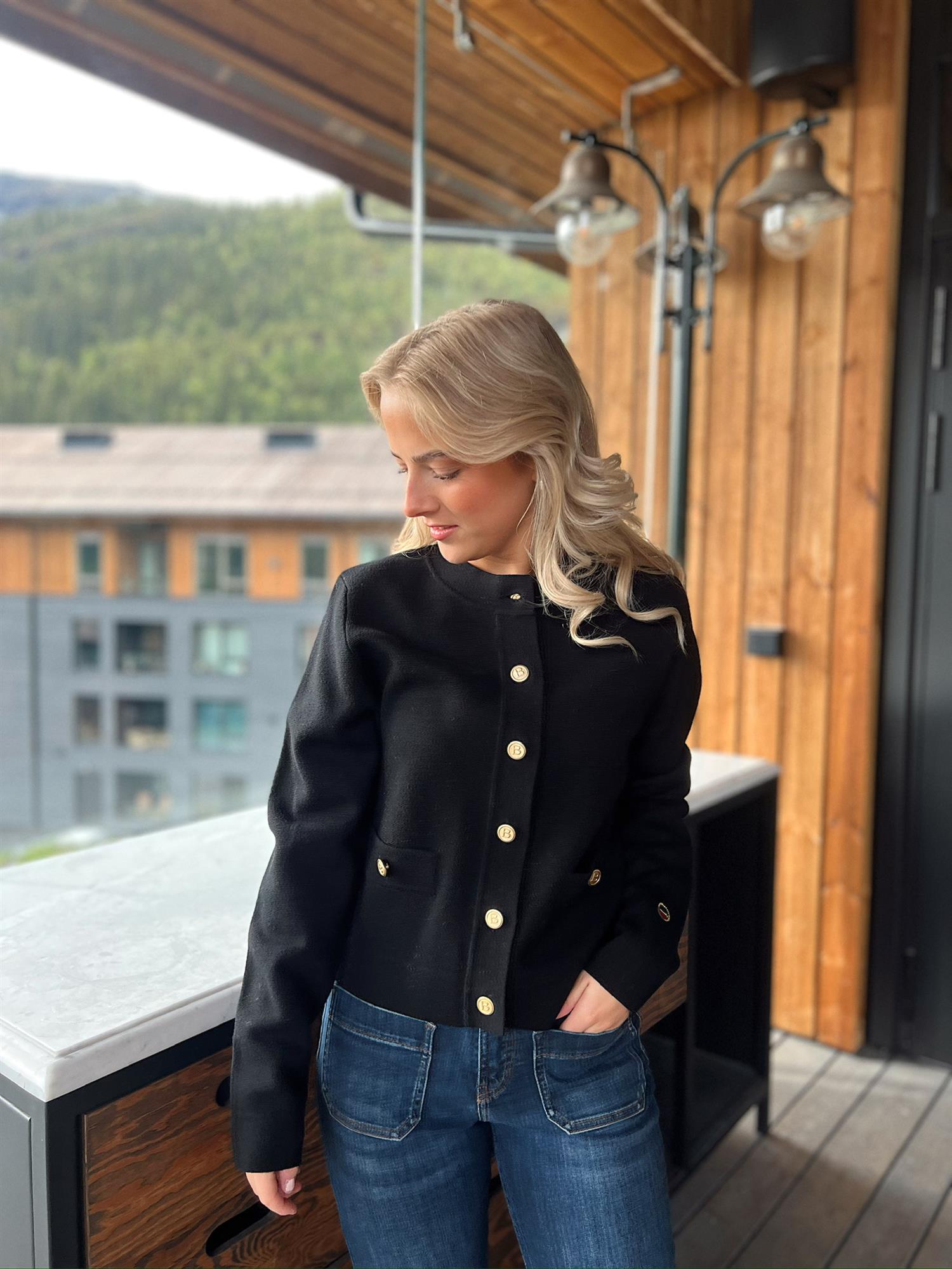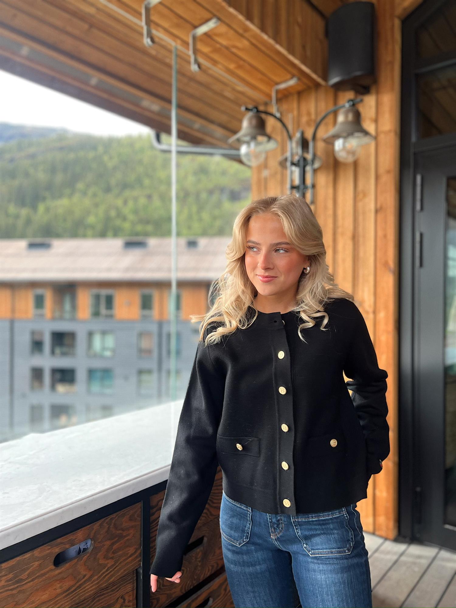 Aria Cardigan fra Busnel er en elegant strikkejakke i 100 % ull. Den sorte basen kombineres med kontrastdetaljer i ecru, som gir et eksklusivt og tidløst uttrykk. Perfekt over både kjoler og bukser – et plagg som løfter enhver garderobe.