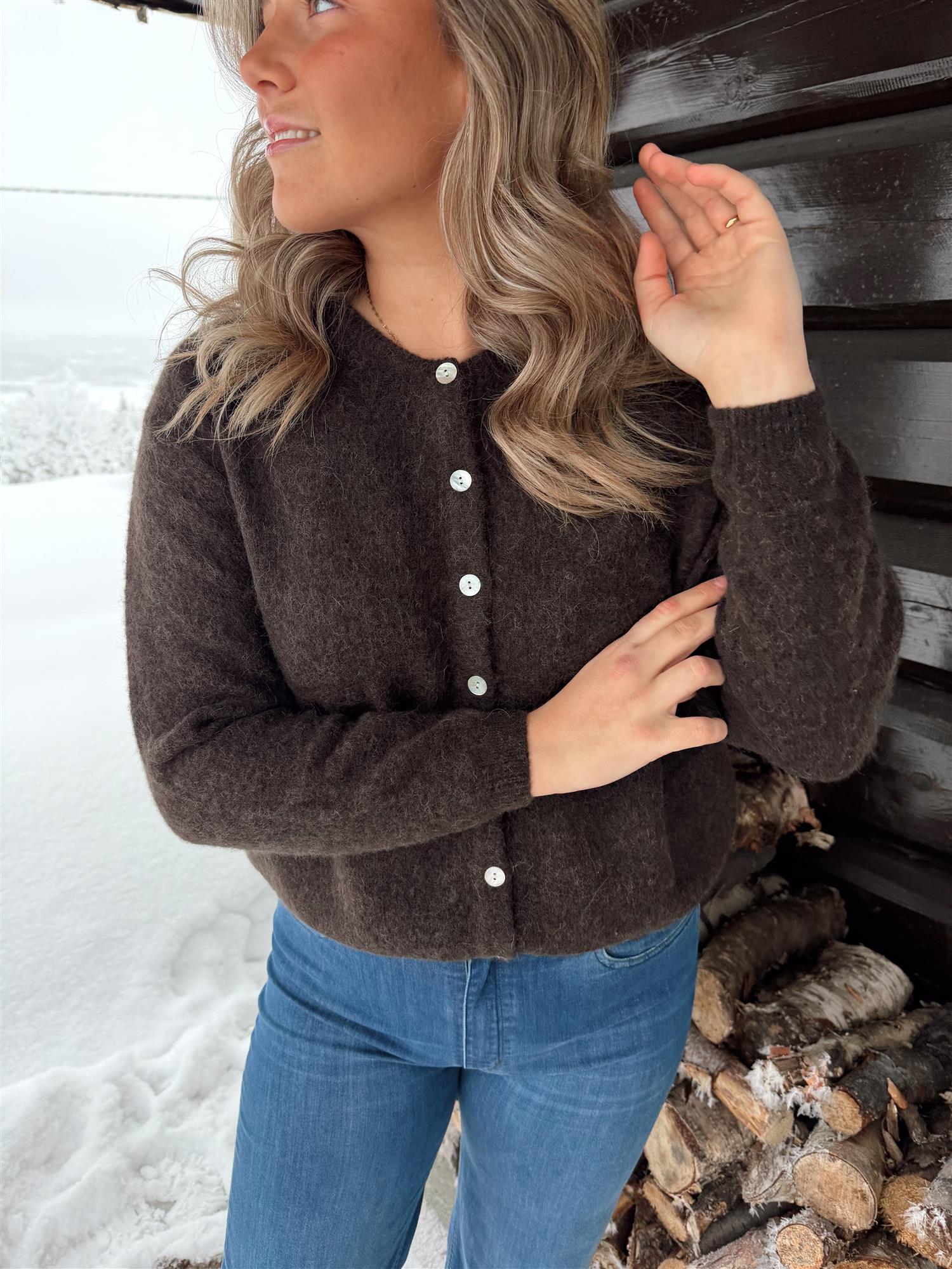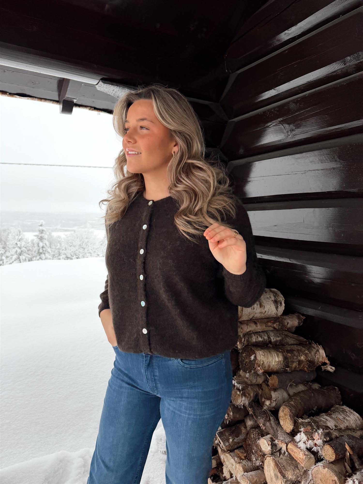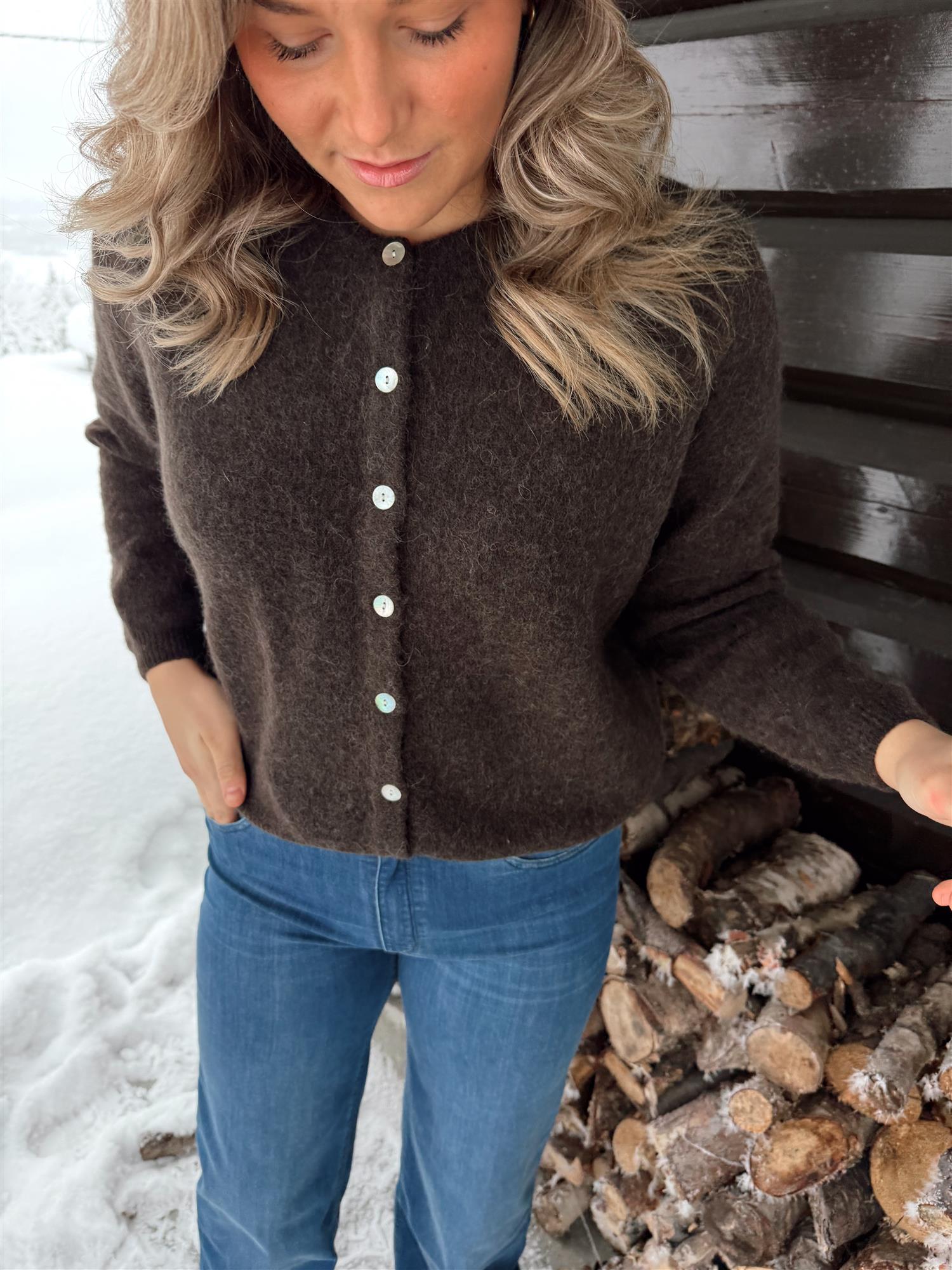 En myk og elegant cardigan i en delikat burgundertone, strikket i en deilig og varm ullmiks. Den har rund hals, lange ermer og ribbestrikkede kanter som gir et tidløst uttrykk. Passformen er rett og avslappet med en flatterende lengde, og cardiganen lukkes med lyse knapper i front.