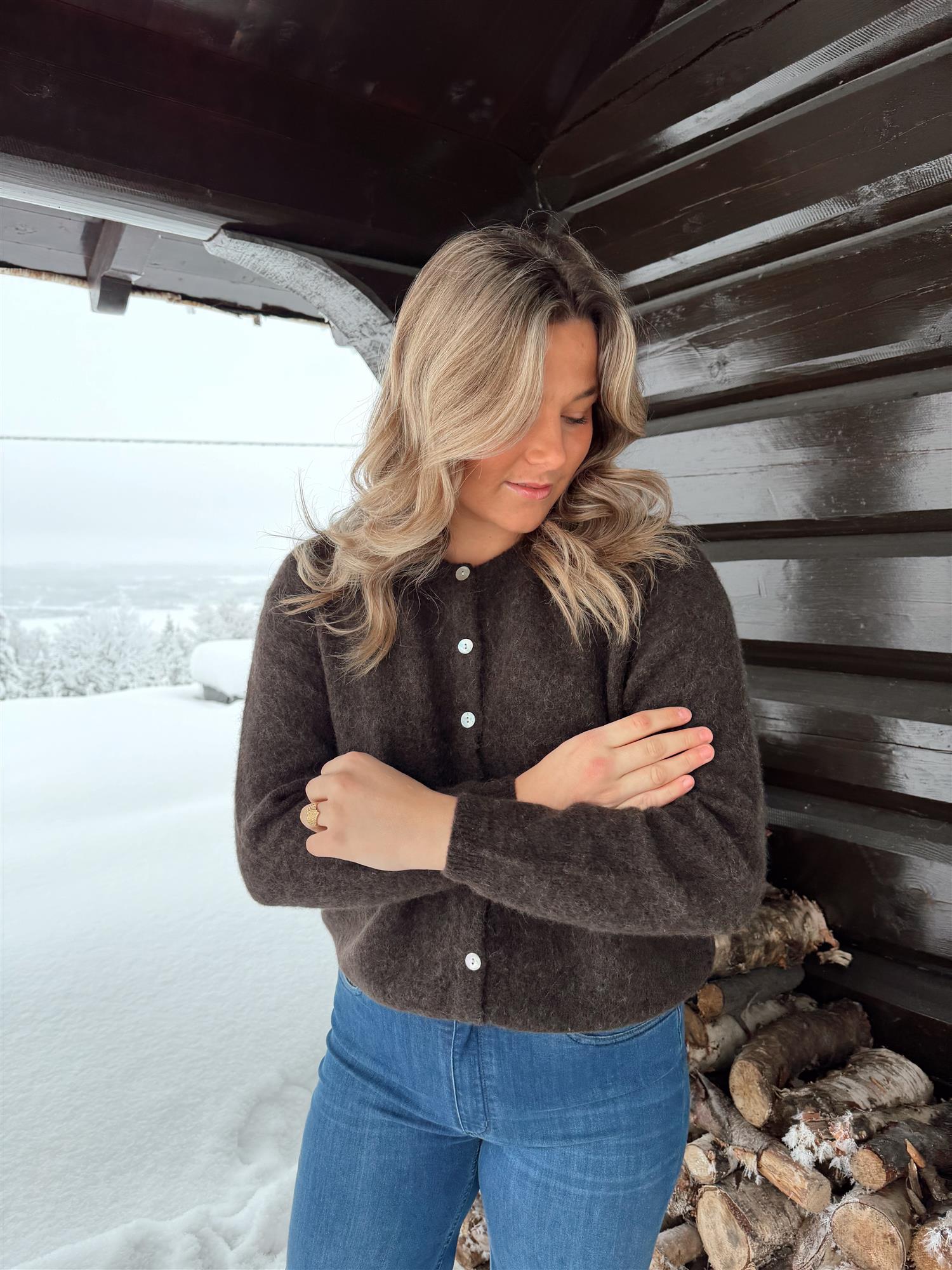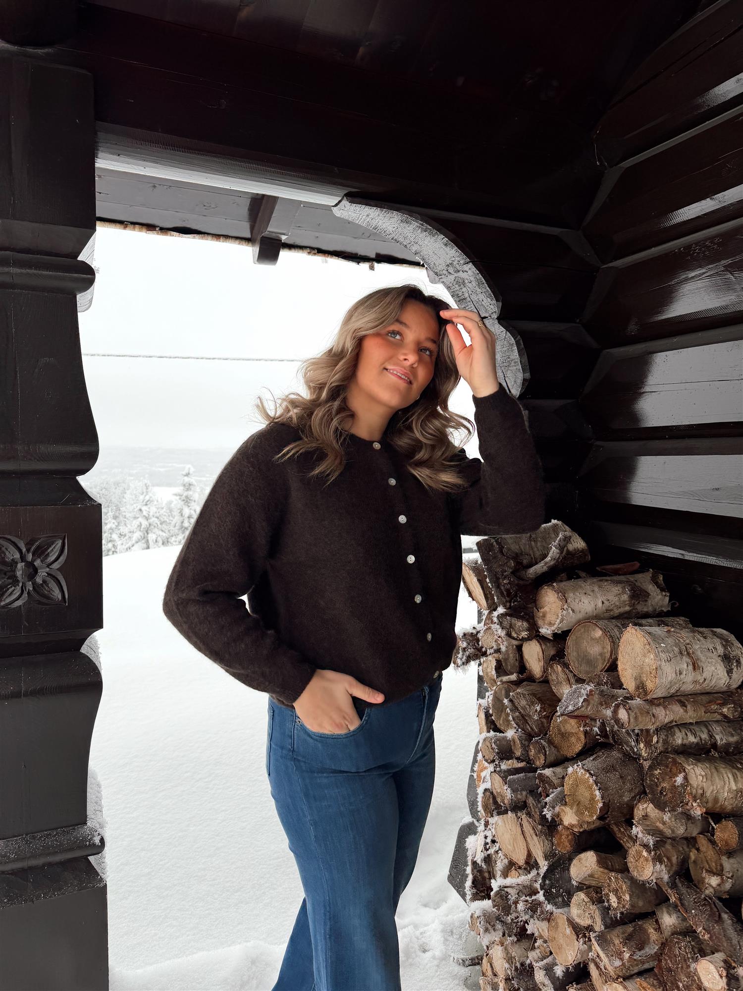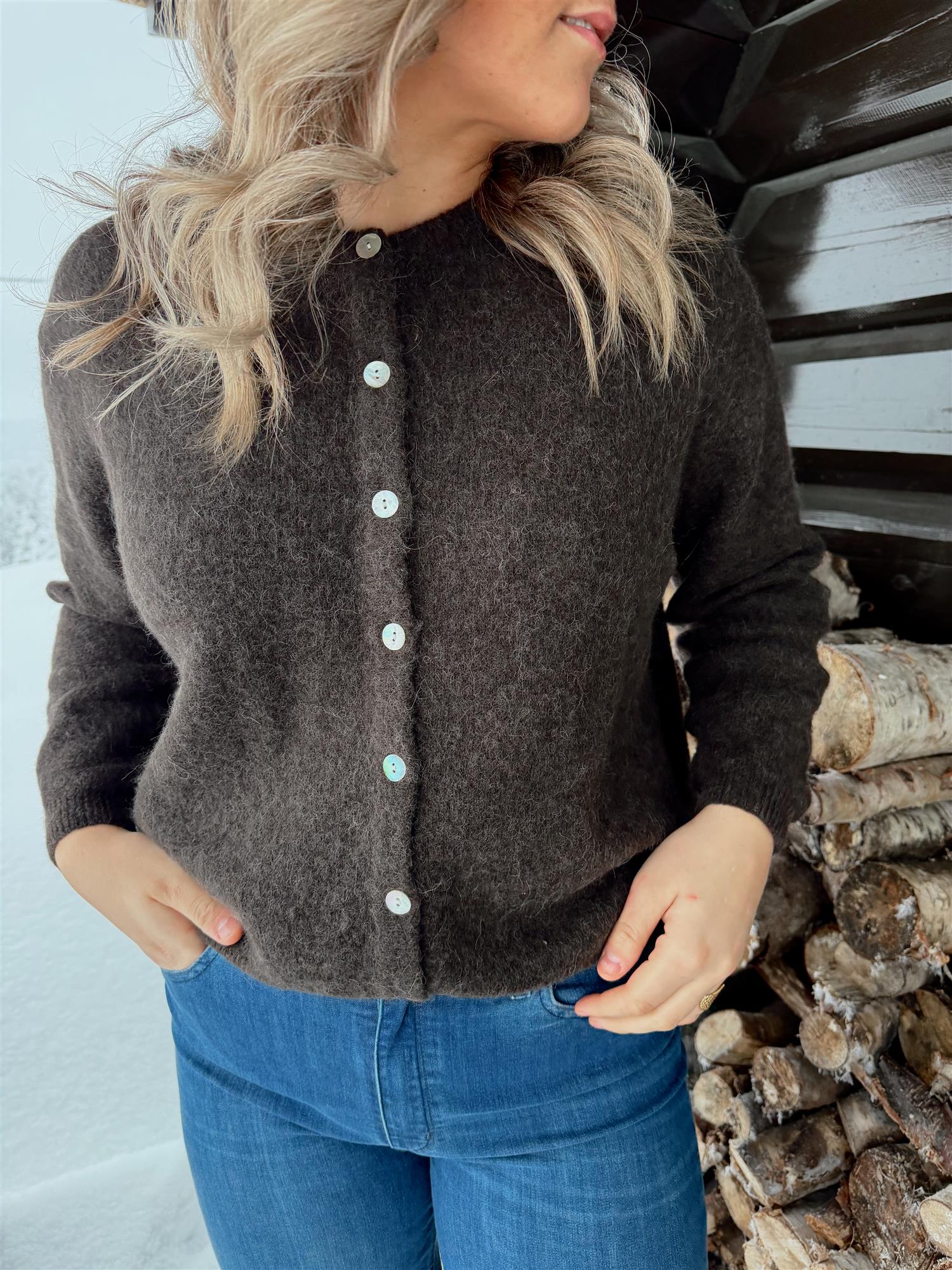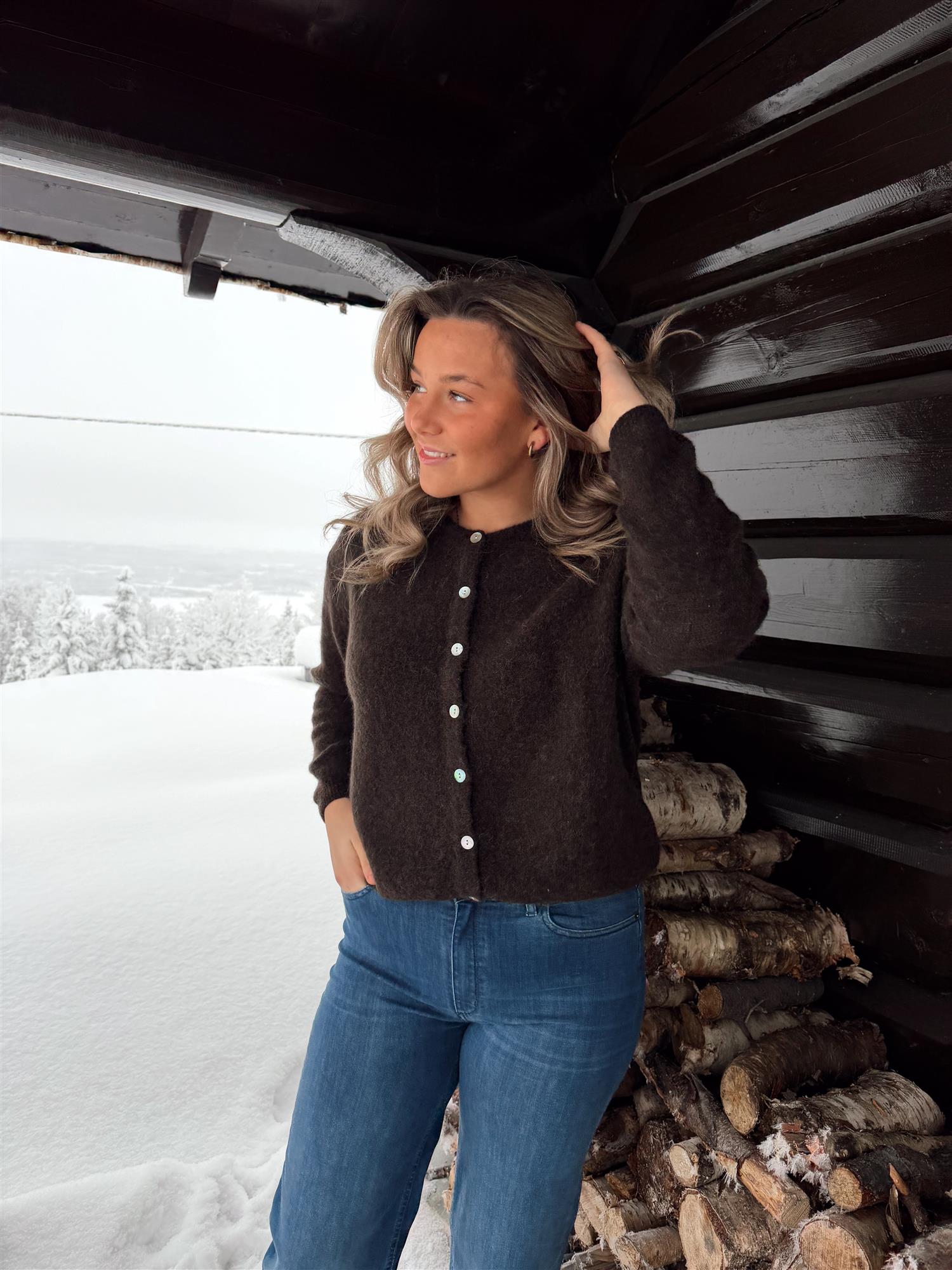 En myk og elegant cardigan i en delikat burgundertone, strikket i en deilig og varm ullmiks. Den har rund hals, lange ermer og ribbestrikkede kanter som gir et tidløst uttrykk. Passformen er rett og avslappet med en flatterende lengde, og cardiganen lukkes med lyse knapper i front.