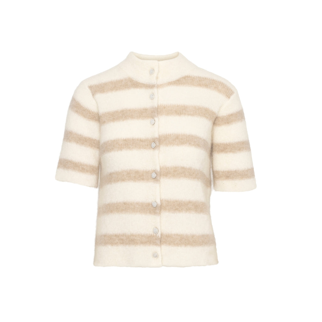 En feminin og elegant kortermet cardigan i RAH OSLOs populære kidmohair-kvalitet. Cardiganen har et delikat stripet uttrykk, perleknapper i front og en lett avrundet hals som gir et sofistikert preg. Den myke og luftige kvaliteten gjør den perfekt til både hverdag og mer pyntede anledninger.