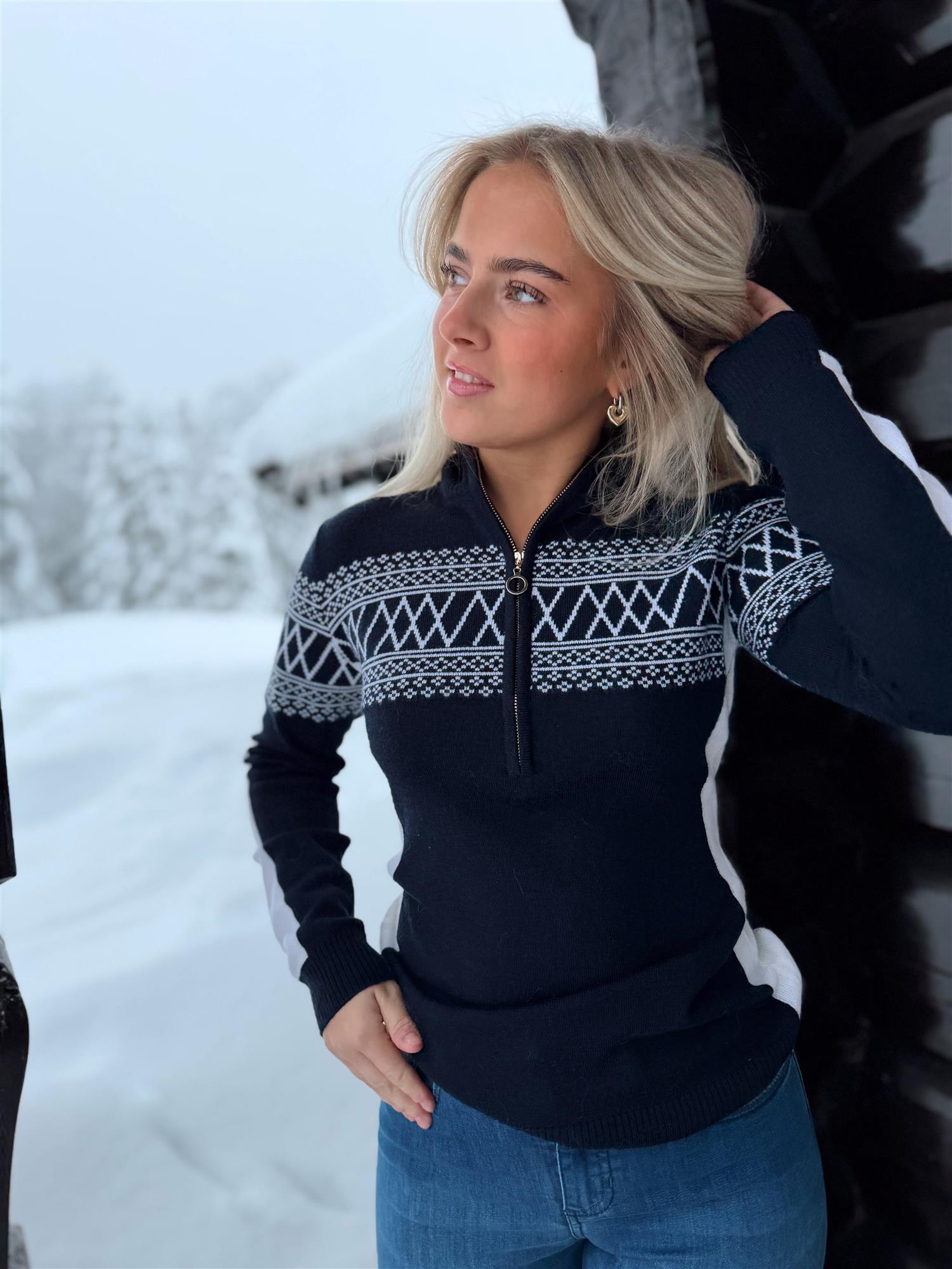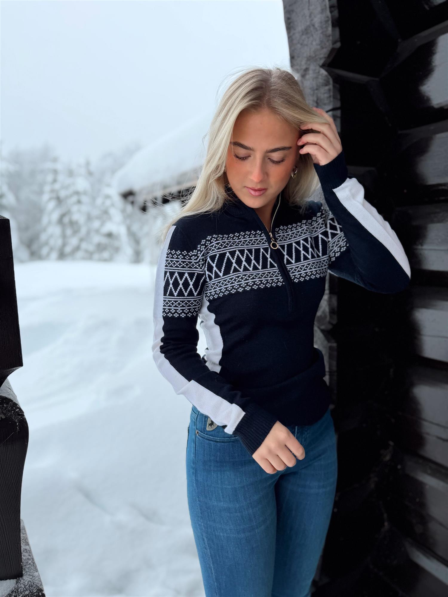 Signature 1/4-Zip fra We Norwegians er en oppdatert versjon av sesongens klassiker. Designet henter inspirasjon fra det tradisjonelle Setesdalsmønsteret, kombinert med sporty detaljer som kontrastfarget intarsia på ermer og sidepaneler. Den figurnære fasongen gir et moderne og flatterende uttrykk, samtidig som den gjør genseren enkel å bruke både til aktivitet og fritid.
