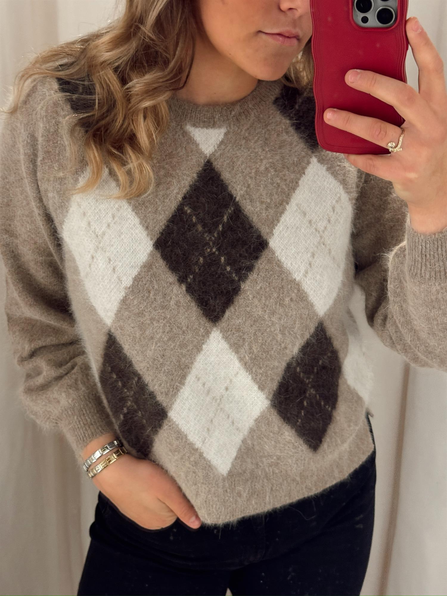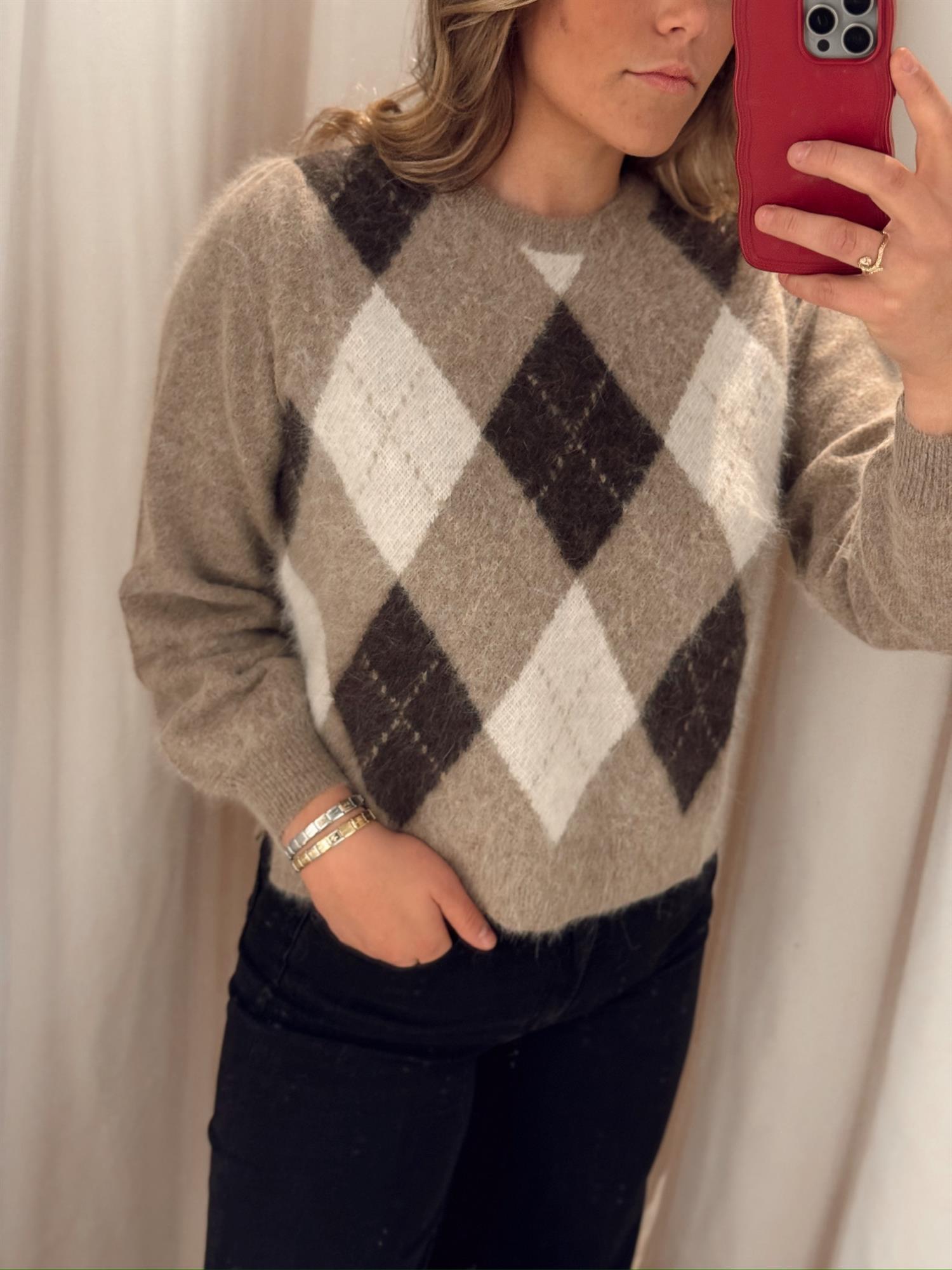 Argyle Pullover fra Ane Mone er en myk og lun genser i et tidløst rutemønster. Den klassiske argyle-strikken får en moderne oppdatering med harmoniske bruntoner, perfekt for høst og vinter.