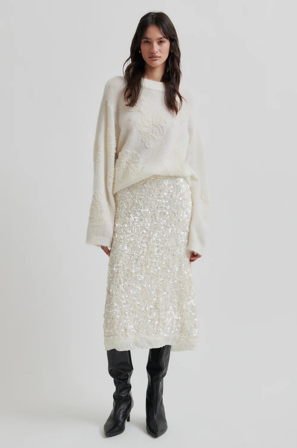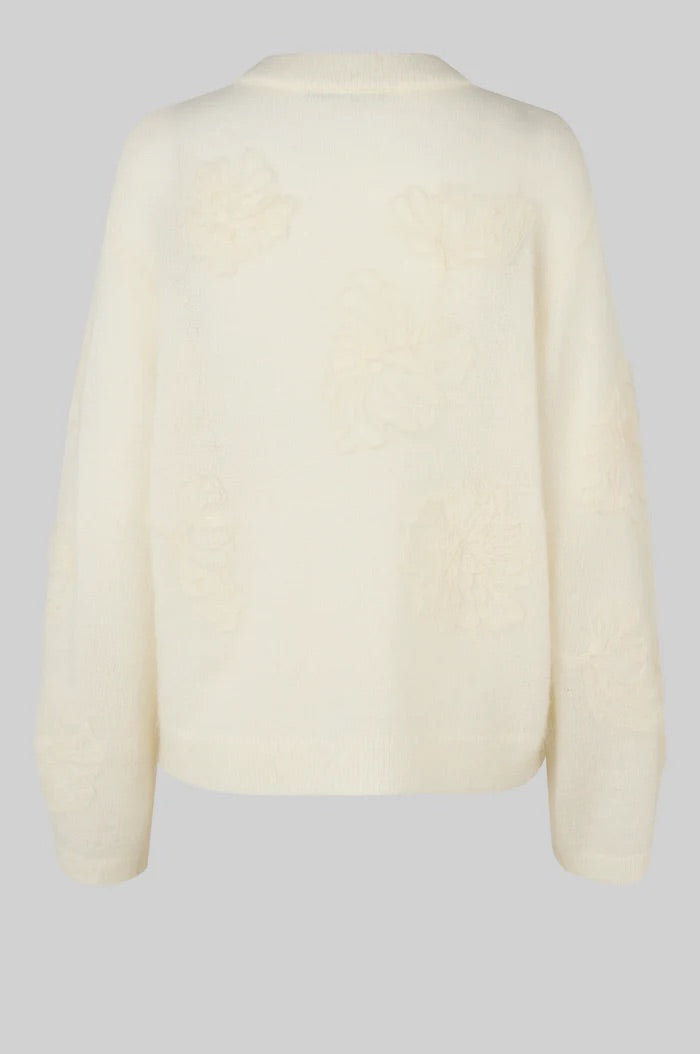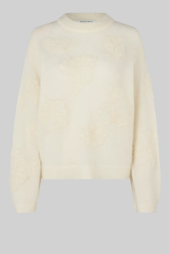 Strikkegenser fra Second Female med lekre 3D-blomster som gir et unikt og feminint uttrykk. Genseren er laget i en myk og stretchy mohairblanding, og har rund hals, droppede skuldre og lange, vide ermer. Ribbestrikket kant i hals, ermer og nederkant gir en pen finish, mens den avslappede passformen gjør den både komfortabel og enkel å style.