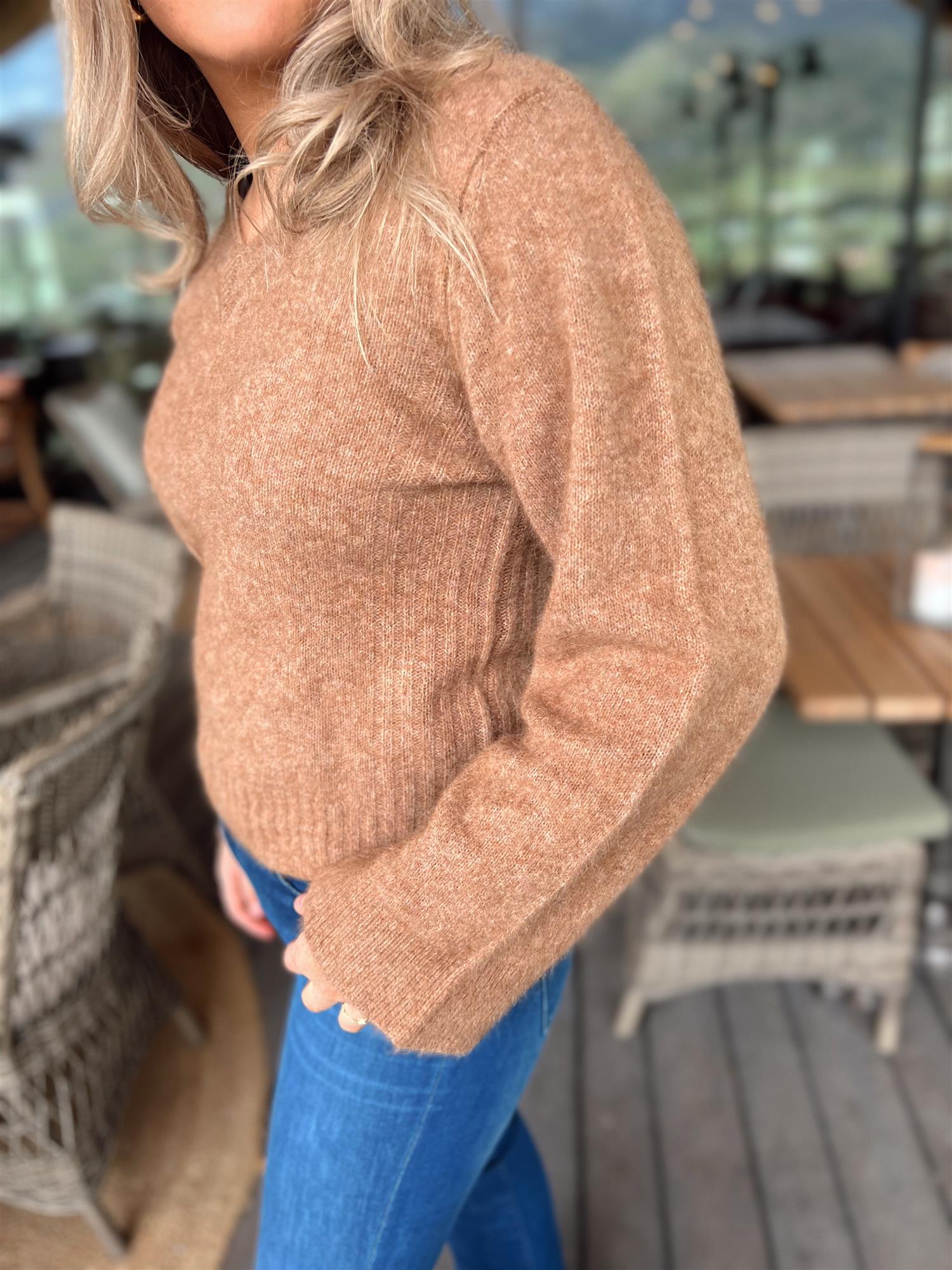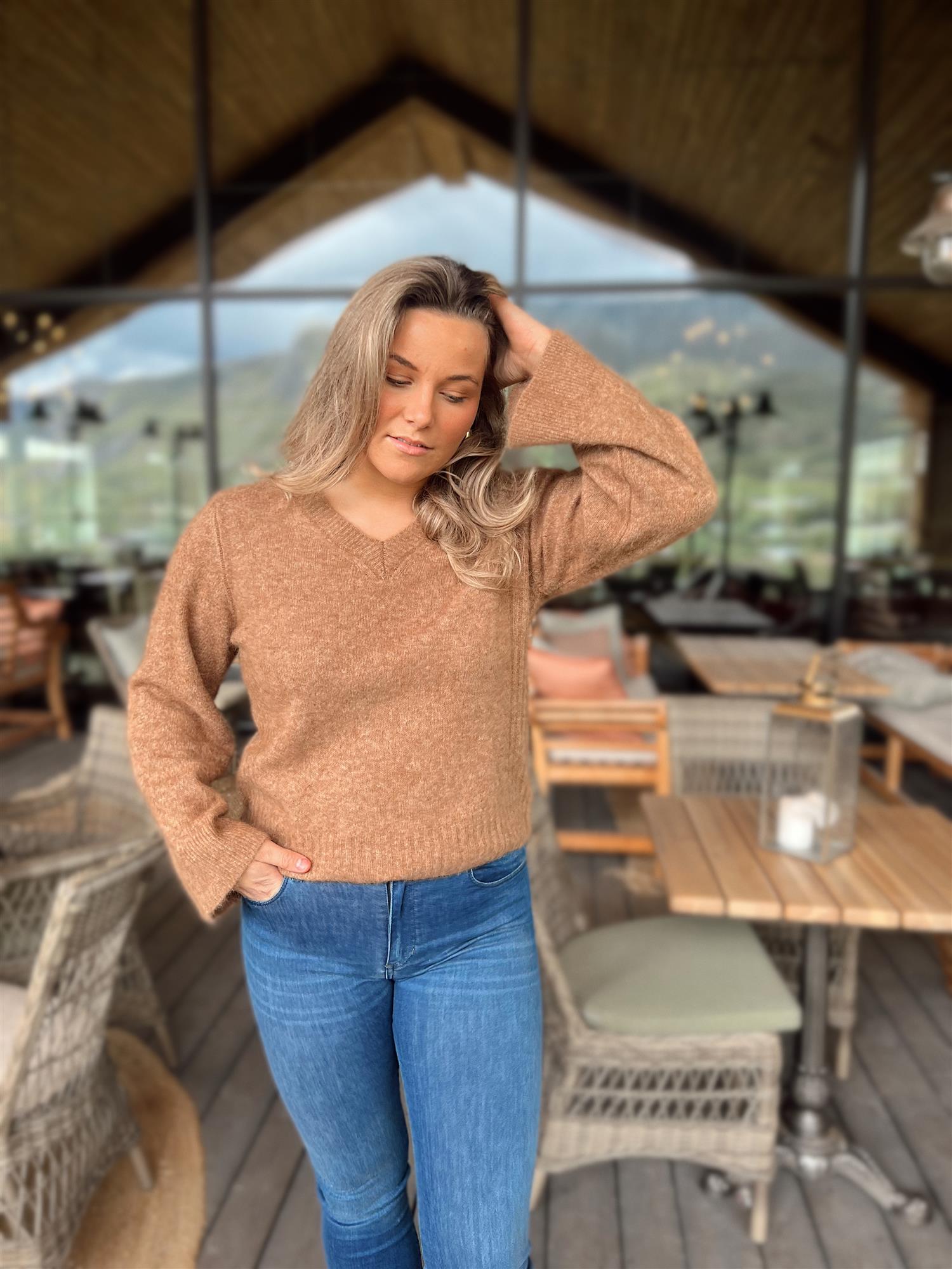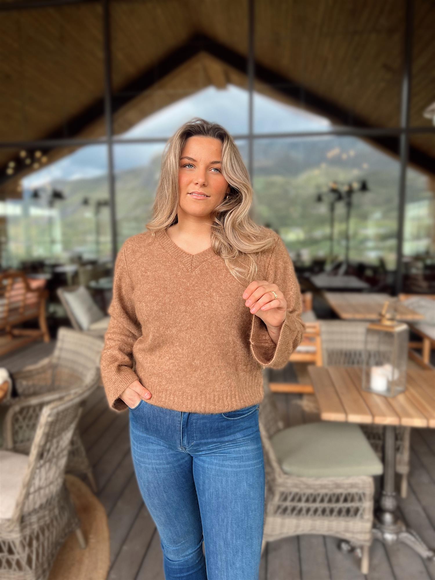Rioa er en elegant og komfortabel strikkegenser laget av 100% raccoon ull, kjent for sin myke og luksuriøse kvalitet. Genseren har en klassisk V-hals, lange ermer og en normal passform som gir en flatterende og tidløs silhuett. Den har fine ribbedetaljer ved halsen, ermene og kanten, samt et diskret ribbestrikket panel på sidene for ekstra struktur og stil. Perfekt for både hverdagsbruk og mer sofistikerte antrekk.