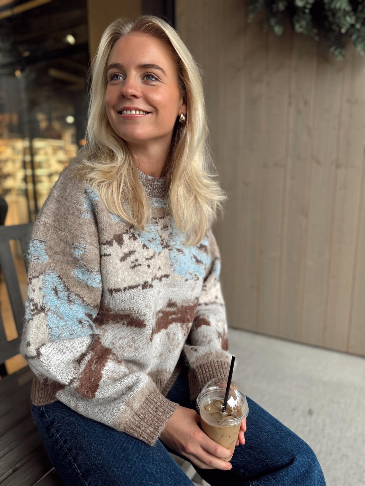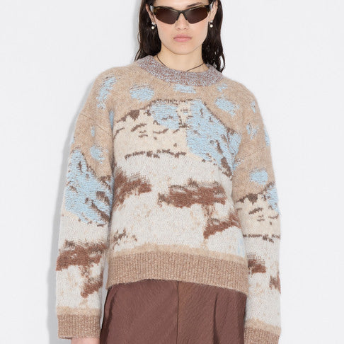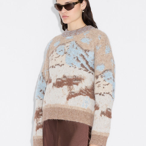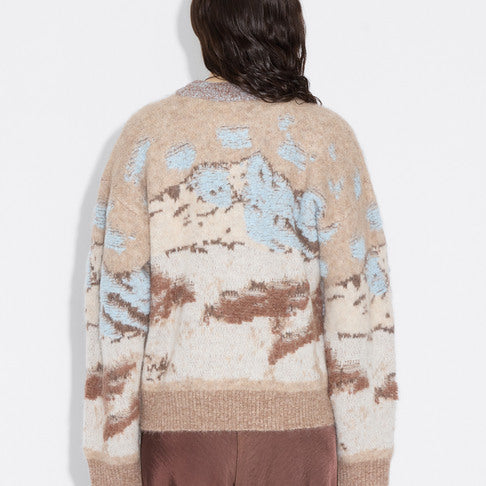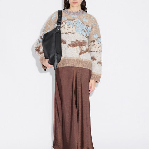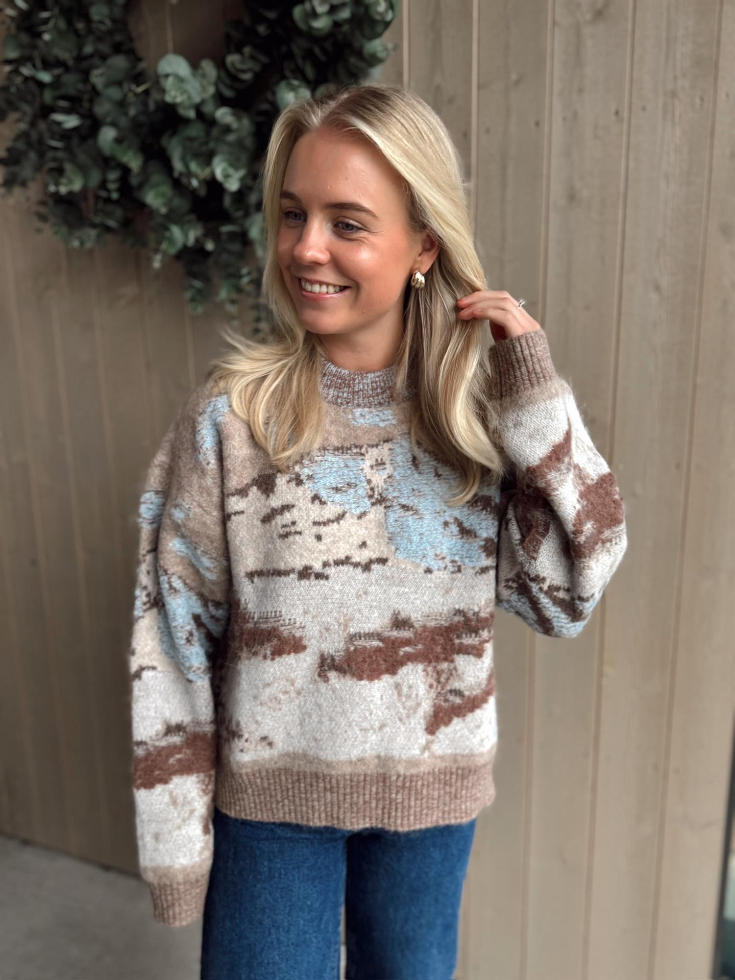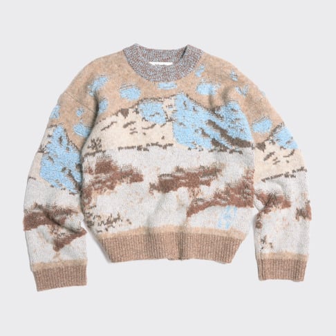 Alva Landscape-genseren er laget av en myk alpaka-blanding i jacquardstrikk som skildrer en snødekt fjelltopp. Den har en koselig oversized passform, rund hals og isolerende ribbestrikkede kanter, noe som gjør den perfekt for kalde dager.