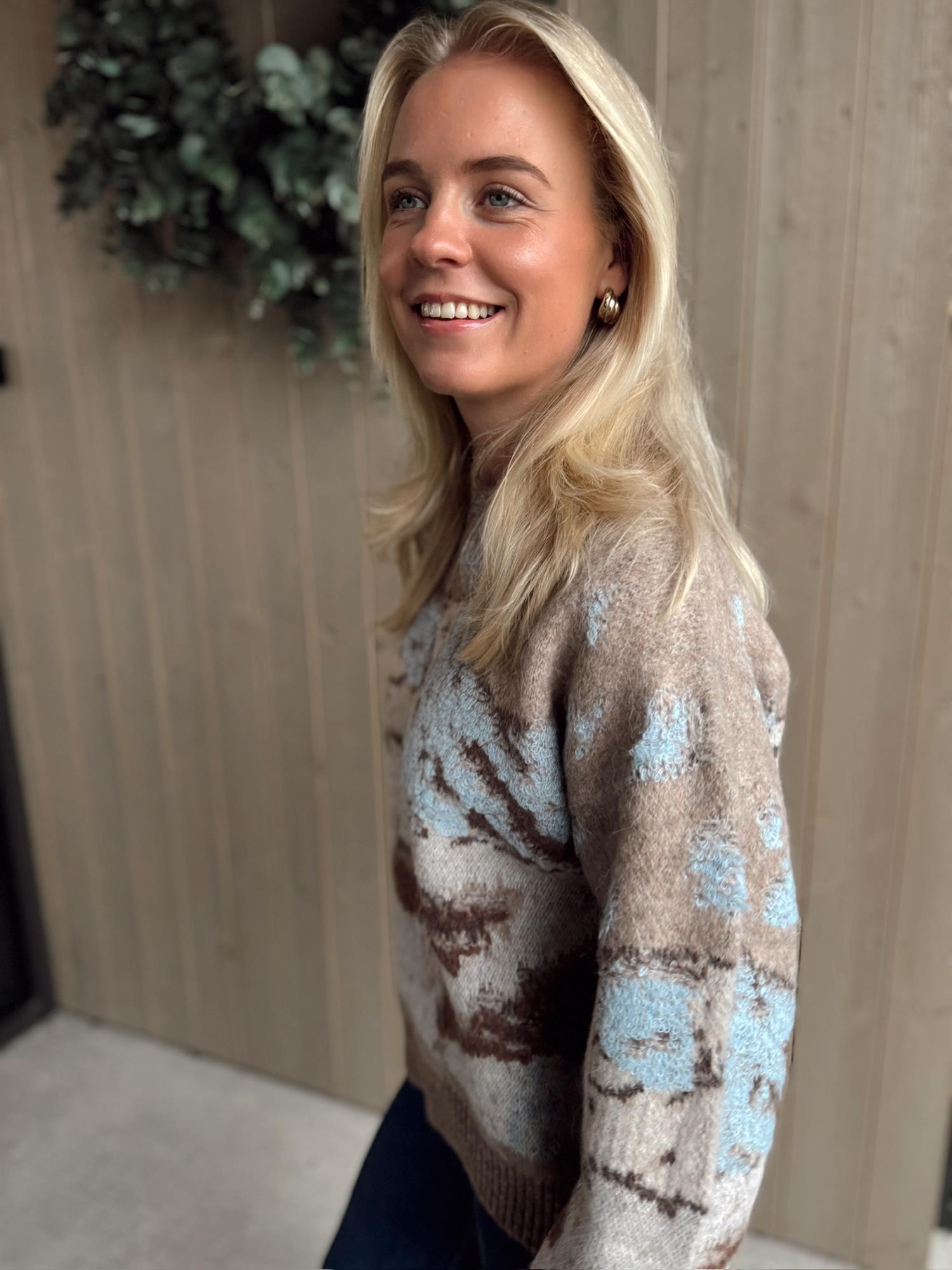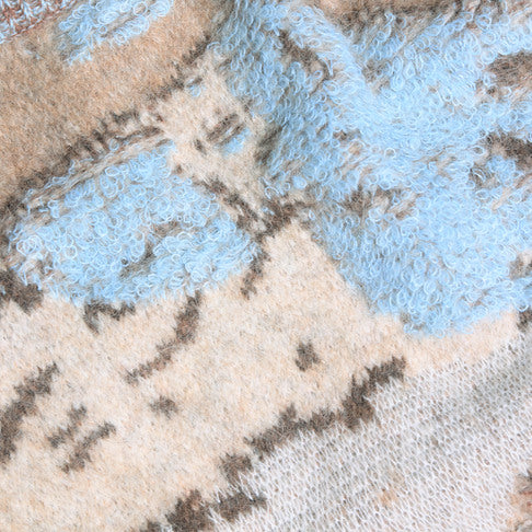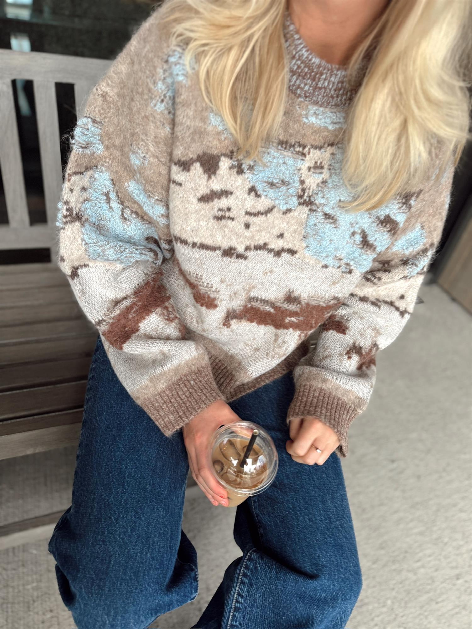 Alva Landscape-genseren er laget av en myk alpaka-blanding i jacquardstrikk som skildrer en snødekt fjelltopp. Den har en koselig oversized passform, rund hals og isolerende ribbestrikkede kanter, noe som gjør den perfekt for kalde dager.