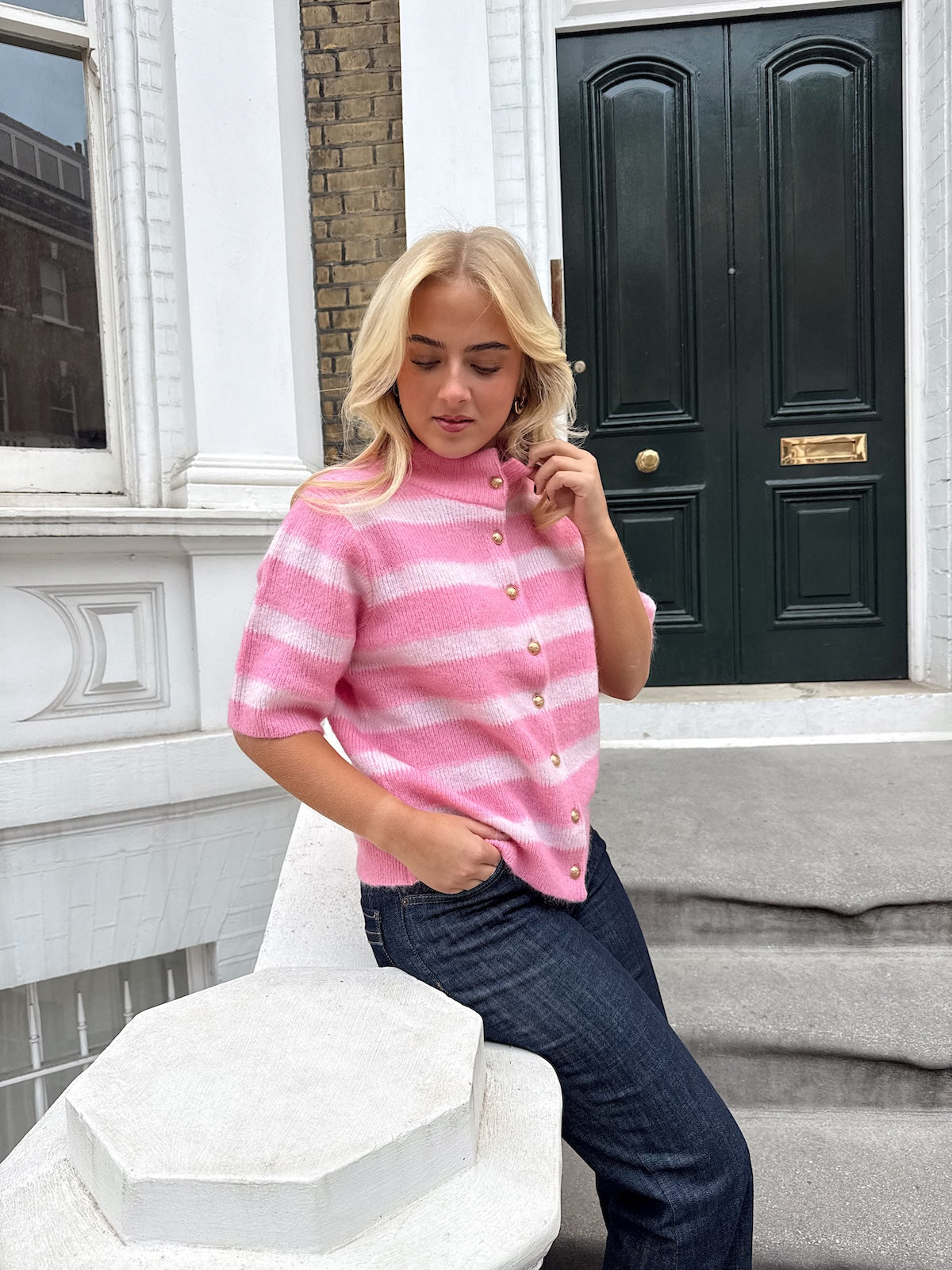 Denne stilrene kortermede cardiganen fra RAH Oslo kombinerer moderne design med luksuriøs komfort. Cardiganen har et klassisk snitt med korte ermer og en rad med elegante gullknapper som gir et sofistikert uttrykk. Det tidløse stripemønsteret i svart og hvitt gjør den enkel å style både til hverdag og mer formelle anledninger.
