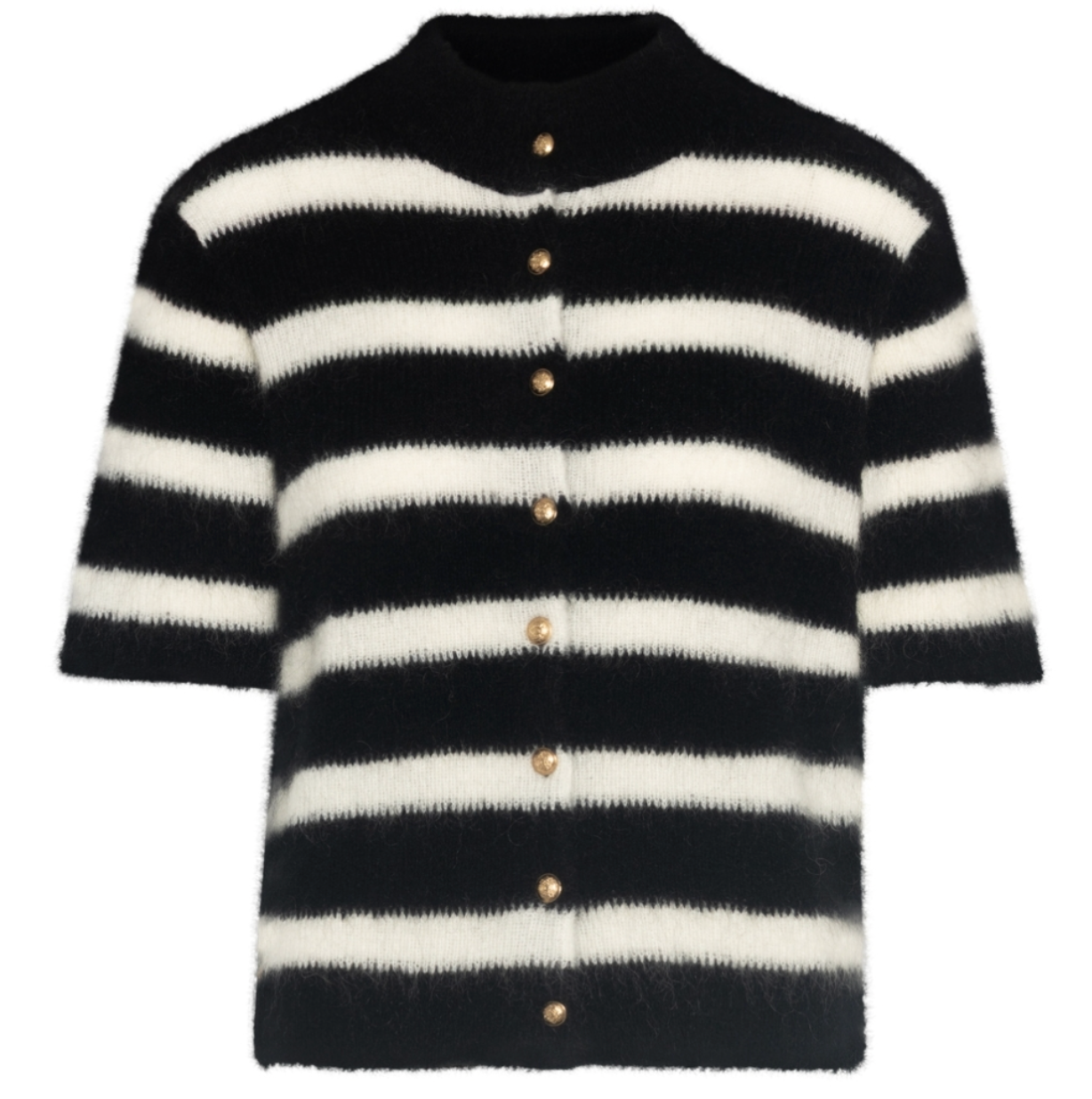 Denne stilrene kortermede cardiganen fra RAH Oslo kombinerer moderne design med luksuriøs komfort. Cardiganen har et klassisk snitt med korte ermer og en rad med elegante gullknapper som gir et sofistikert uttrykk. Det tidløse stripemønsteret i svart og hvitt gjør den enkel å style både til hverdag og mer formelle anledninger.