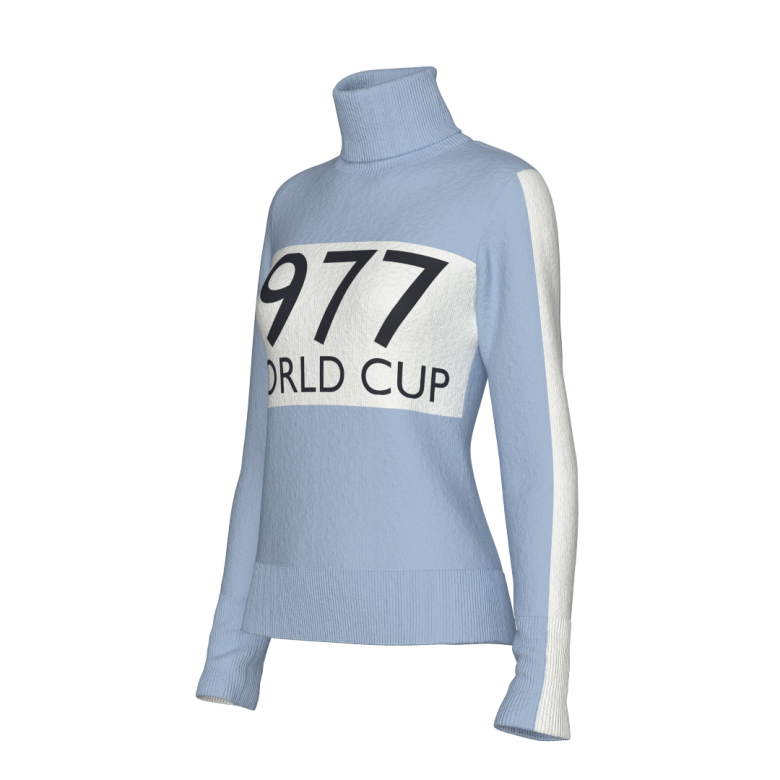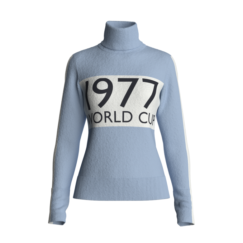 1977 Sweater fra We Norwegians hyller den legendariske verdenscupen i Voss, der den svenske skilegenden Ingemar Stenmark tok sitt første gull etter flere forsøk.