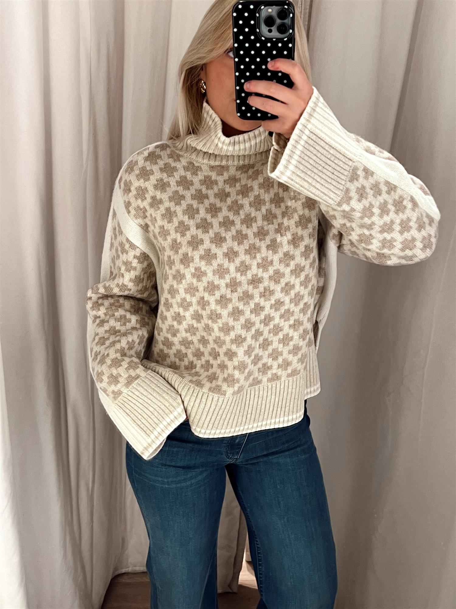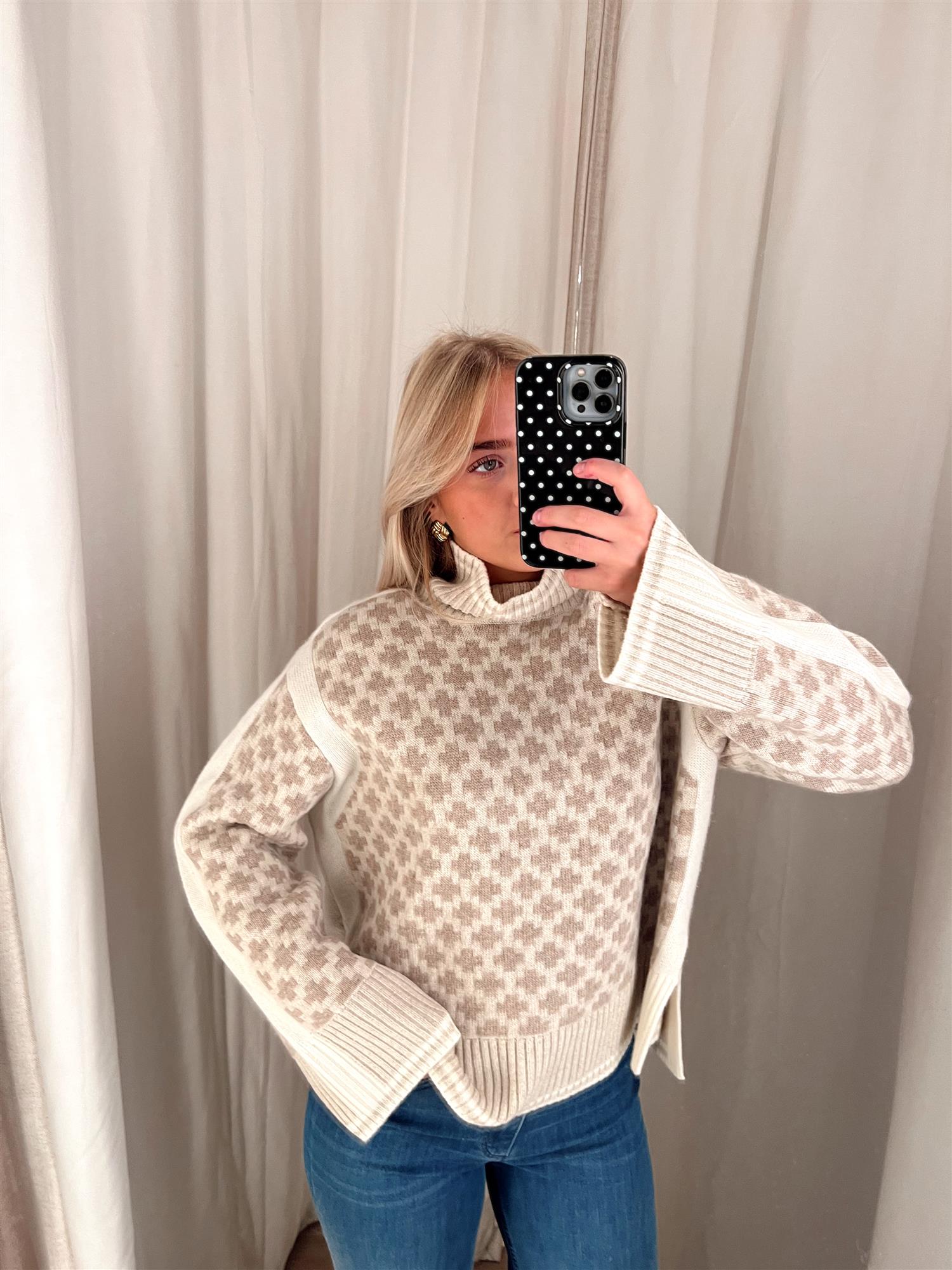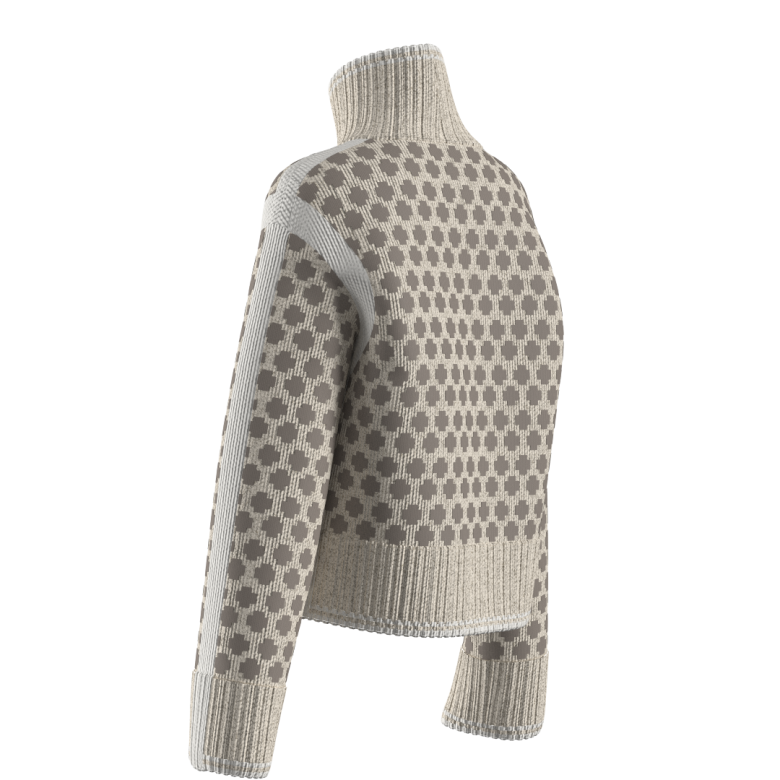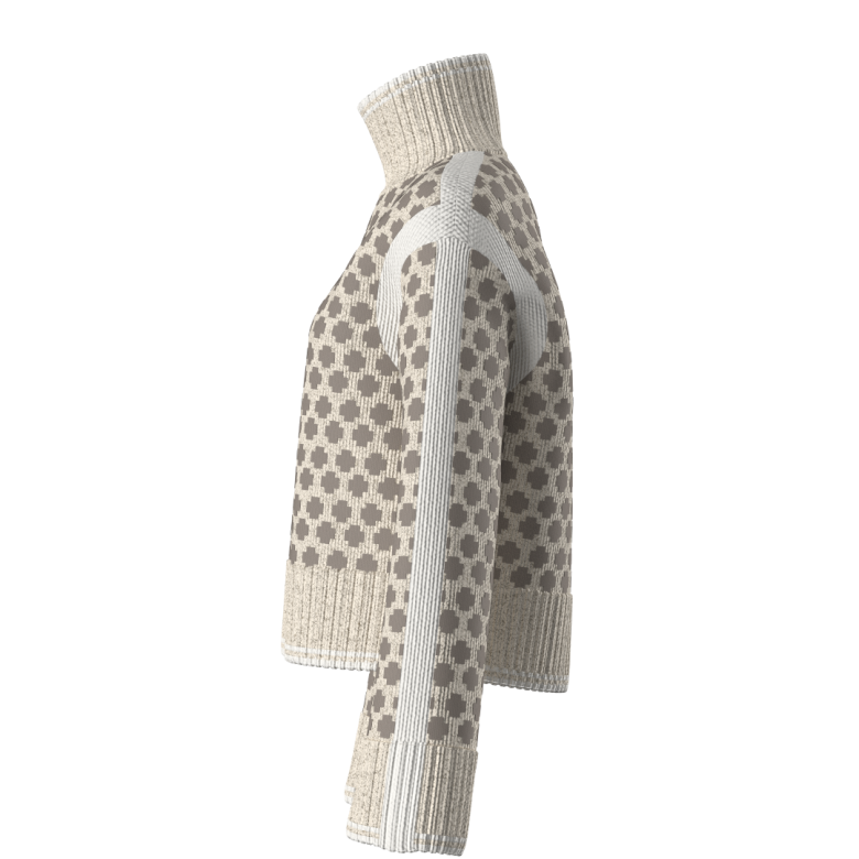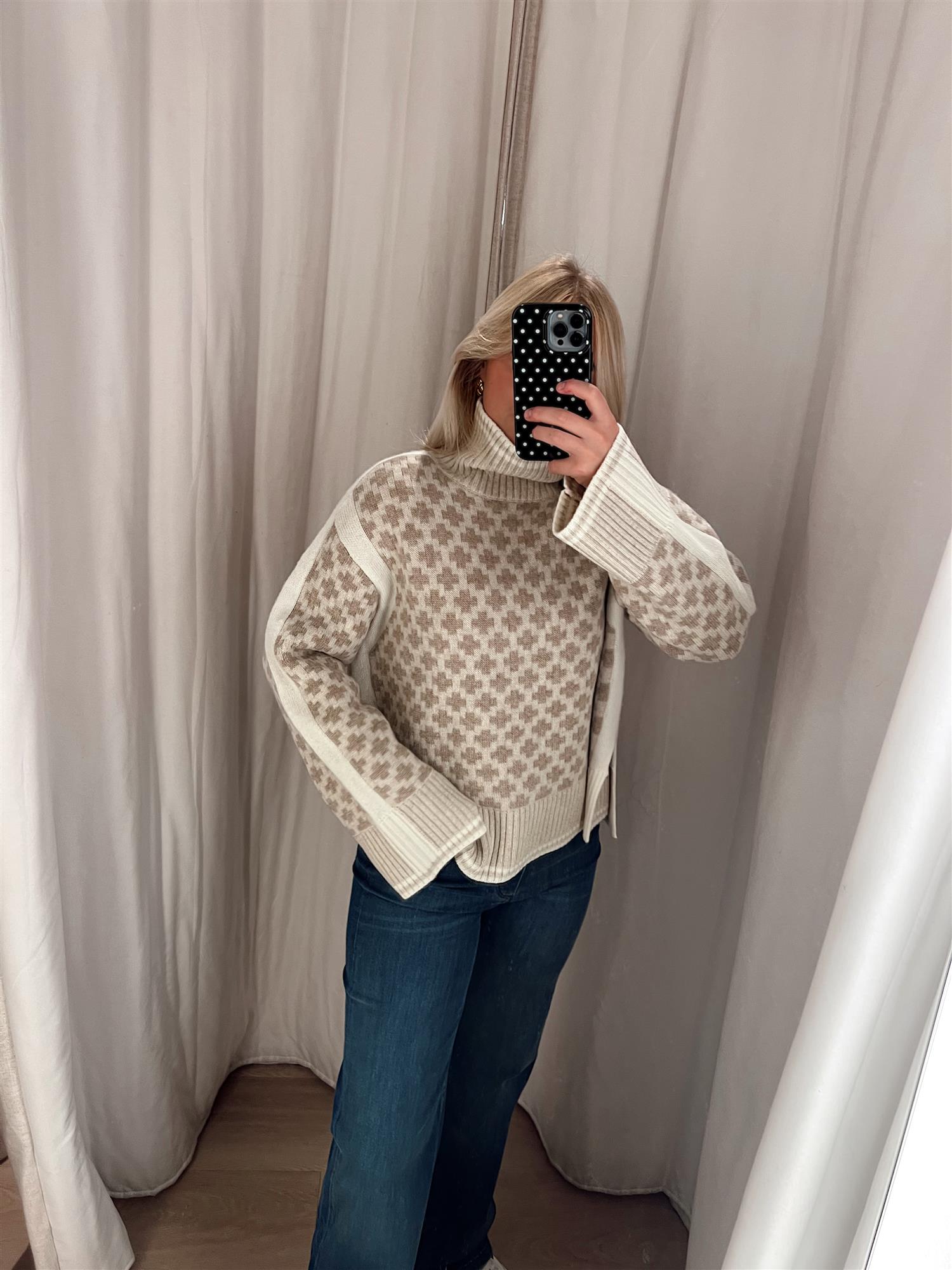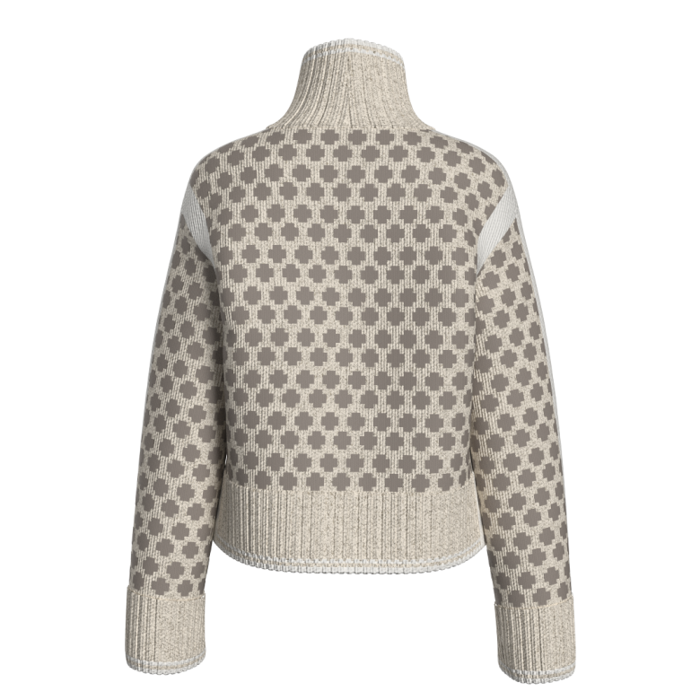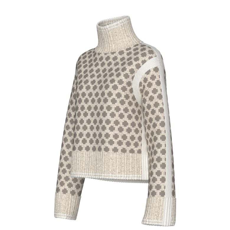 Den har en oversized passform, dekorative kontrastpaneler, ribbestrikket høy hals og vide ermer som gir et moderne og avslappet uttrykk. Små splitter i sidene gir ekstra bevegelighet og en flatterende silhuett. Perfekt som lag-på-lag-plagg gjennom høst og vinter.