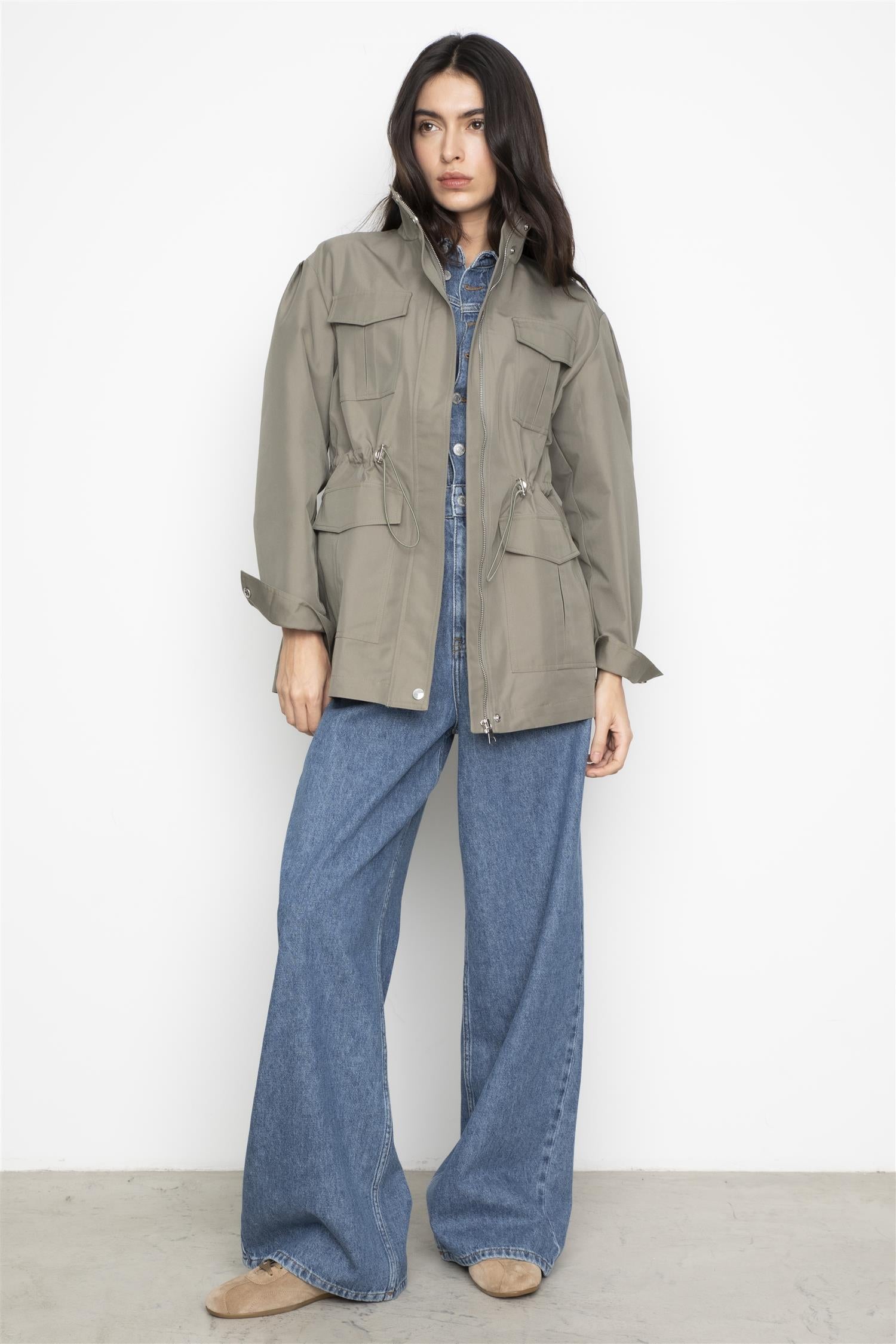 Trendy jakke i tidløs grønnfarge. Jakken har høy krage med trykknapper, skjult glidelås og praktiske lommer. Jakken har en justerbar midje for tilpasset passform. Perfekte jakken for et stilrent og funksjonelt uttrykk.