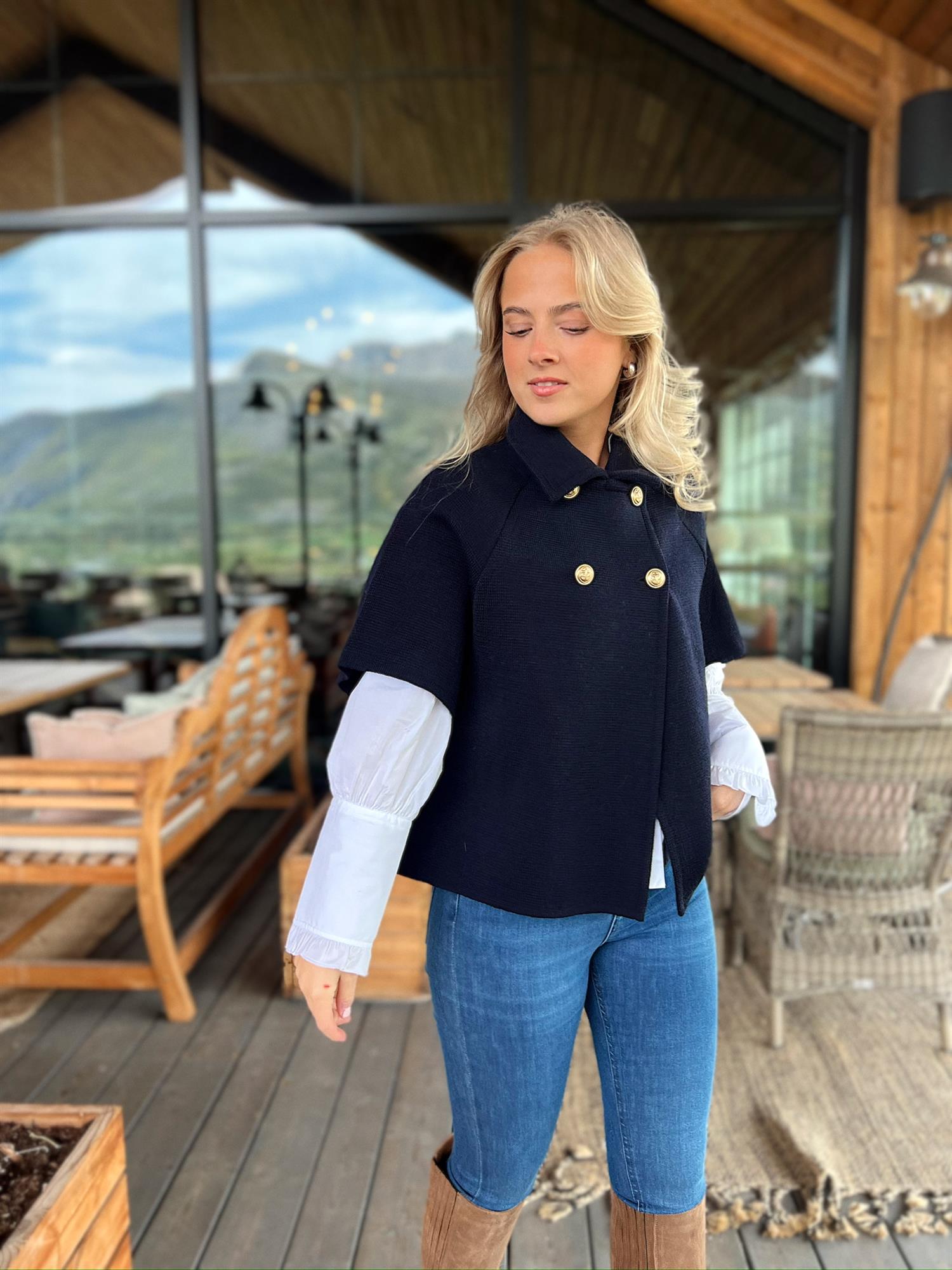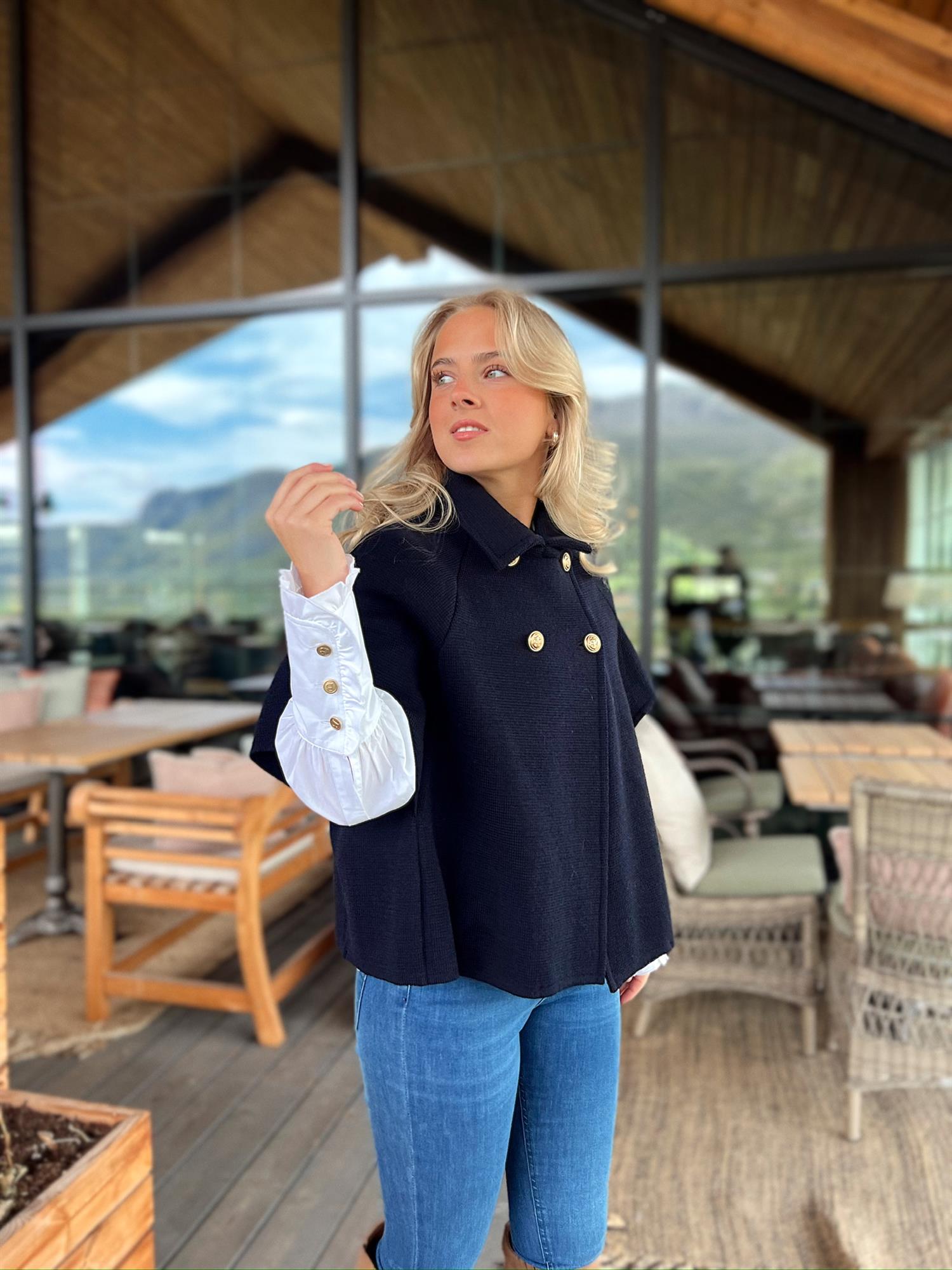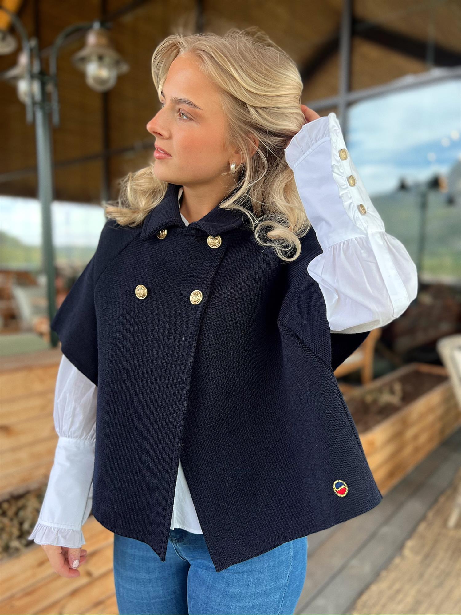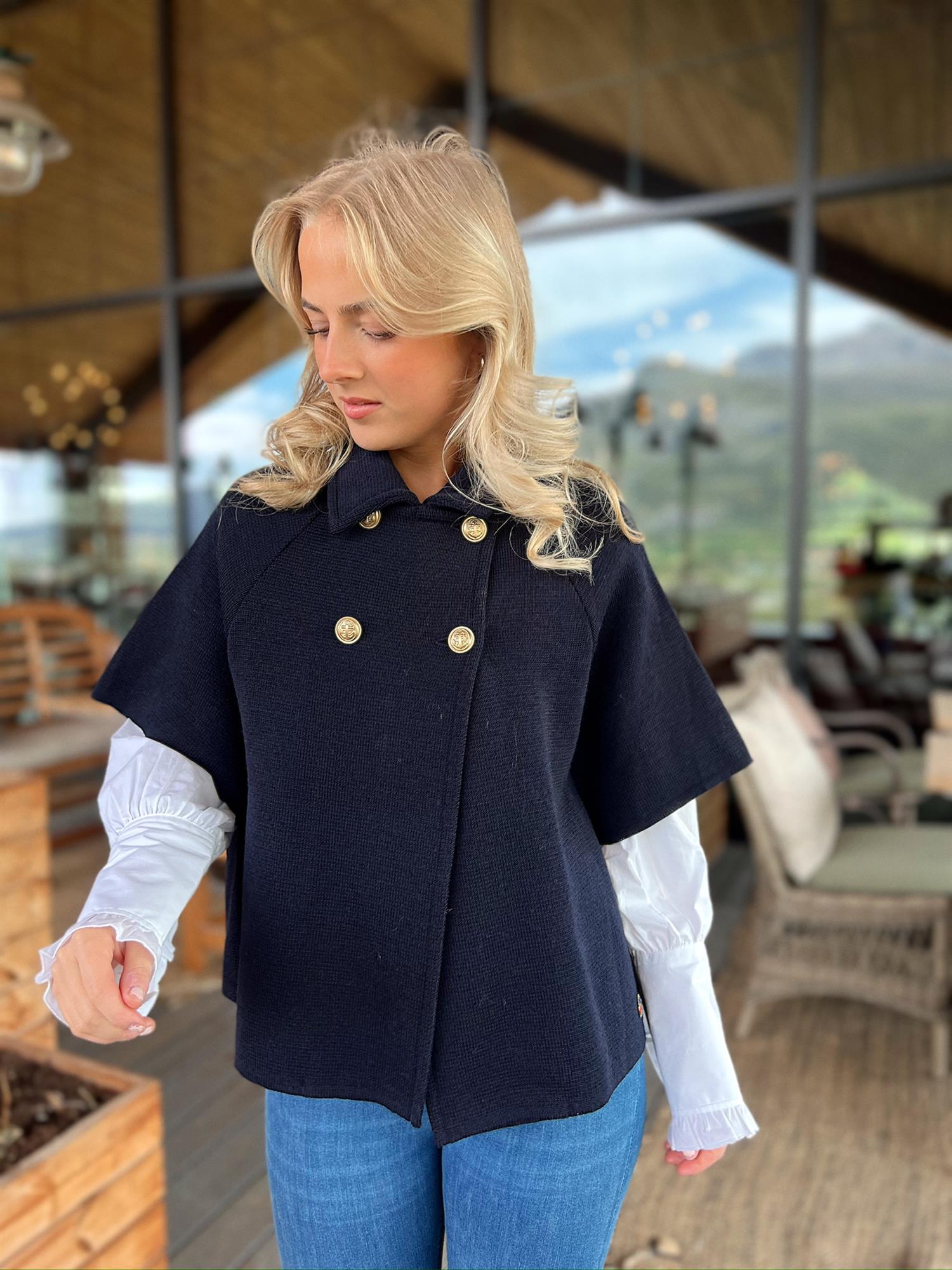 Gertrude Cape er et elegant plagg som kan brukes både ute og inne. Capen har en dobbelspent design med fire gullfargede ankerknapper, og passer til alle anledninger. Den er enkel å kombinere med garderoben din og gir et velkledd og sofistikert uttrykk.