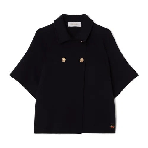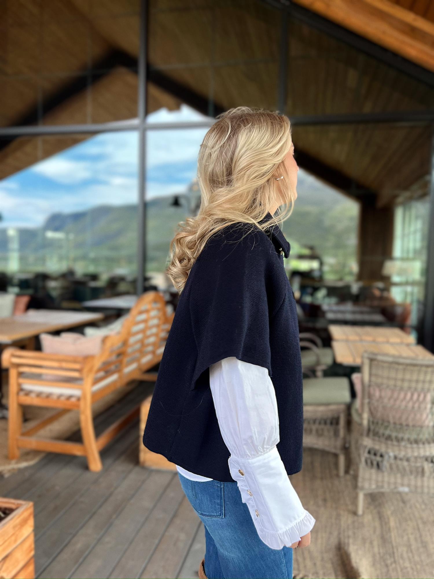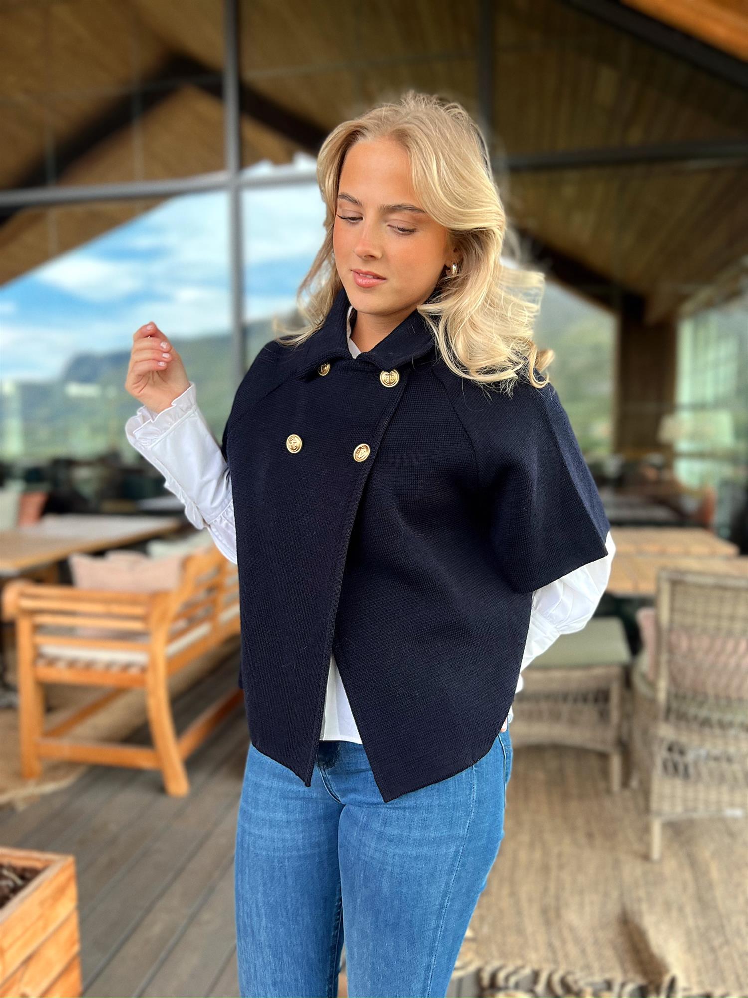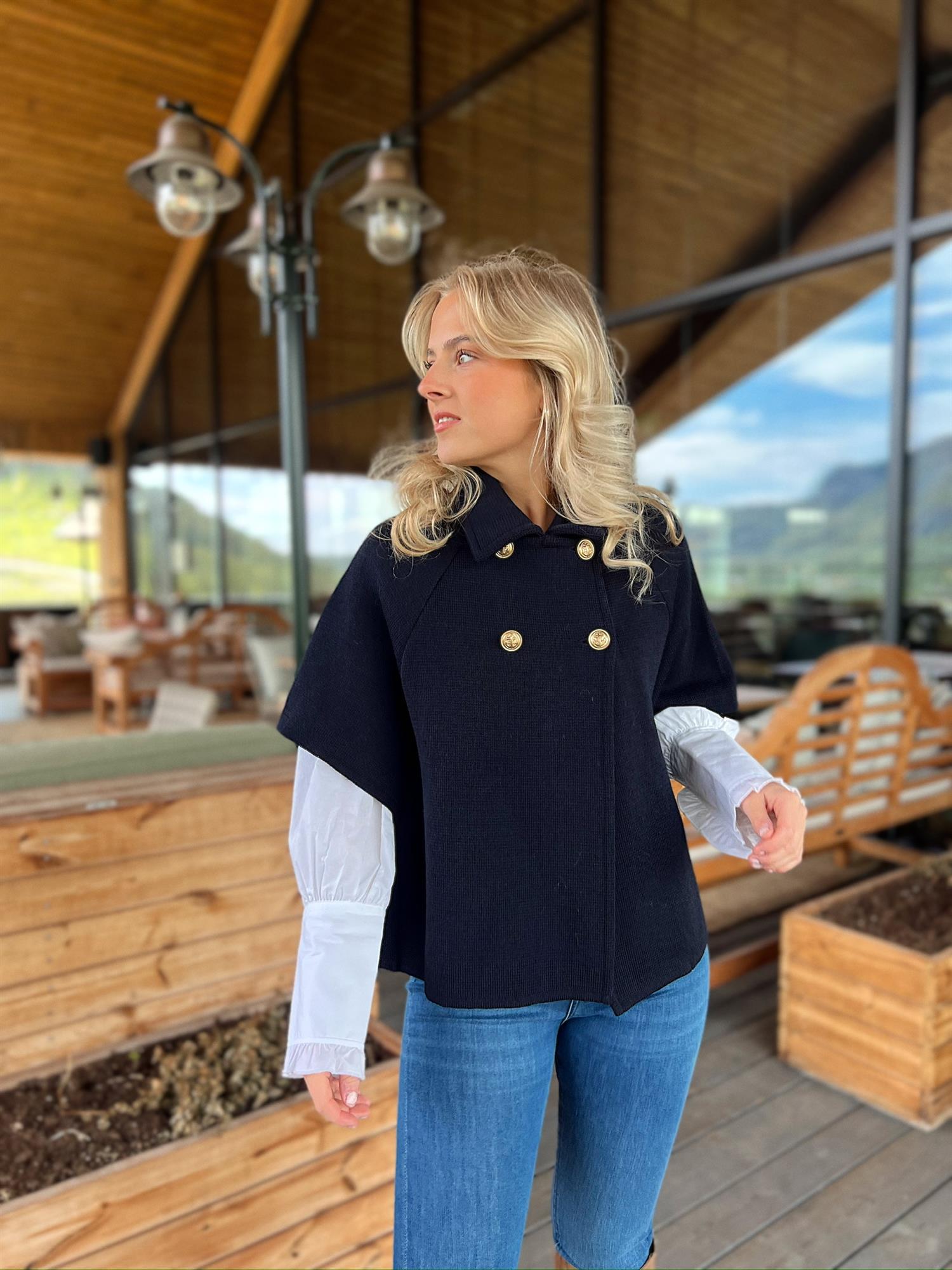 Gertrude Cape er et elegant plagg som kan brukes både ute og inne. Capen har en dobbelspent design med fire gullfargede ankerknapper, og passer til alle anledninger. Den er enkel å kombinere med garderoben din og gir et velkledd og sofistikert uttrykk.