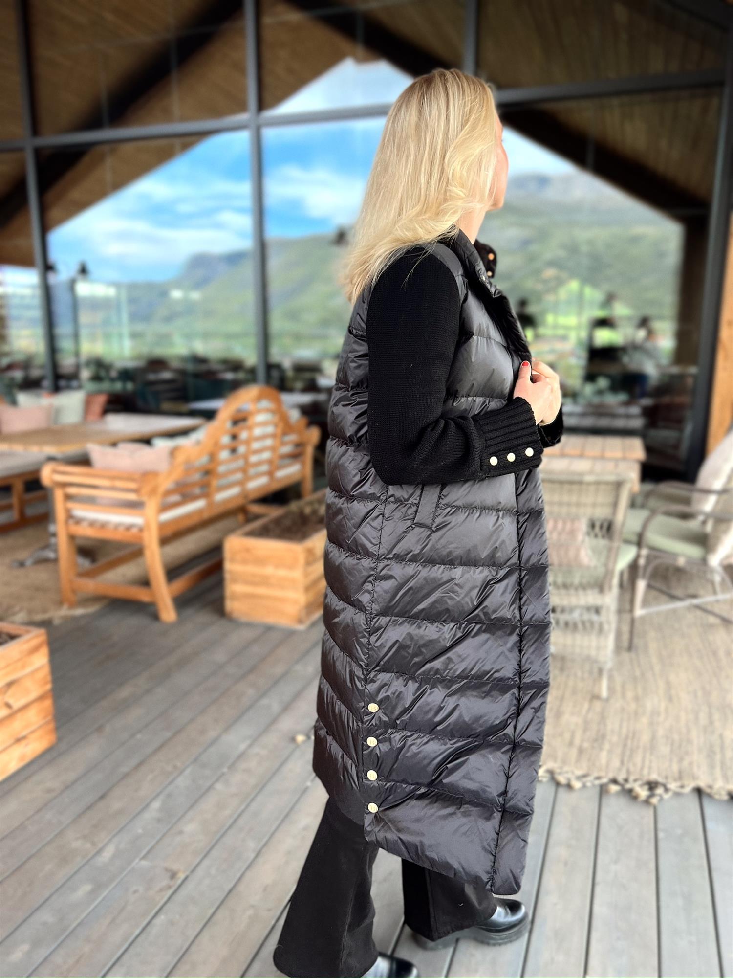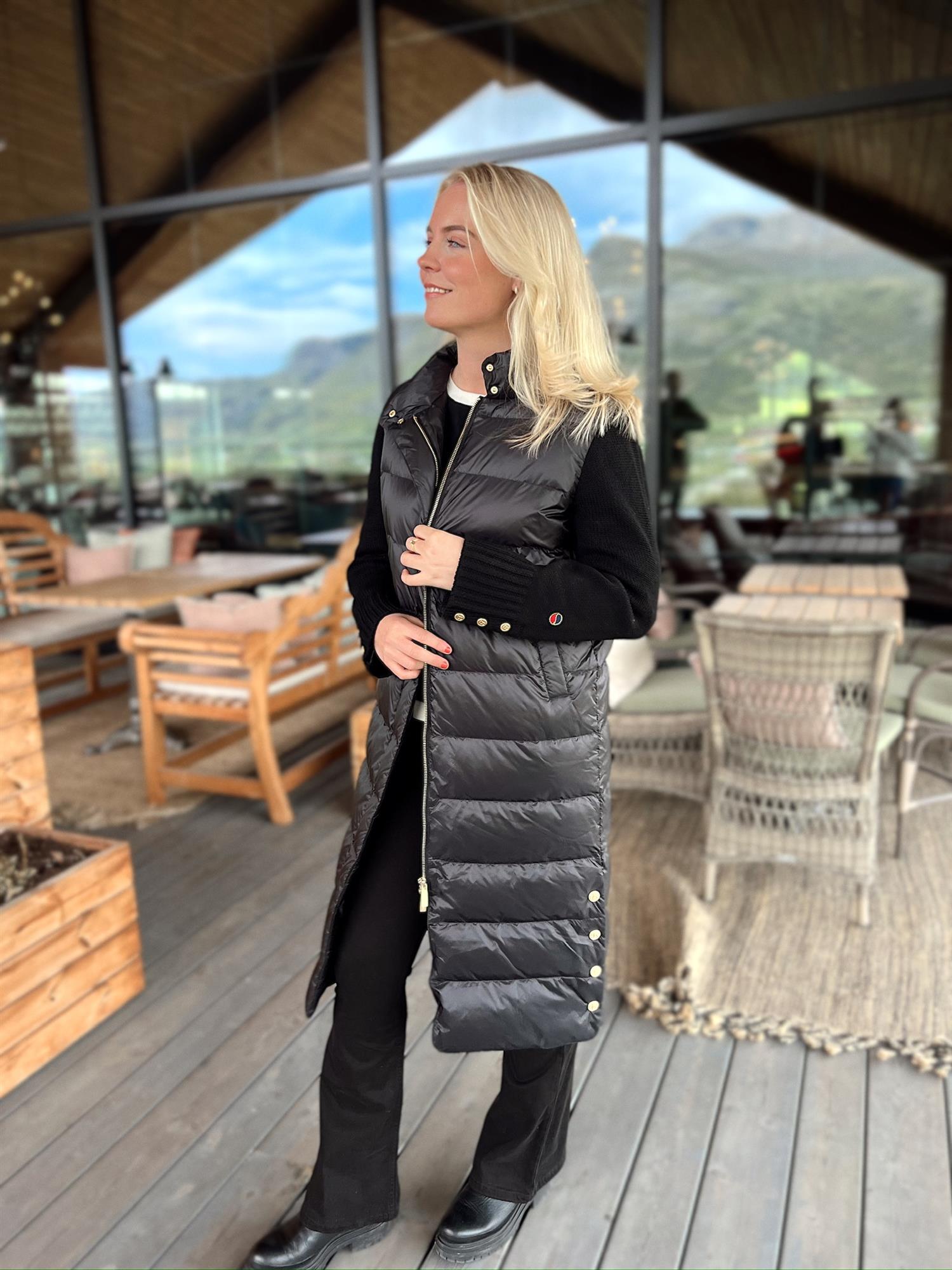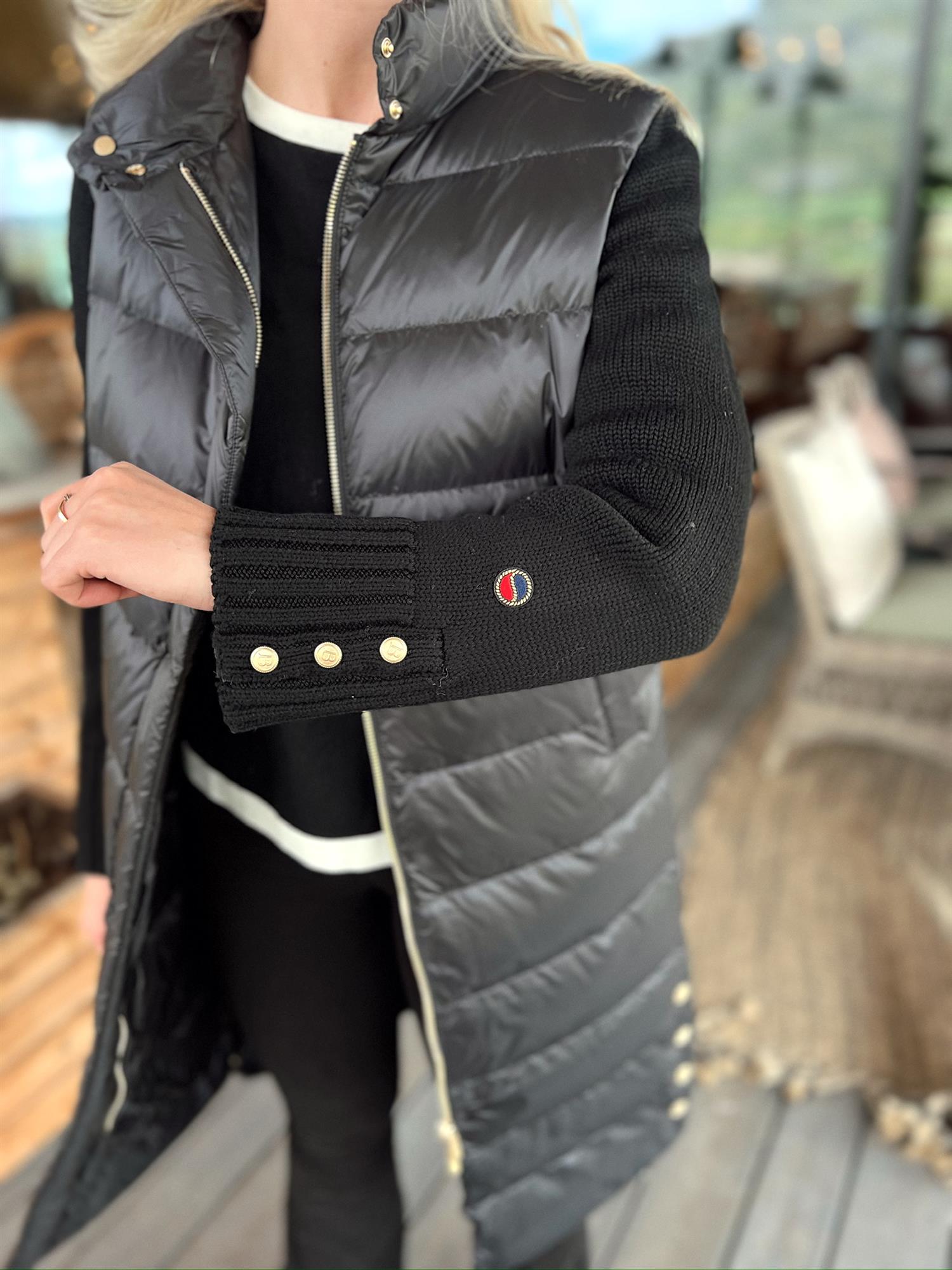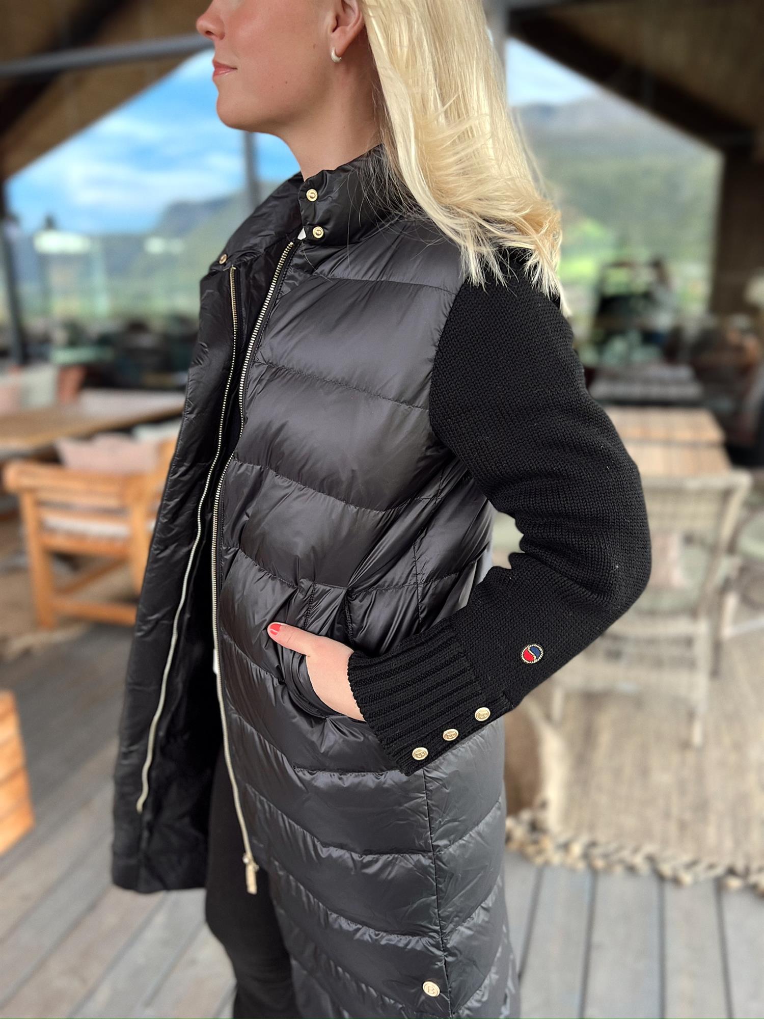 Celia Down Coat fra Busnel er en elegant og funksjonell jakke med luksuriøse detaljer. Den har en quiltet, vattert front i vannavstøtende materiale kombinert med strikkede ermer i ull, som gir både varme, komfort og bevegelsesfrihet. Gullknapper langs sidene og ermene tilfører et sofistikert preg, mens den høye kragen og midi-lengden gjør jakken perfekt for kjølige dager.