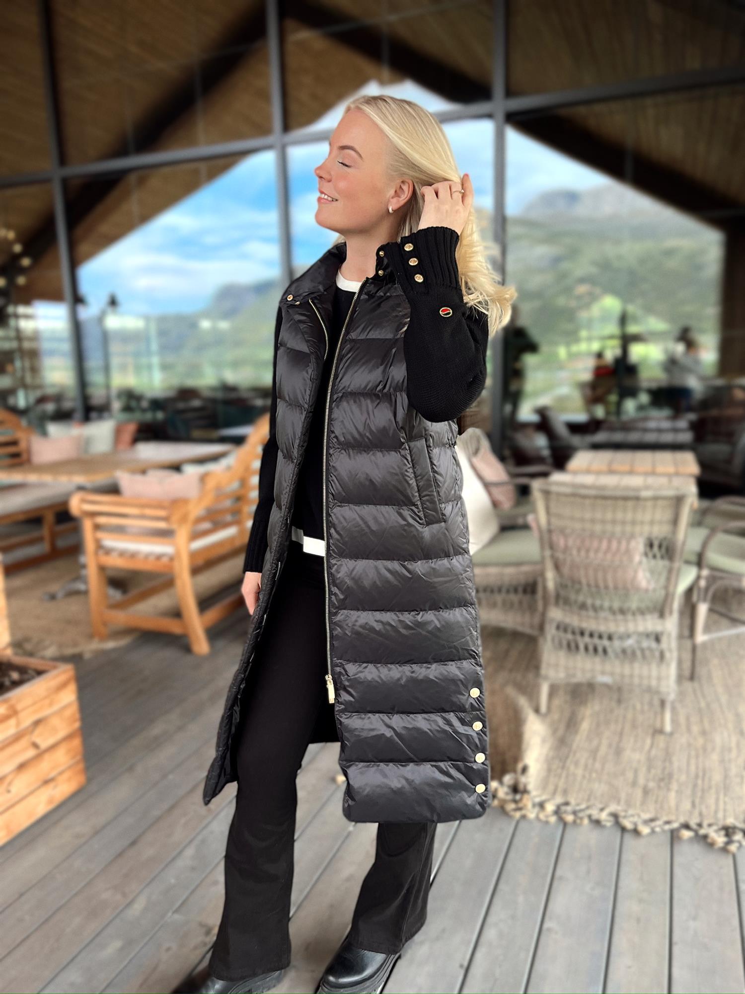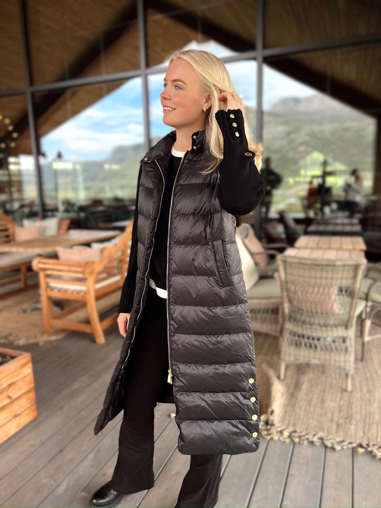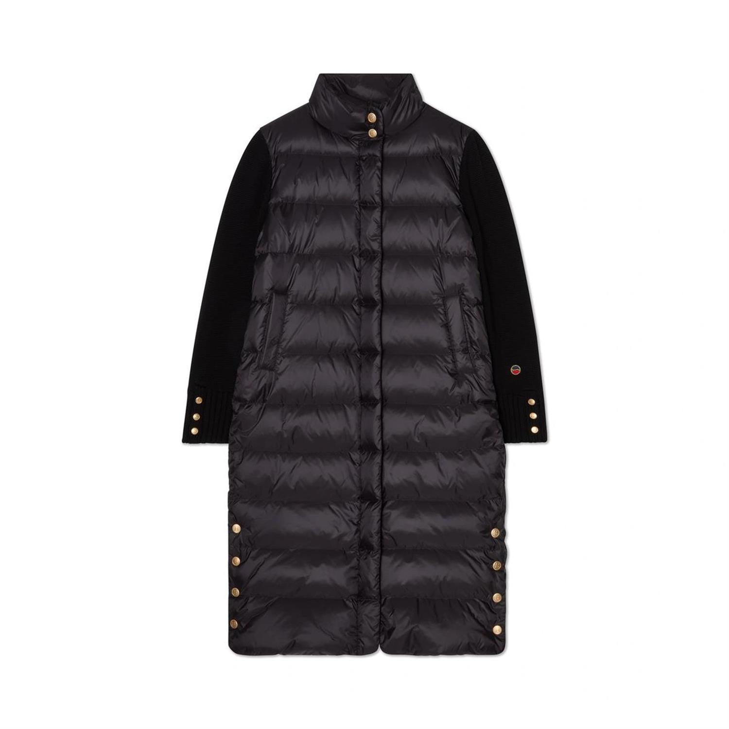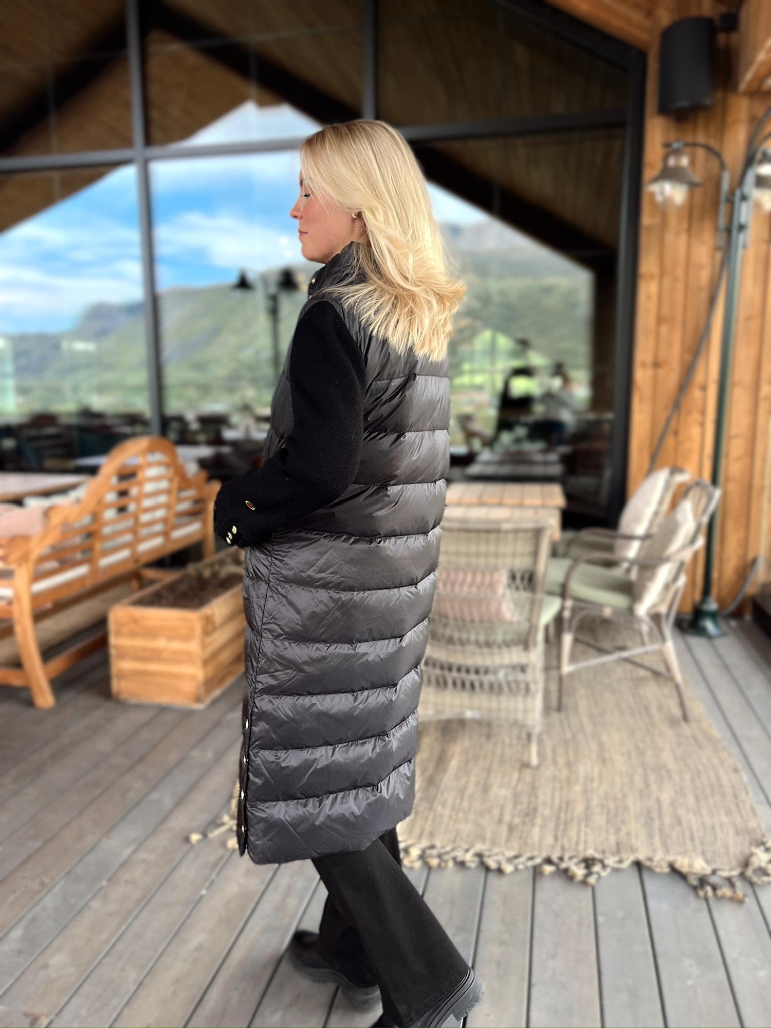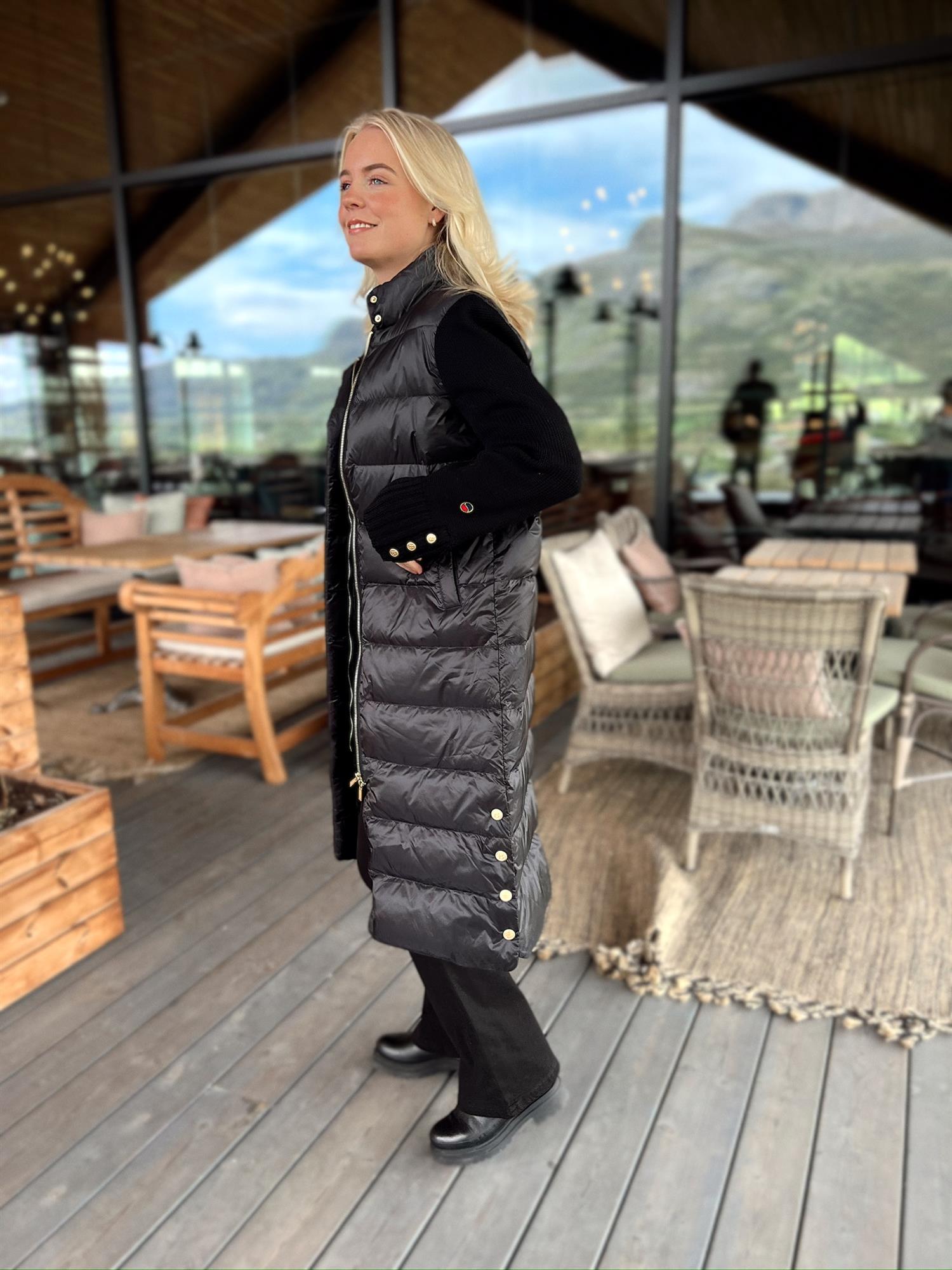 Celia Down Coat fra Busnel er en elegant og funksjonell jakke med luksuriøse detaljer. Den har en quiltet, vattert front i vannavstøtende materiale kombinert med strikkede ermer i ull, som gir både varme, komfort og bevegelsesfrihet. Gullknapper langs sidene og ermene tilfører et sofistikert preg, mens den høye kragen og midi-lengden gjør jakken perfekt for kjølige dager.