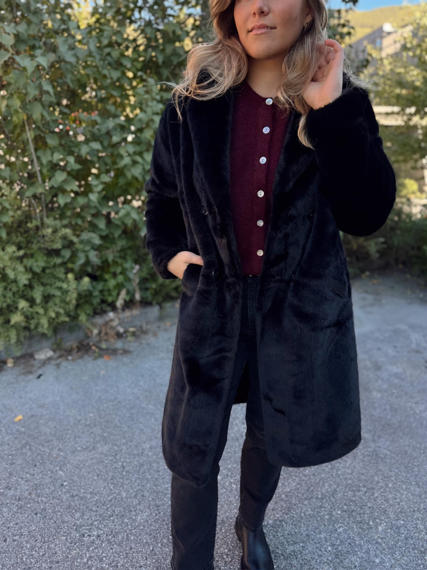 Jakken kan brukes begge veier for to forskjellige uttrykk – én side med fluffy fuskepels og én side med en mer minimalistisk og sofistikert overflate. Den har en normal passform, lukkes med knapper i front og har diskré sidelommer.