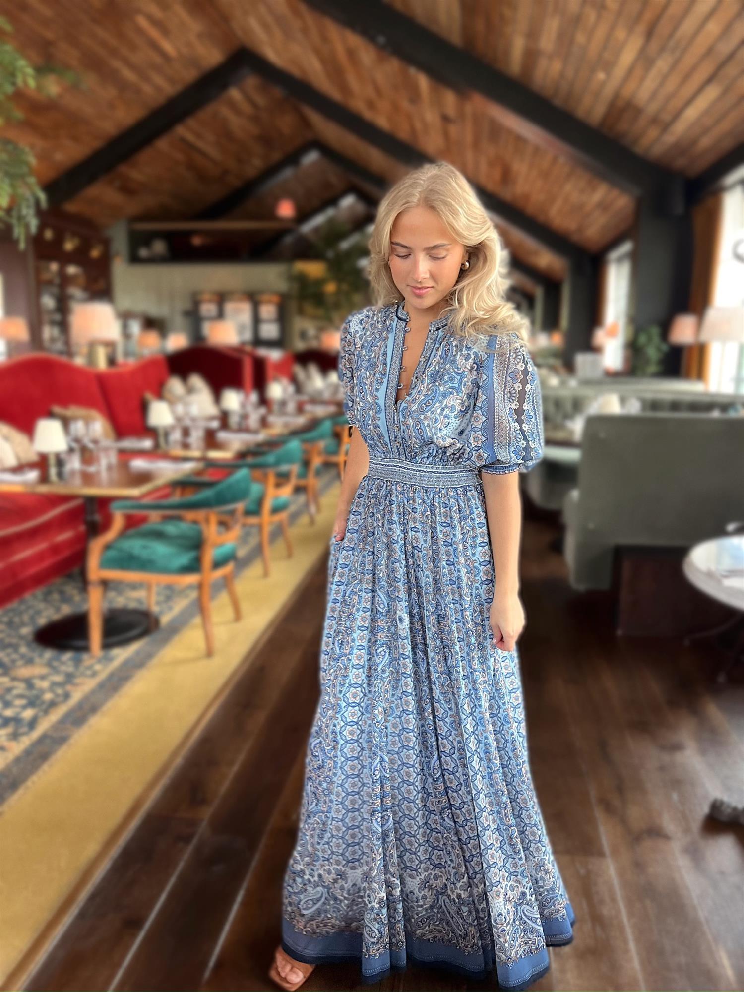 Romantisk maxikjole i lett, vasket chiffon med vakkert fall. Kjolen har dekorative knapper i front, smocket krage og smale ermer som ender like over albuen med smockdetalj ved mansjetten. Den elastiske smockingen i midjen gir en feminin silhuett, mens det panelerte, voluminøse skjørtet og sidelommer gir både bevegelse og funksjonalitet. Lengde: ca. 145 cm fra skulder til nederkant (57” HPS).