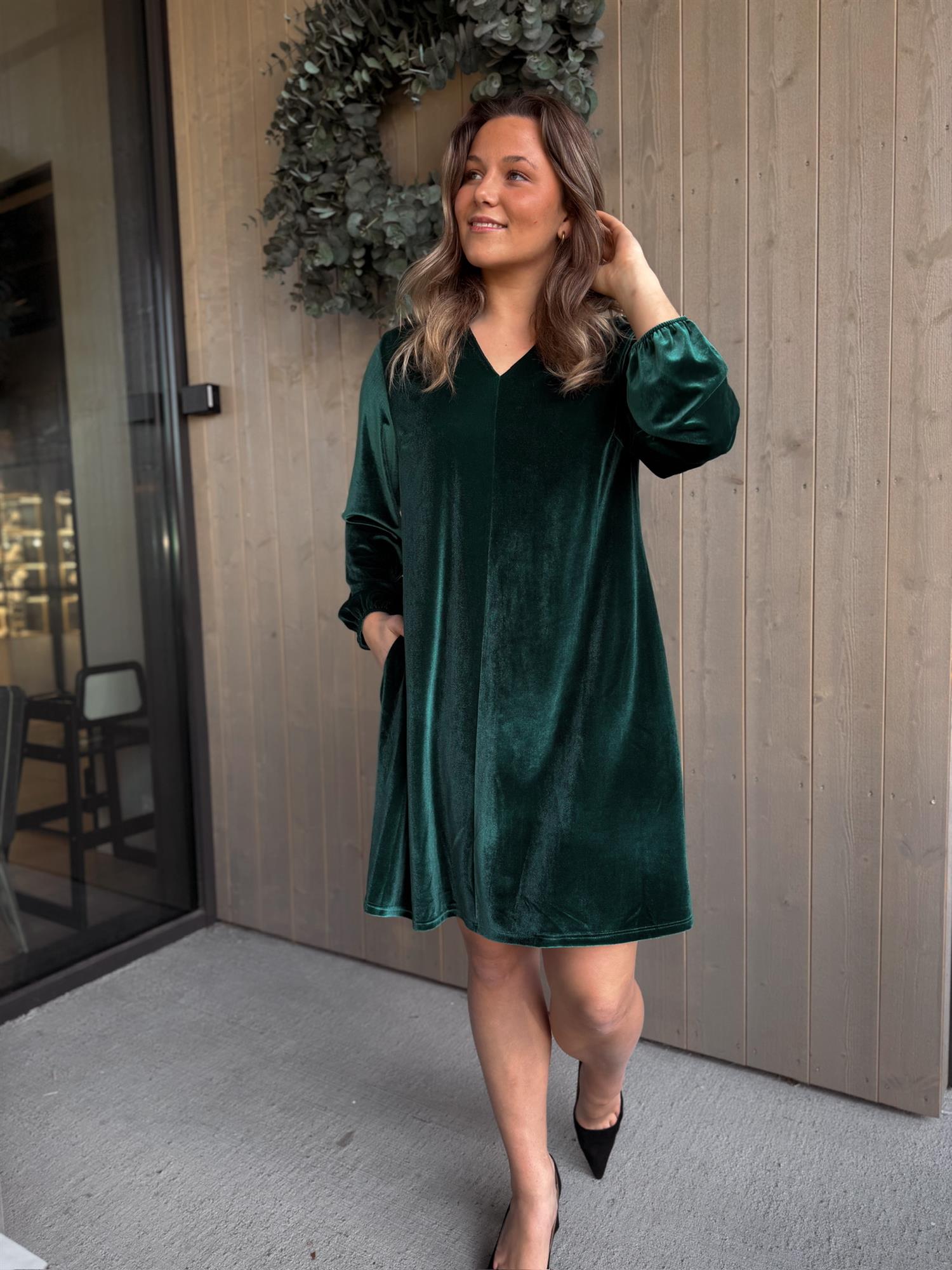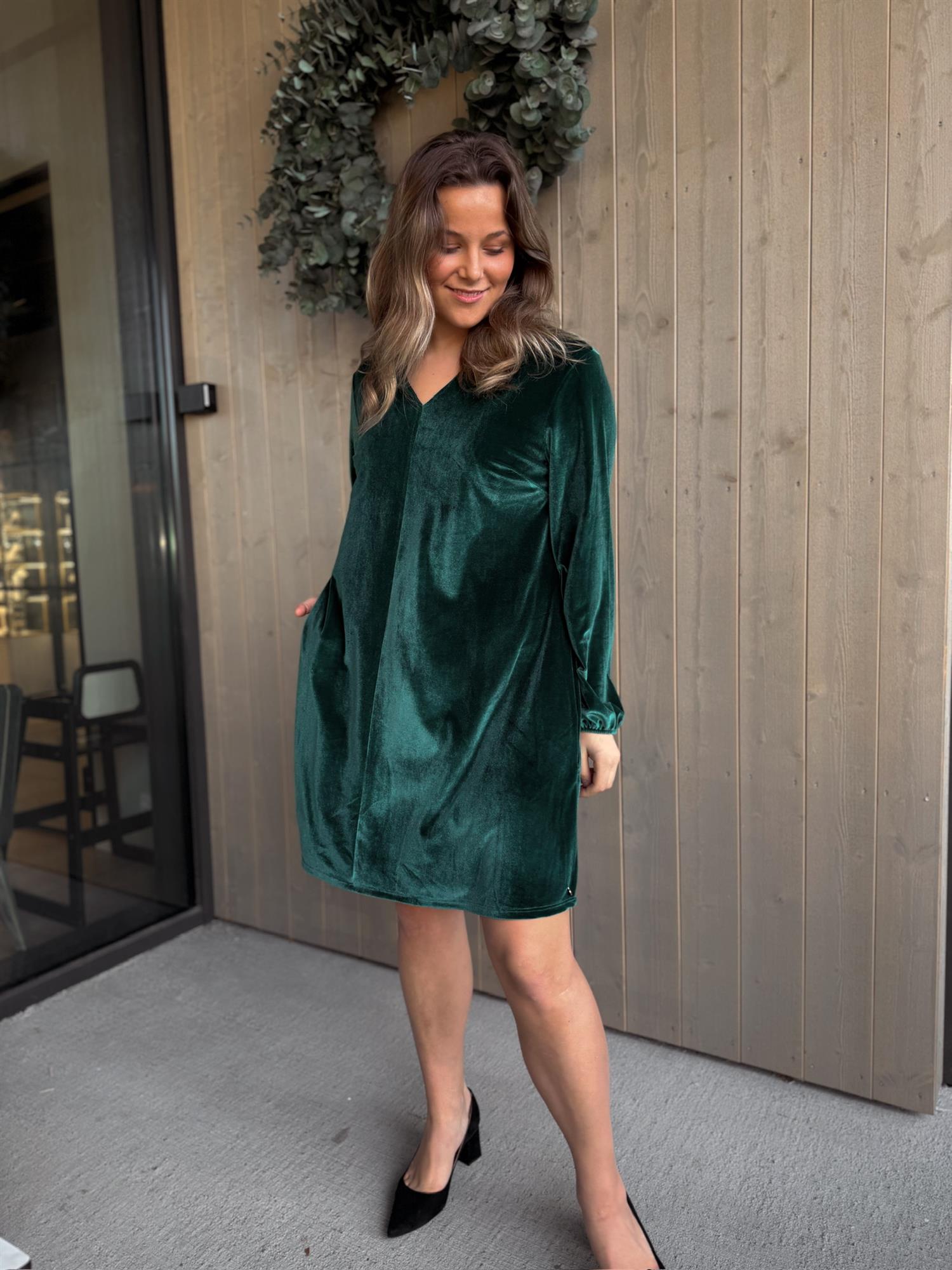 stretchy velourstoff som føles behagelig mot huden og gir en flatterende fasong. Den har en enkel A-shape silhuett med v-hals og praktiske lommer i sidene – en kombinasjon av komfort og stil.