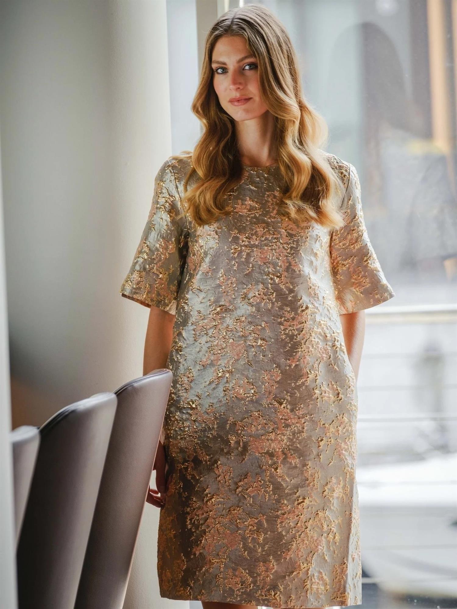 Leonora Dress fra Ane Mone er en vakker og feminin kjole som utstråler eleganse. Den glitrende teksturen i en myk miks av polyester og metallic gir kjolen et eksklusivt uttrykk – perfekt til festlige anledninger. Kjolen har en flatterende passform og et delikat snitt som fremhever silhuetten.