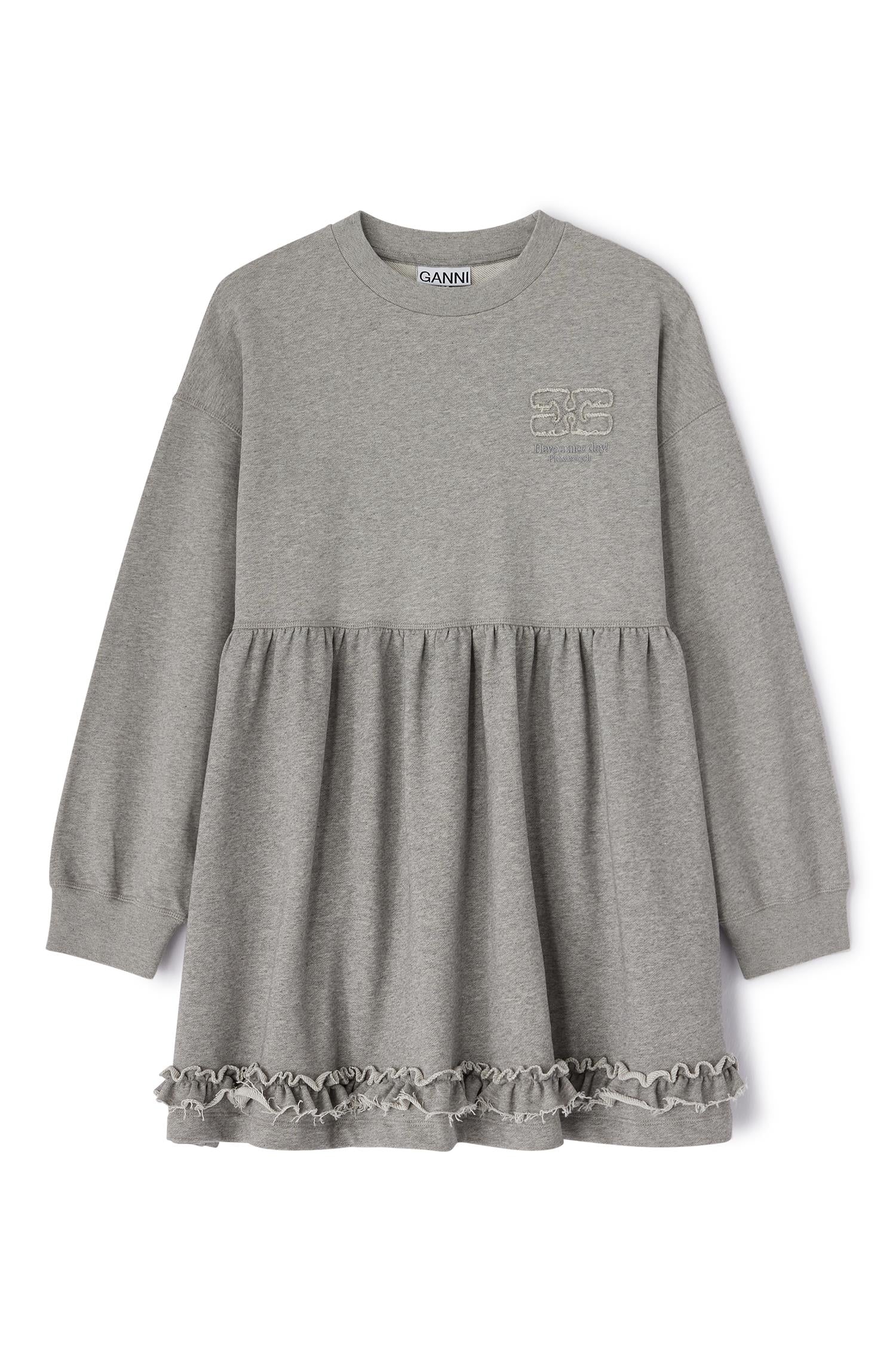 Kjolen har en klassisk crewneck-ringning og lange ermer med myke mansjetter. Midjen er markert med en lett innsving før den faller ut i et voluminøst peplum-skjørt som gir en flatterende silhuett og et leken, avslappet uttrykk. Nederst er skjørtet pyntet med subtile rysjedetaljer som tilfører et delikat, GANNI-typisk preg. På brystet finner du et diskret brodert GANNI-logoemblem for en sporty finish.